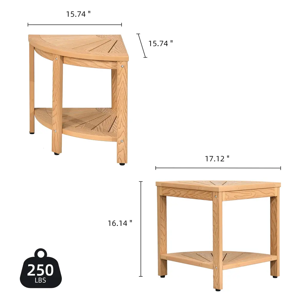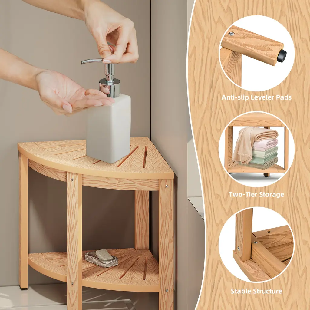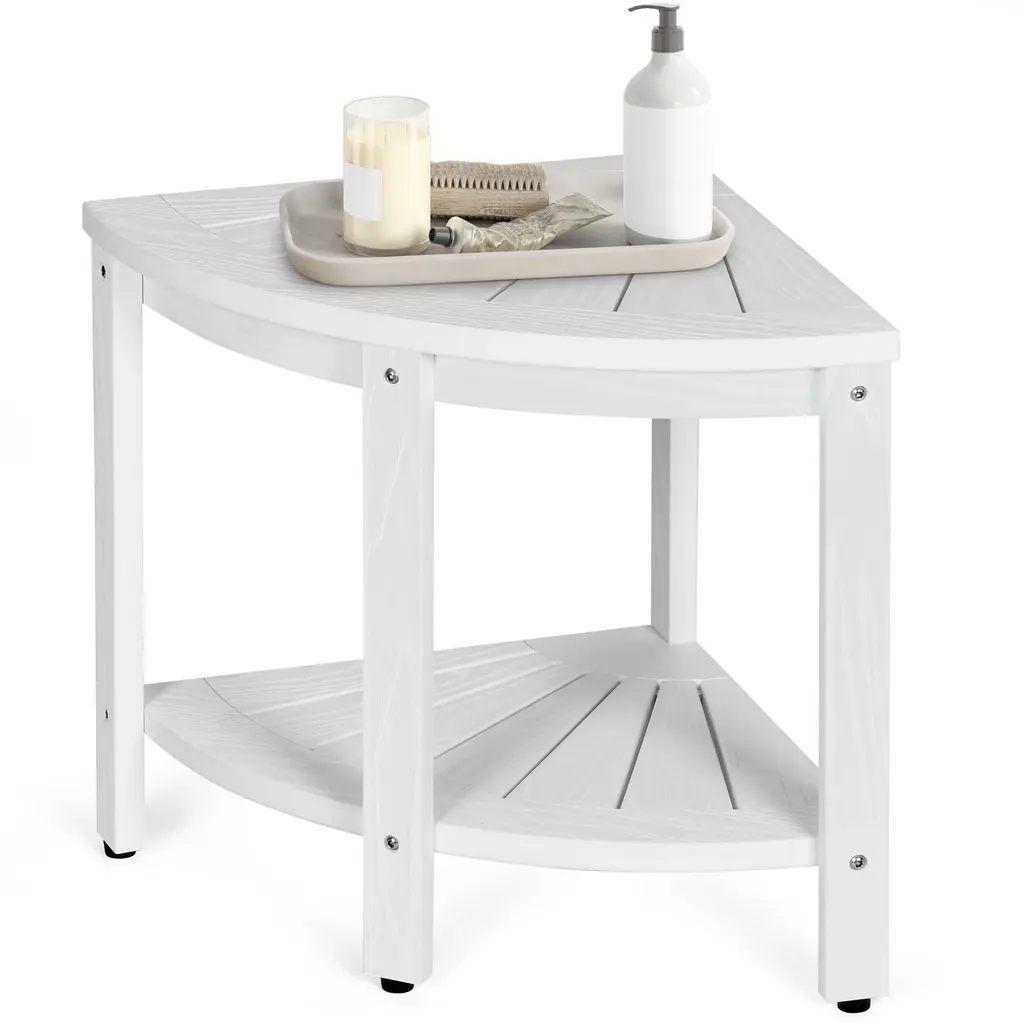 Product introduction: Are you looking for a practical and stylish shower bench for your bathroom? Look no further than this corner shower bench! It is made of water-resistant and durable material that lasts for years. It has a space-saving and elegant corner shape that fits in any right angle of your home. It has a versatile 2-tier design that offers ample storage space and a comfortable seat. It has a stable and safe structure that supports up to 350lbs and prevents slipping. It has rustproof screws that ensure its stability and quality even in moist environments. This shower bench is the perfect addition to your bathroom or living room!