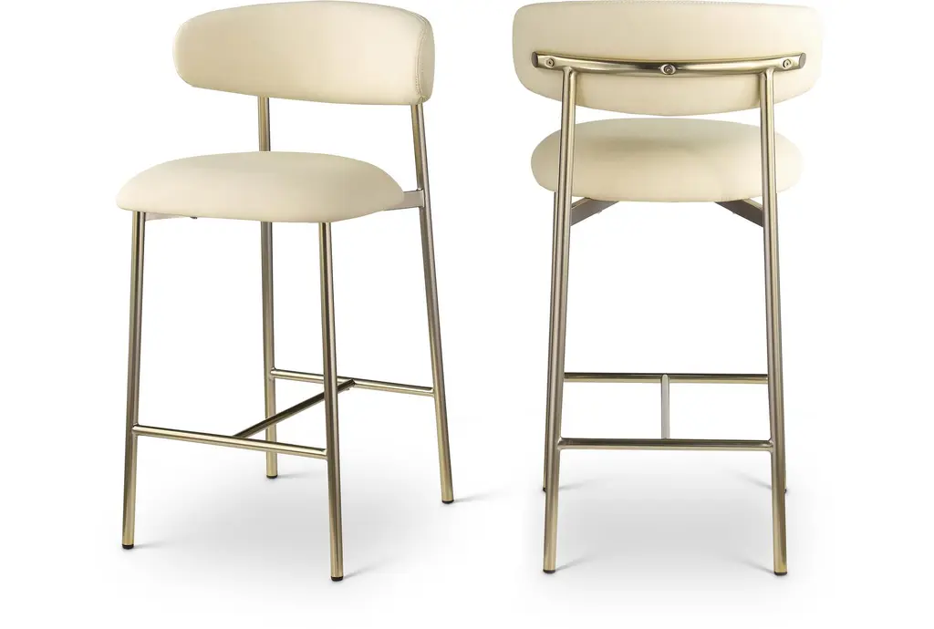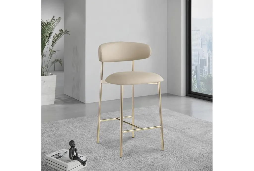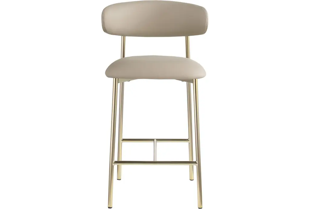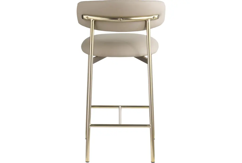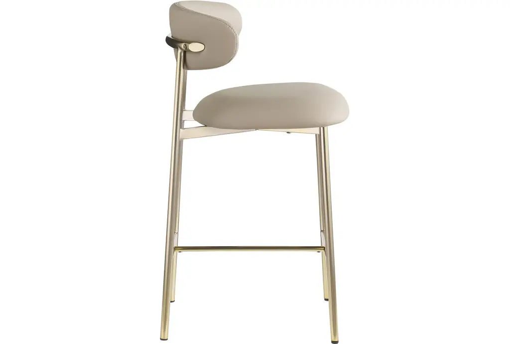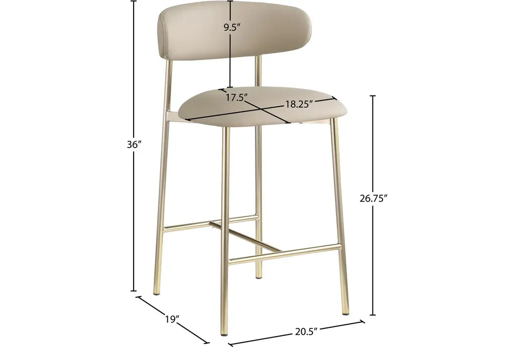 Enhance your dining experience with the Lupita Taupe Vegan Faux Leather Upholstered Counter Height Stool with Brushed Gold Finish Set of 2. These modern stools are designed to provide comfort and style, making them a perfect addition to your dining room or kitchen. The vegan leather and foam cushioning offer a soft and supportive seat, while the brushed gold iron legs add a touch of sophistication.