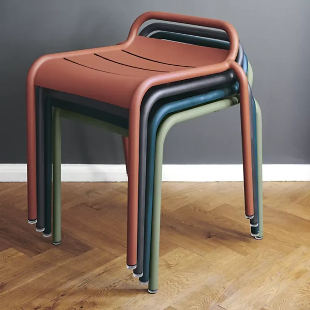 Smooth and stylish supplemental seating. The Luxembourg Stool - Set of 2 by Fermob is a pair of lightweight and low-profile pieces, always at the ready should you ever need room for a couple more around a dining table or lounge area. Each seat is made of aluminum slats, which are curved just so for maximum comfort. And the tubular aluminum frame ensures the stool’s durability and convenience, with a low backrest that doubles as a carrying handle. Designed by Frederic Sofia.
