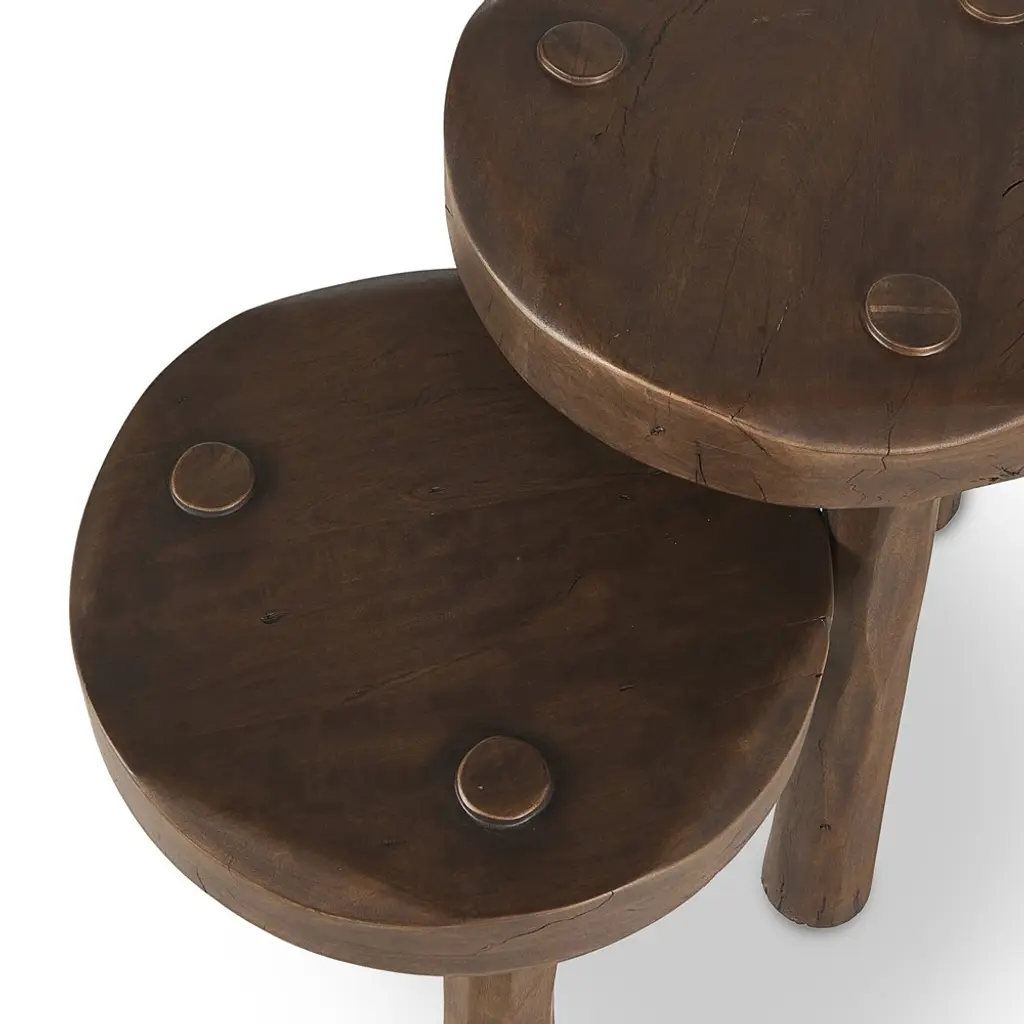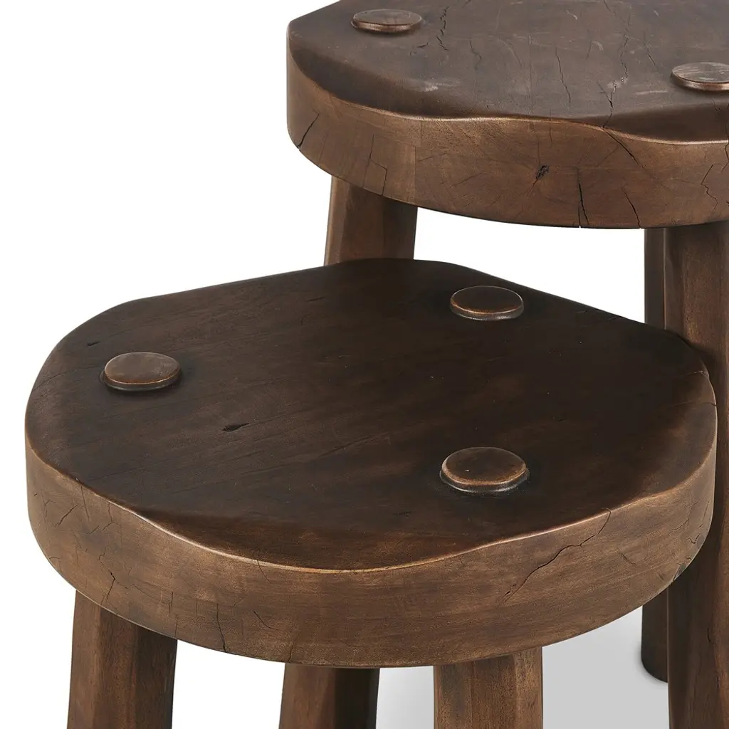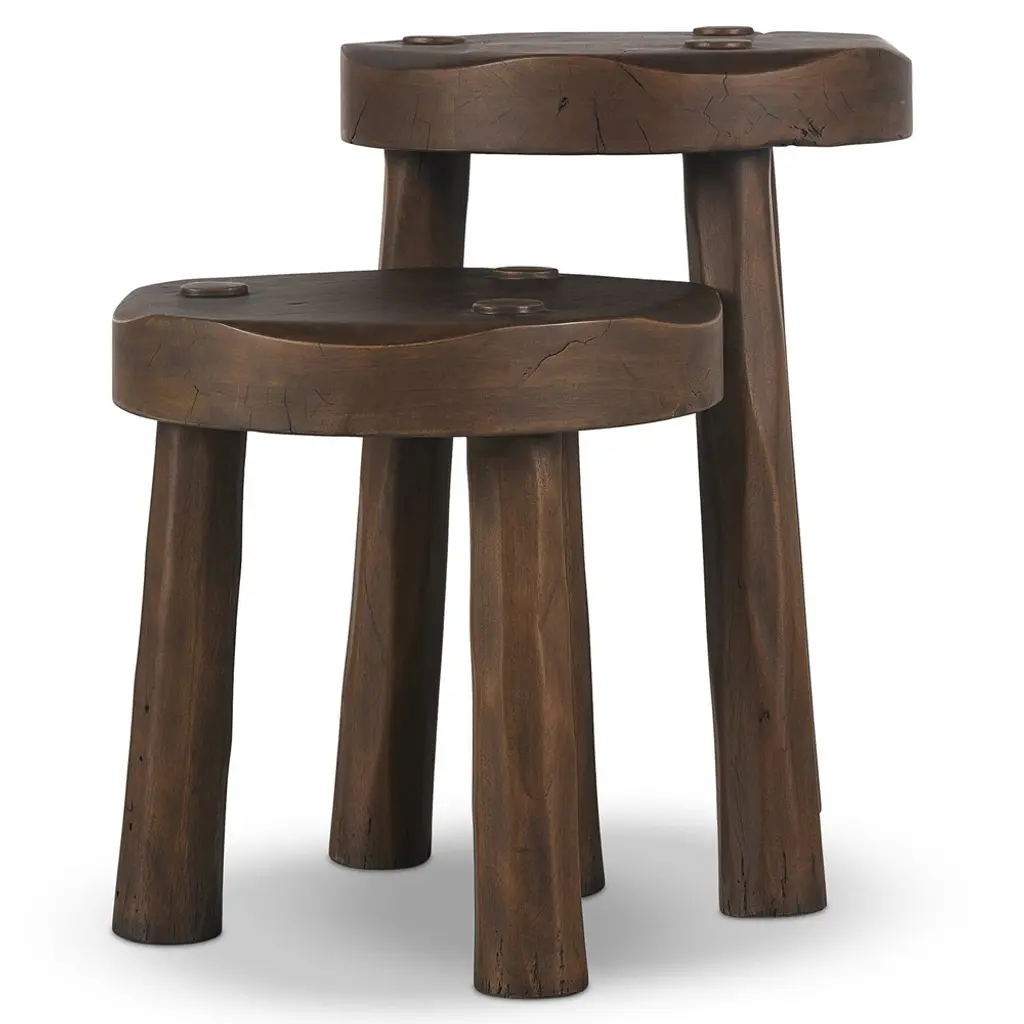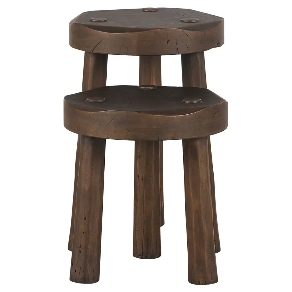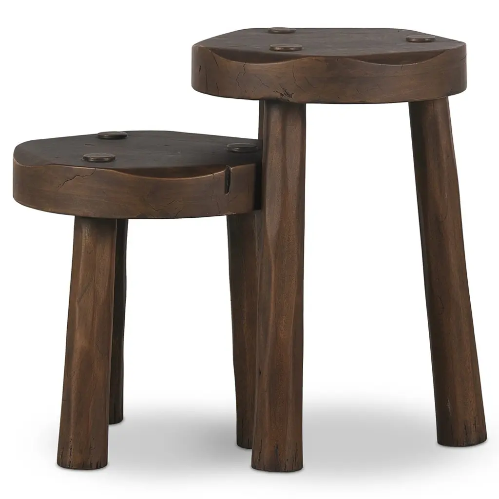 A design collaboration by Amber Lewis and Four Hands. Made from mixed reclaimed woods, a set of antique-inspired nesting stools is finished in a deep brown, with natural cracks and graining for a rich, storied look.