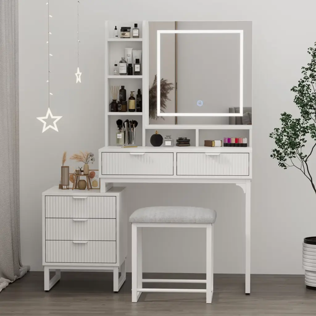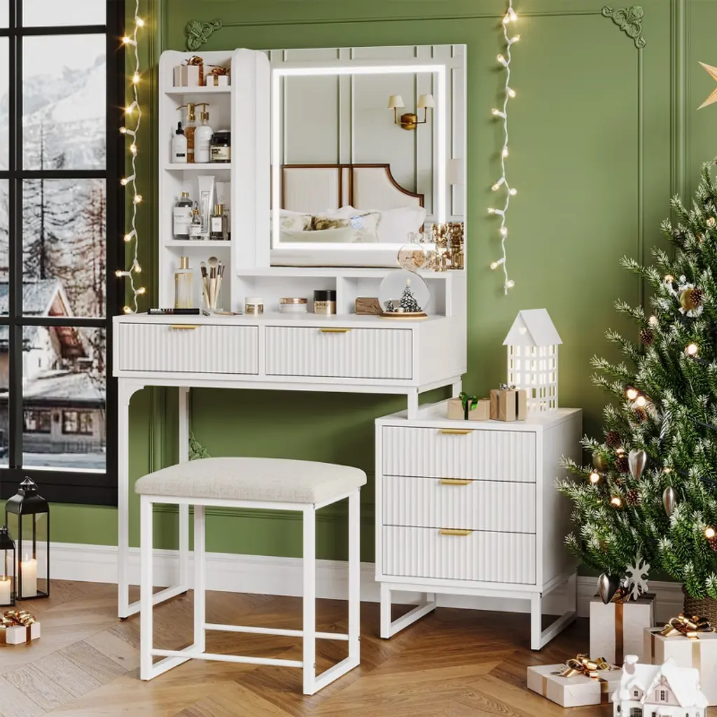 Makeup Vanity Desk With 3 Adjustable Lighting Colors, Dressing Table With Drawers & Cushioned Stool