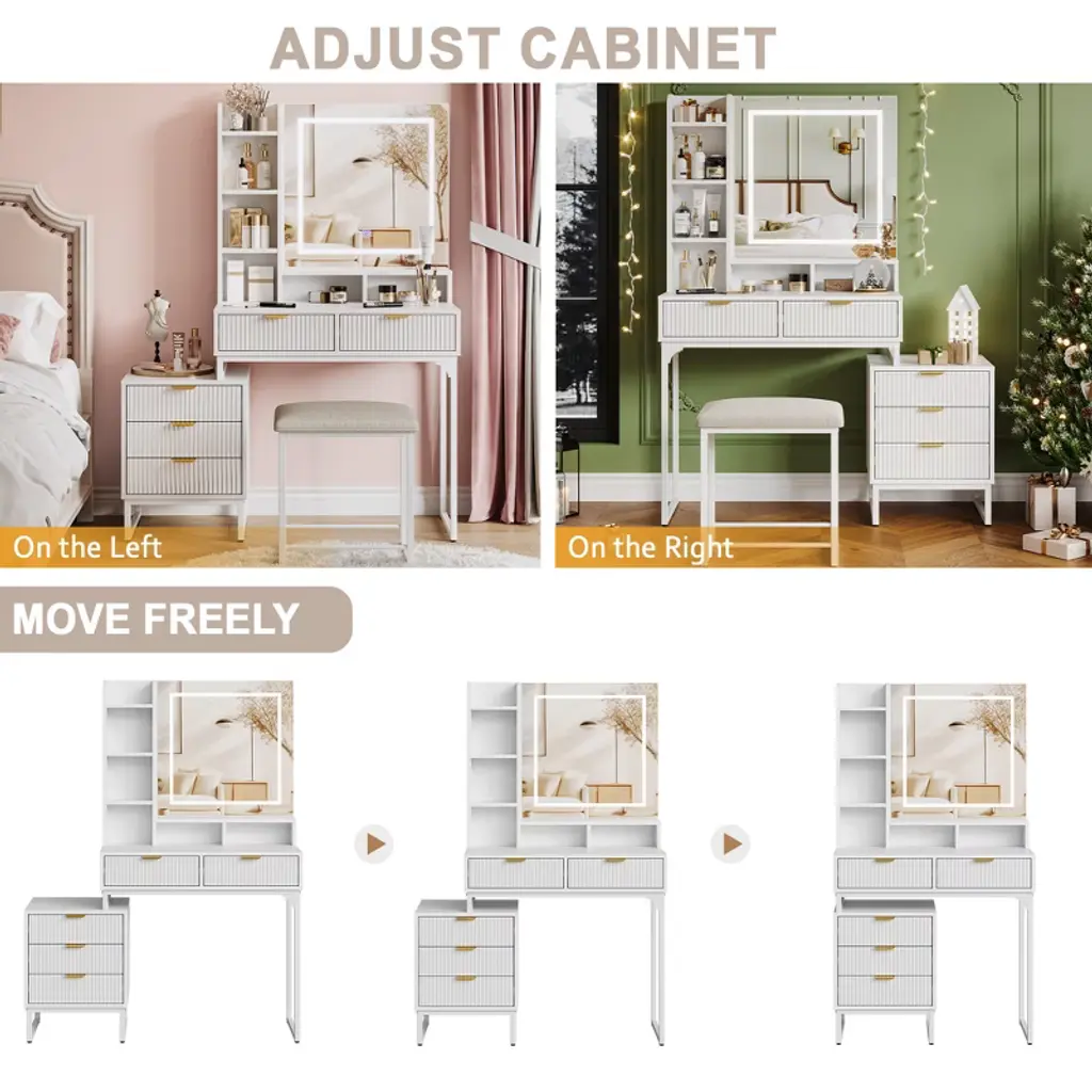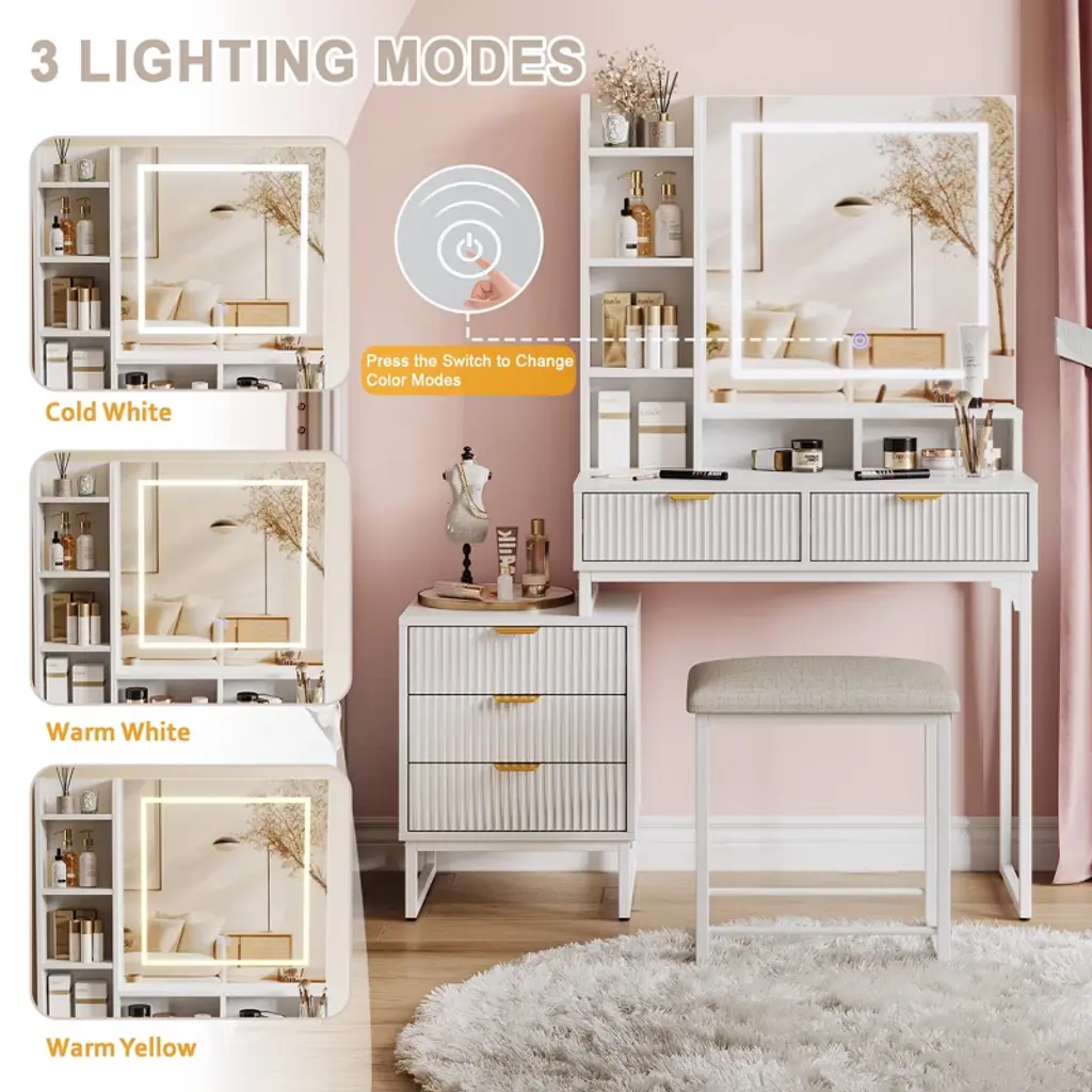 Makeup Vanity Desk with Mirror and Lights, Vanity Table Set with 3 Adjustable Lighting Colors, Dressing Table With 5 Large Drawers and Cushioned Stool, White Bedroom Vanity for Girls Women