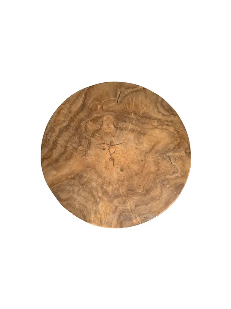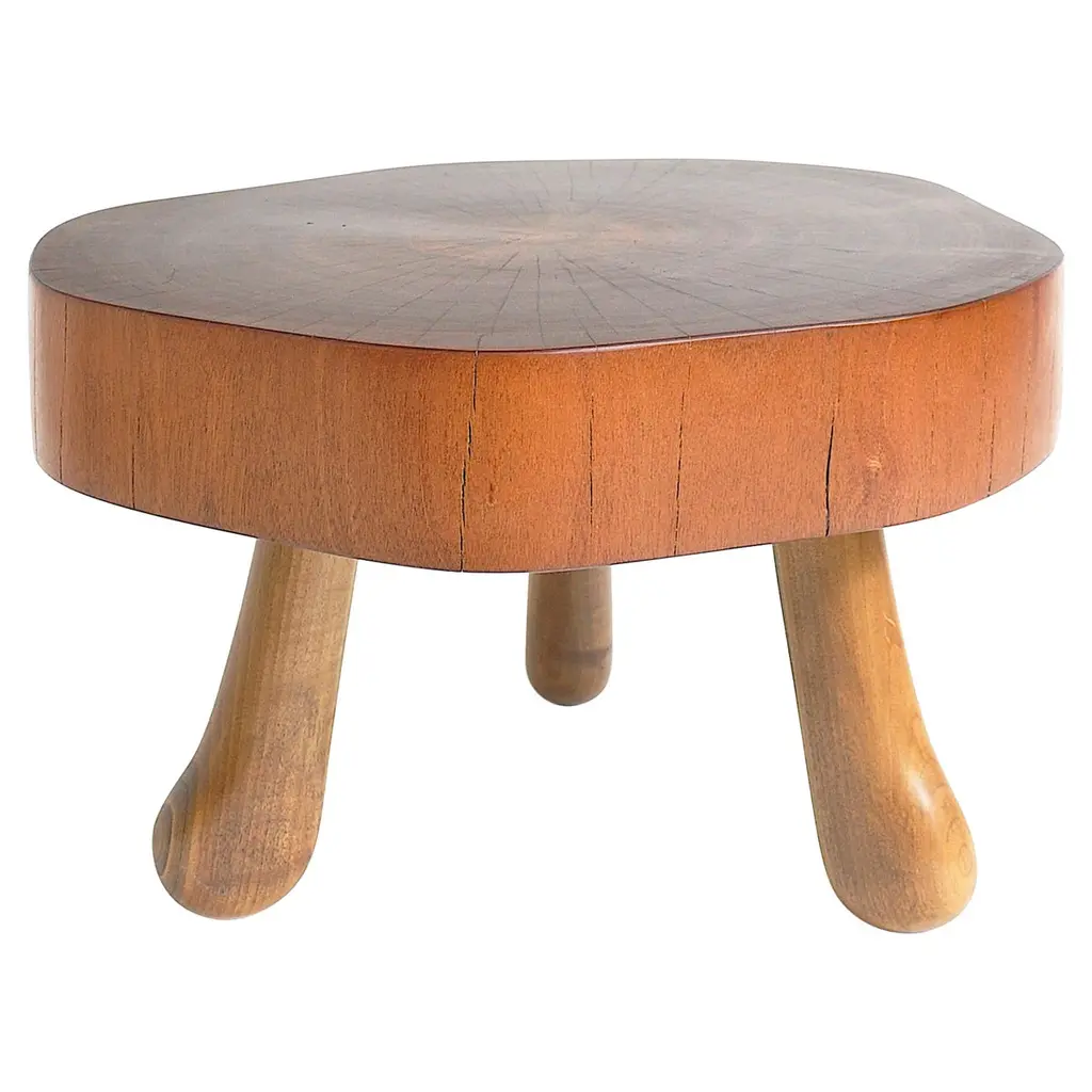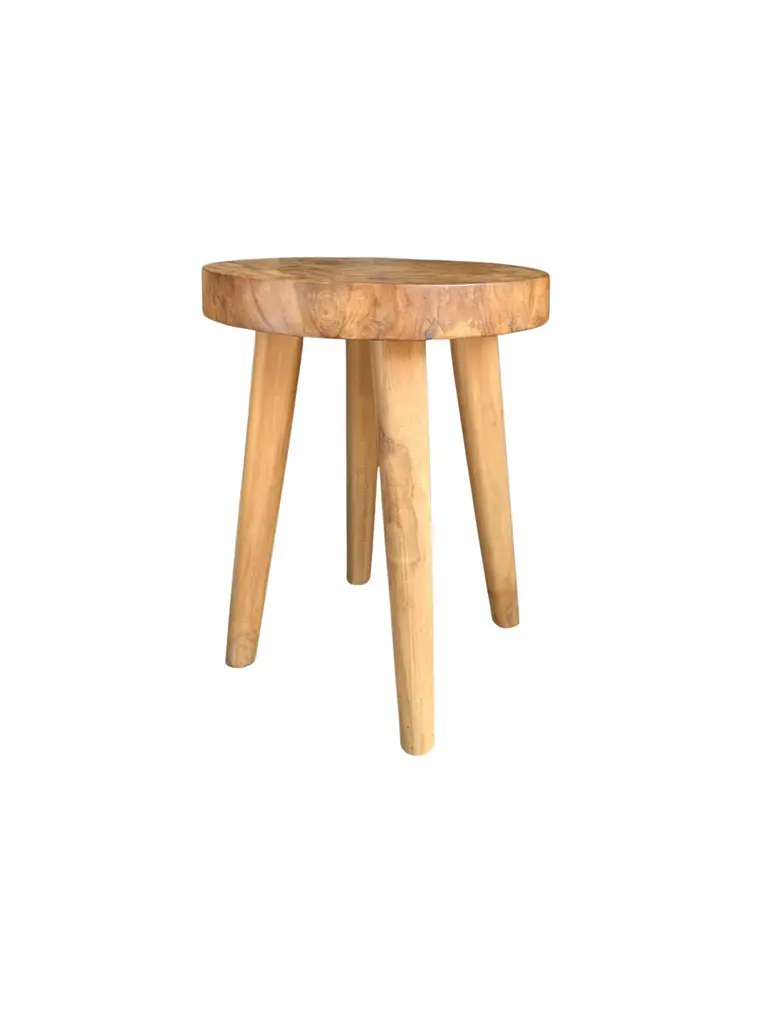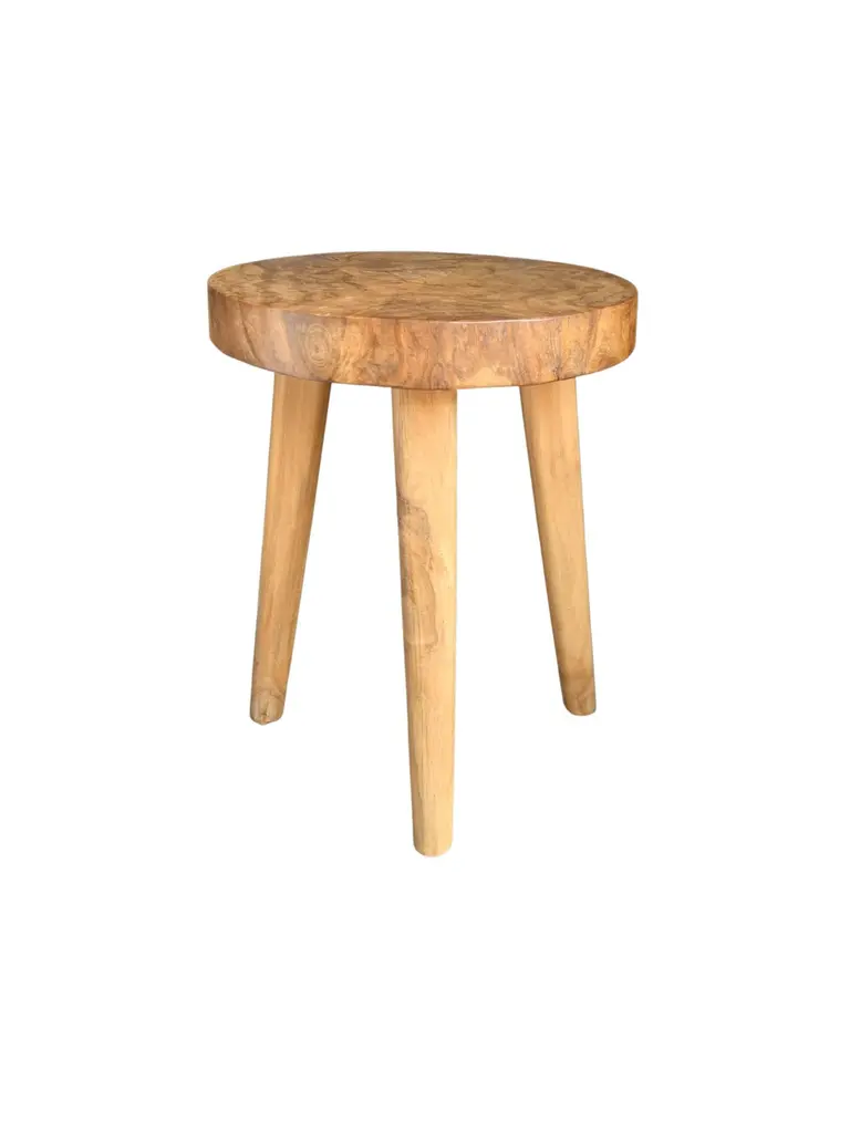 This wonderfully sculptural stool was crafted using mango wood. The chair sits on 4 slender legs. Its neutral pigment makes it perfect for any space. A uniquely sculptural and versatile piece certain to invoke conversation. This chair features a natural finish with a clear coat. It was sanded down meticulously to achieve a smooth texture. The wood patterns present on all sides adds to its charm.