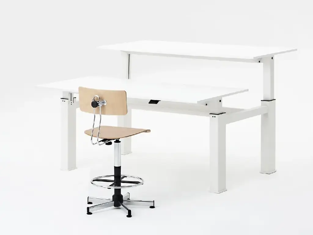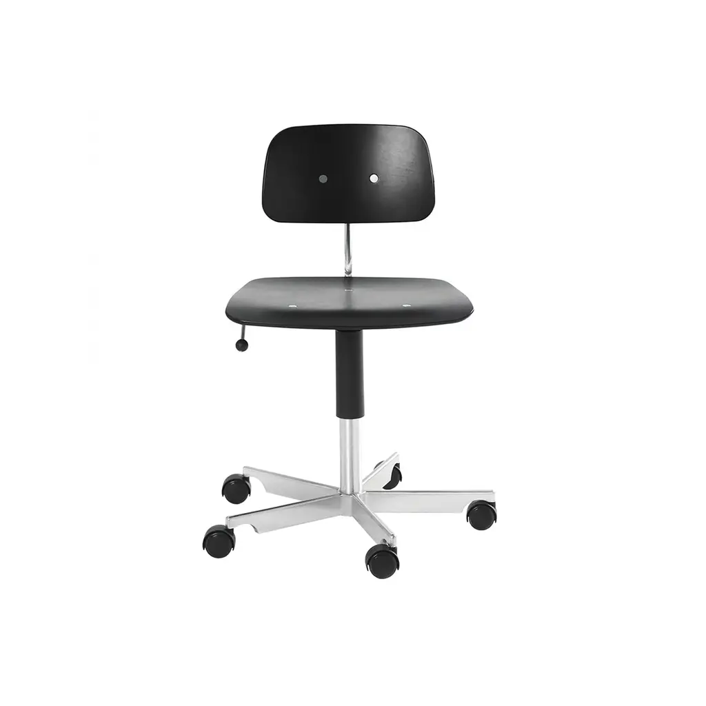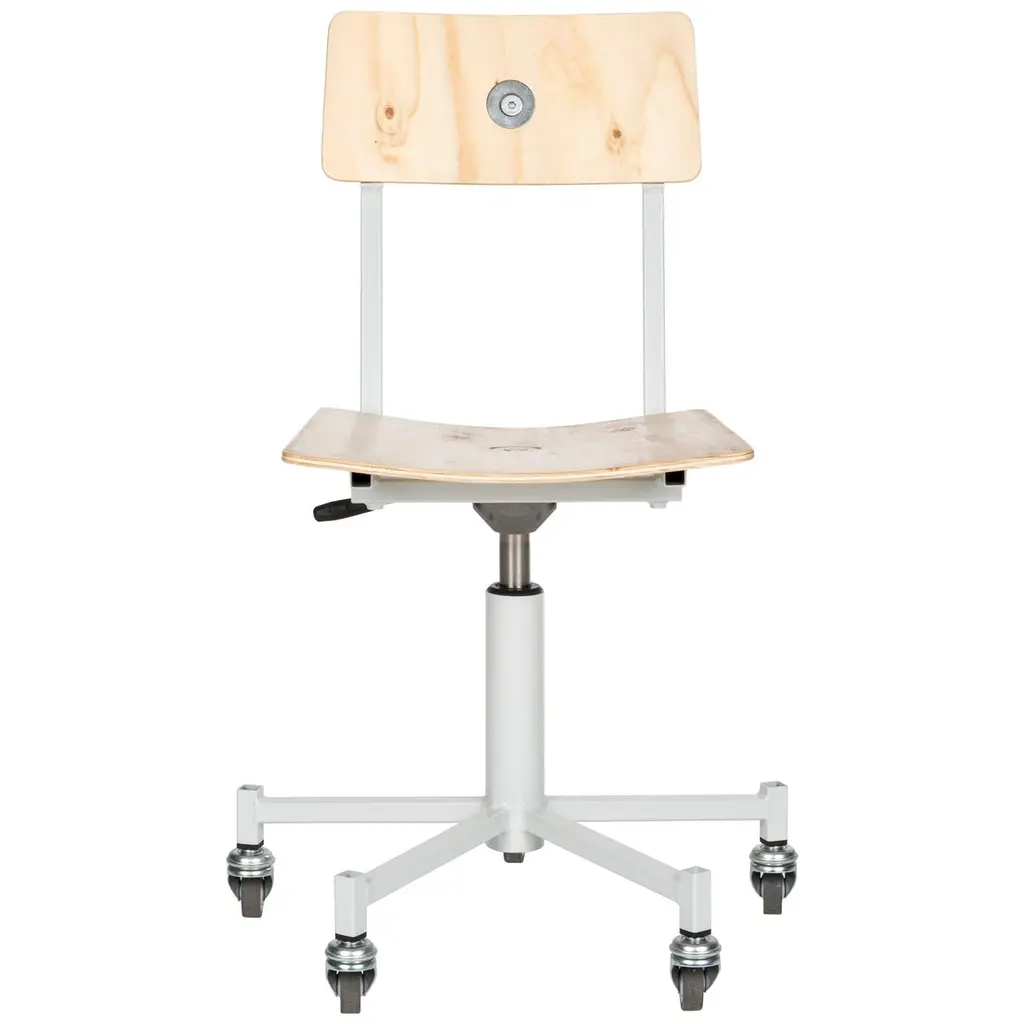 Height-adjustable stool, with gas, composed of a sturdy and stable steel structure. Available in seat and backrest versions in beech plywood or upholstered. The version with castors is supplied without footrest.