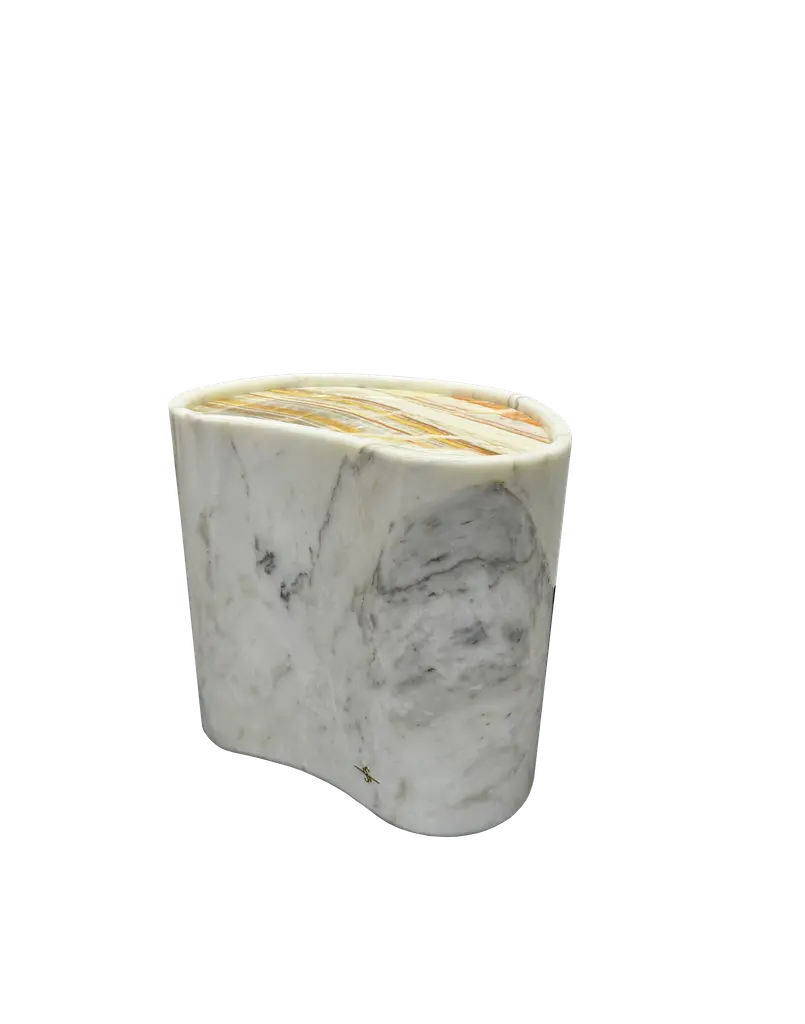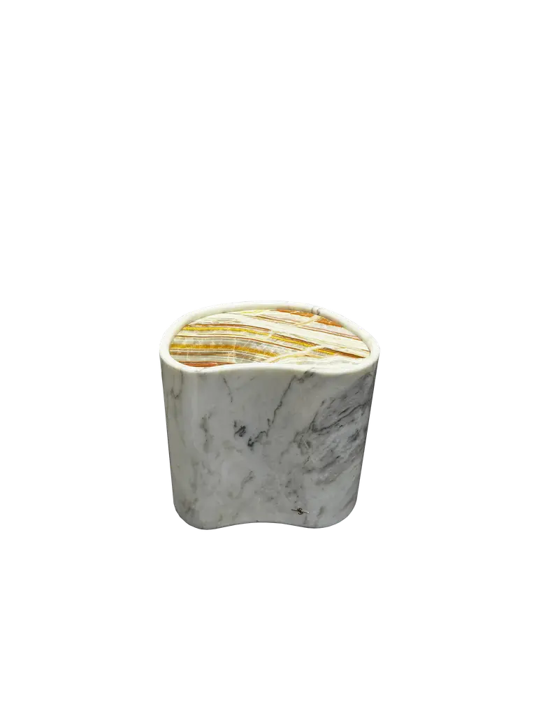 Successfully presented at ICFF New York 2024, this exclusive Calacatta marble stool is carved from a single solid block, with Picasso onyx top. Glossy finish for timeless elegance.