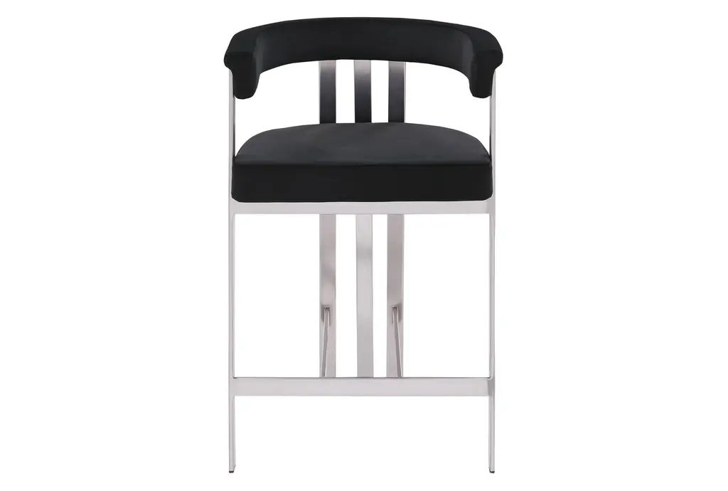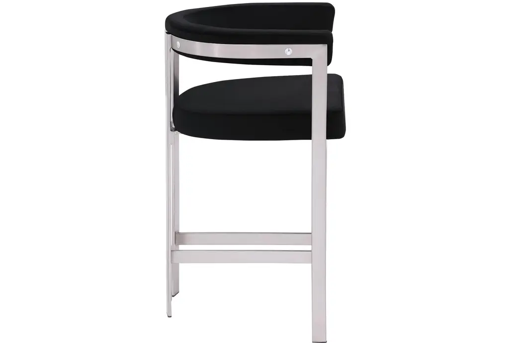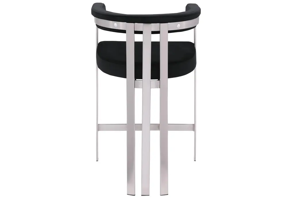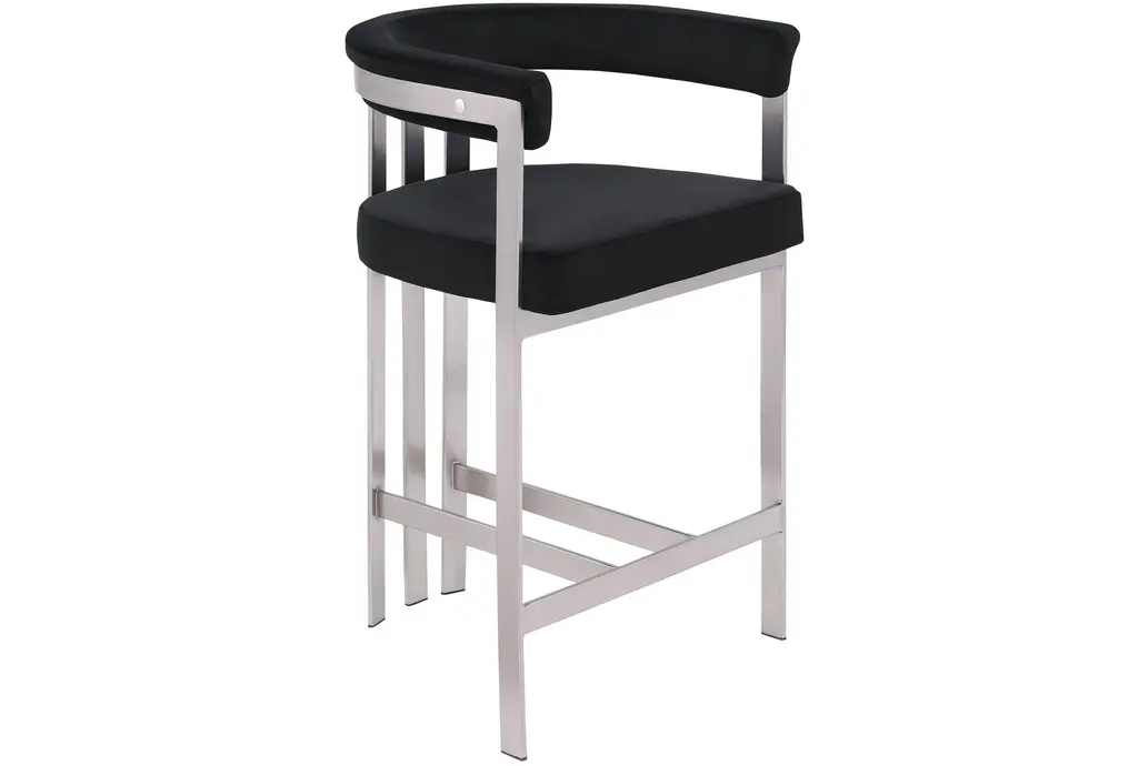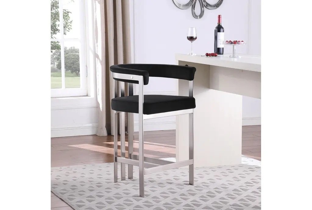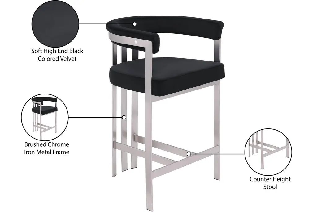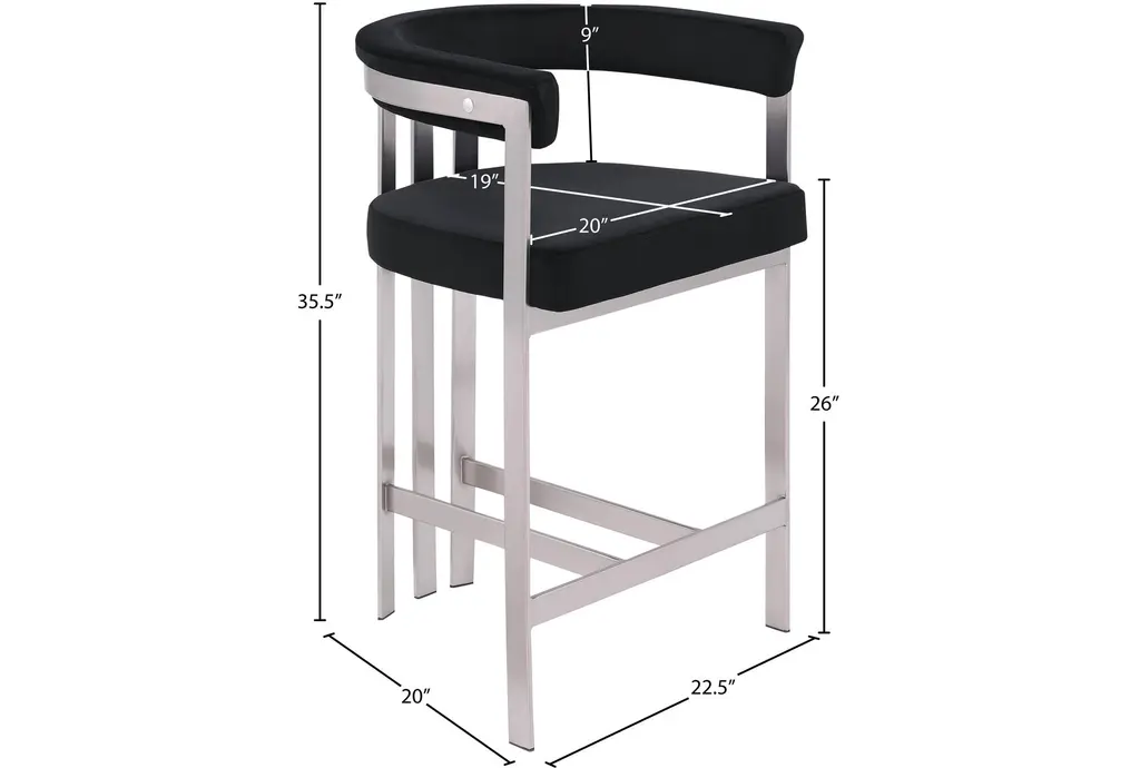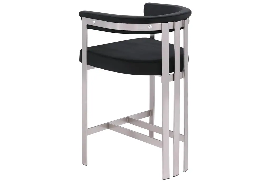 The Marcello Black Velvet Upholstered Counter Height Stool with Brushed Silver Finish is a perfect addition to your dining room or kitchen. This set of 2 stools offers both comfort and style with their modern design and plush velvet upholstery. The brushed silver finish provides a striking contrast to the black velvet, creating a contemporary look that's sure to impress.