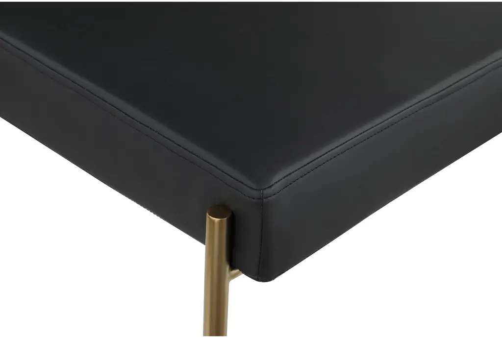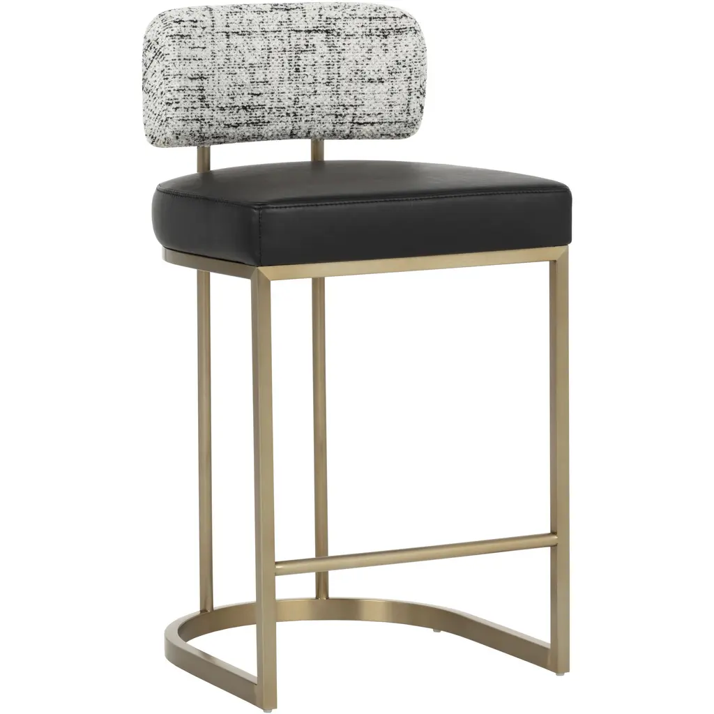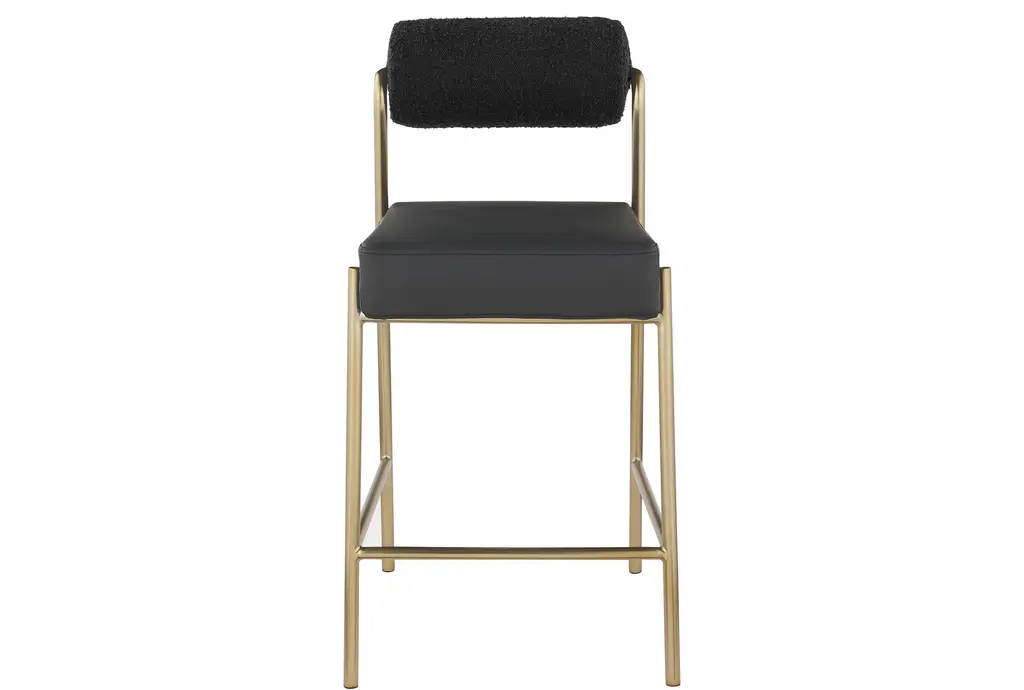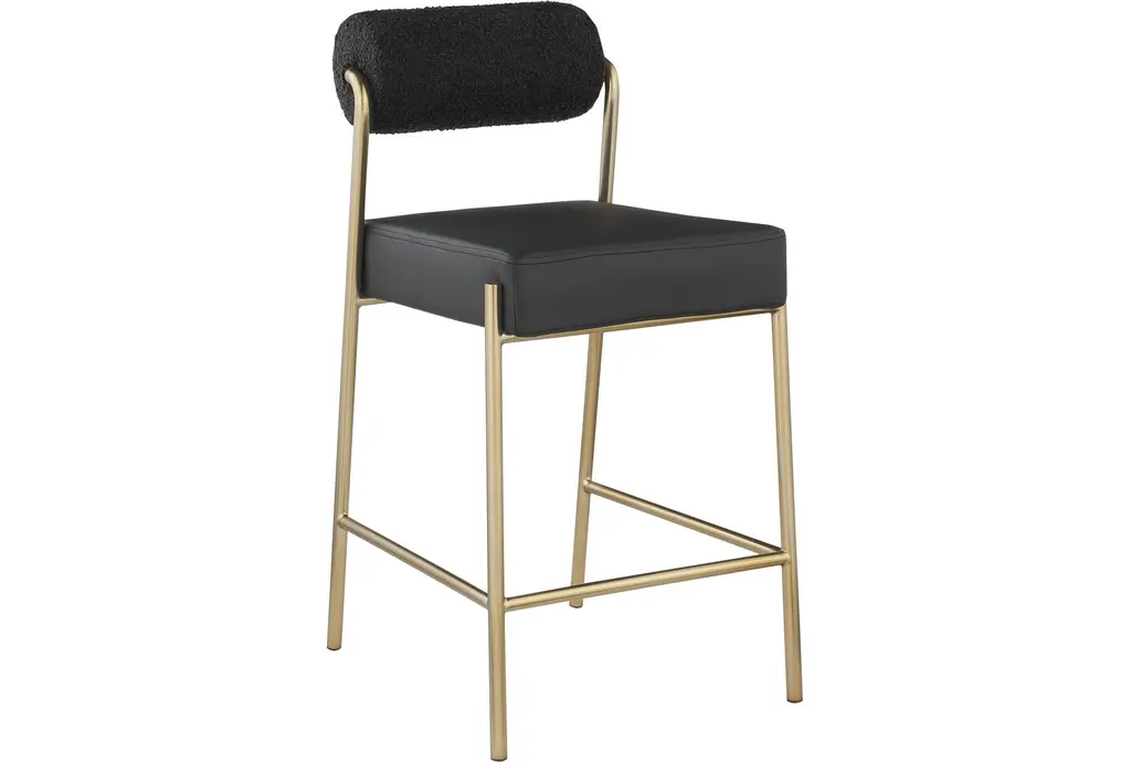 The Marline Black Vegan Leather Upholstered With Boucle Counterstool brings a touch of modern sophistication to any room. Ideal for dining rooms, kitchens, and living rooms, this counter height stool features a sleek armless design that maximizes space and comfort. Its brushed brass leg frame offers a sturdy and stylish foundation that complements the rich black vegan leather and boucle fabric.