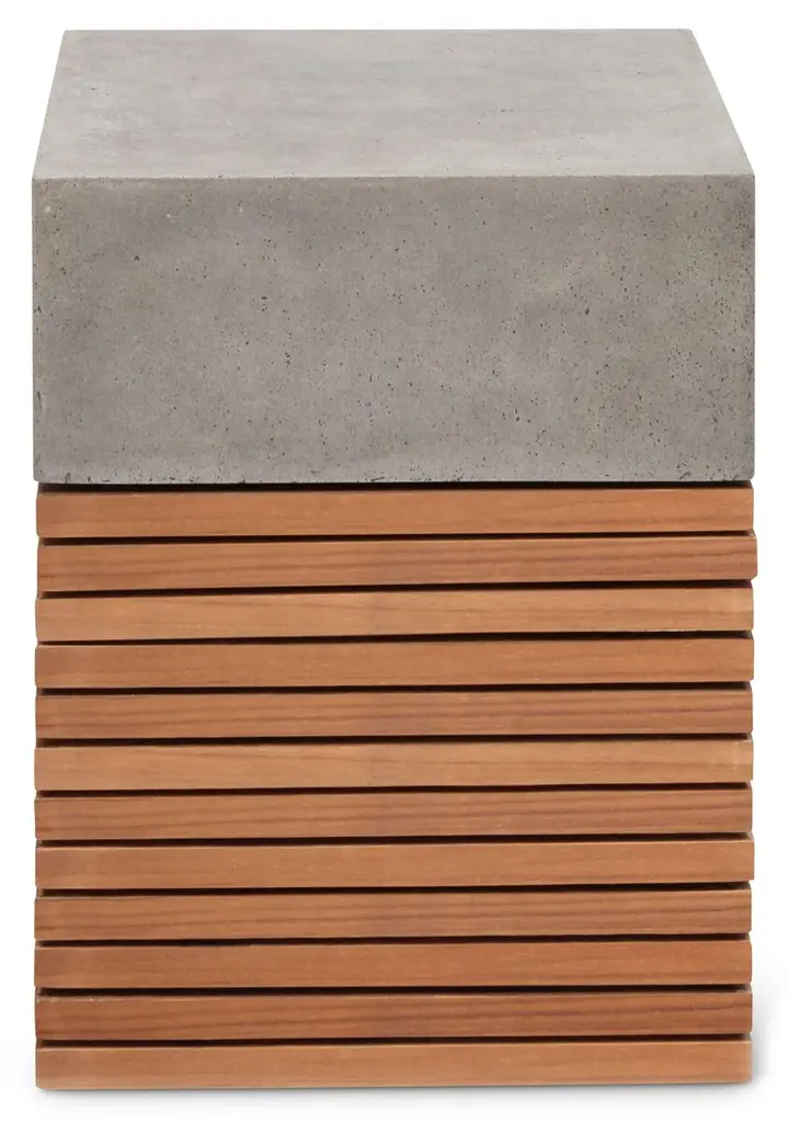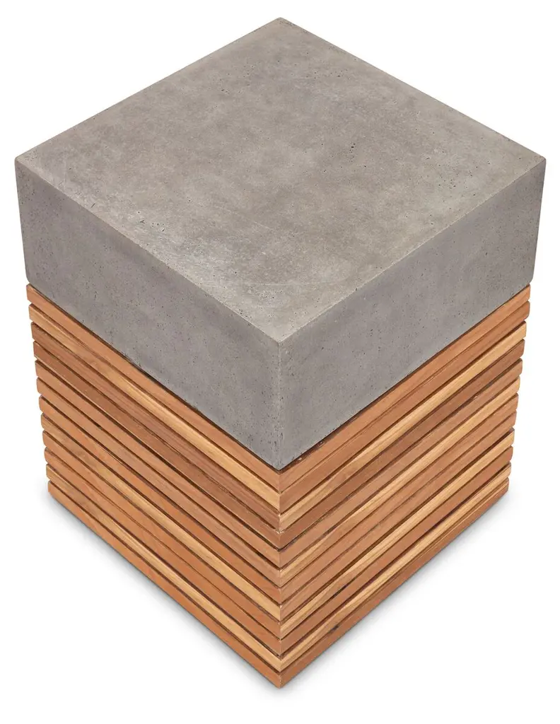 Offering an unusual mix of materials, this outdoor stool is crafted with a concrete top and a slatted teak base. This combination makes for an ideal stool, pedestal, or end table to enhance a minimalist décor scheme. Each piece exhibits a unique patina and showcases artisan craftsmanship, making it suitable for outdoor use.
