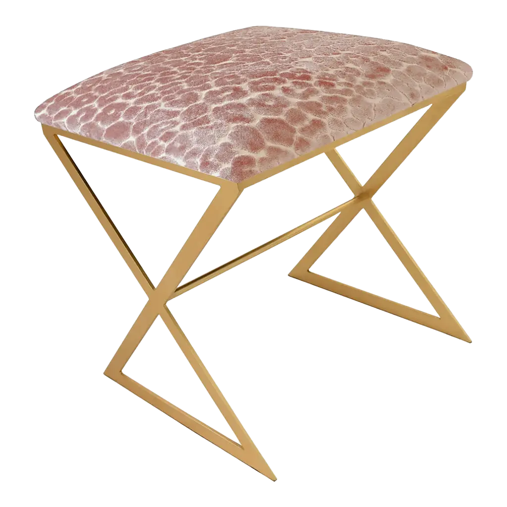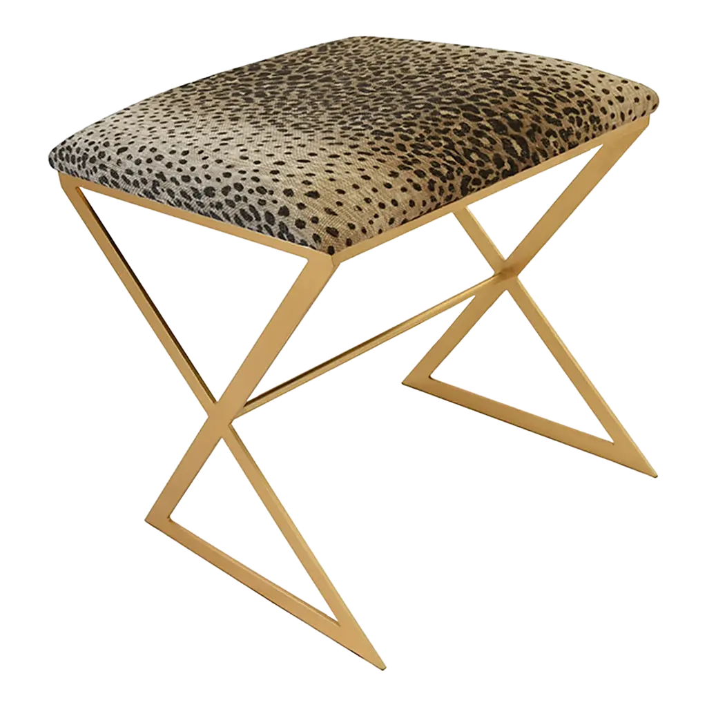 X marks the spot for style! The X Side stool, with its gold leaf frame and cushion in luxe beige geometric print upholstery is a treasure waiting to be discovered. From occasional seating stored neatly under your console or a permanent seat at the table, you'll find this little gem has many applications making it a treasured addition to any room in your home. Also available in polished nickel. Material: 100% Poly, 57,500 Rub Count Online Exclusive 18" W X 20" H X 18" D Width:18.00" Height:20.00" Depth:18.00"