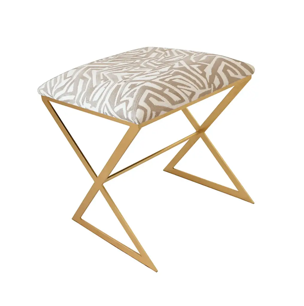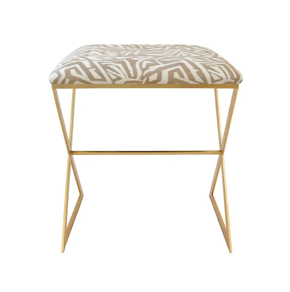 Matthew Izzo Home - X Side Stool In Beige Geometric Upholstery And Gold Leaf Base