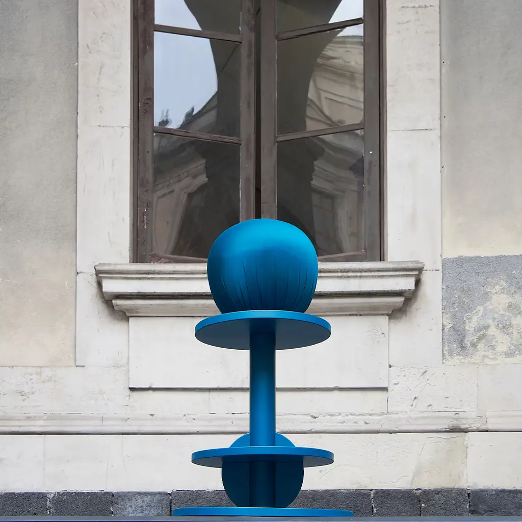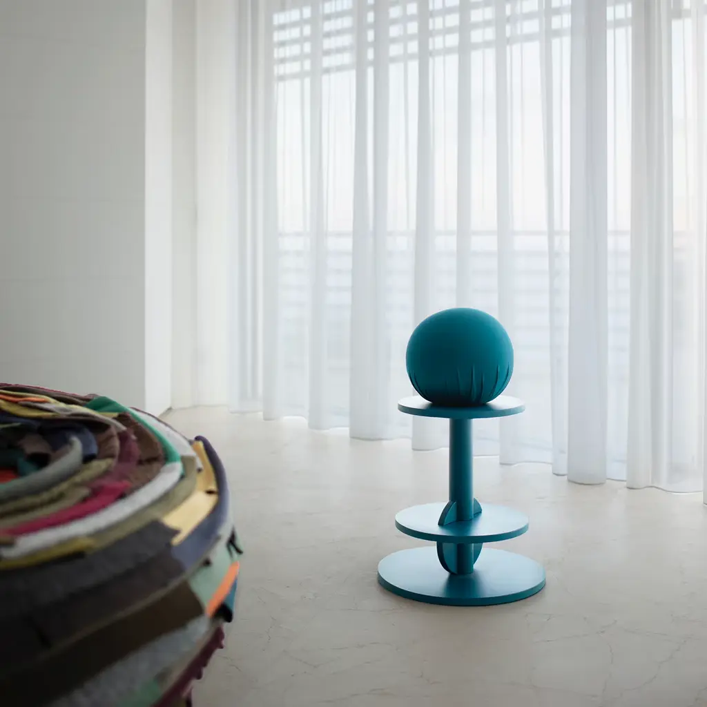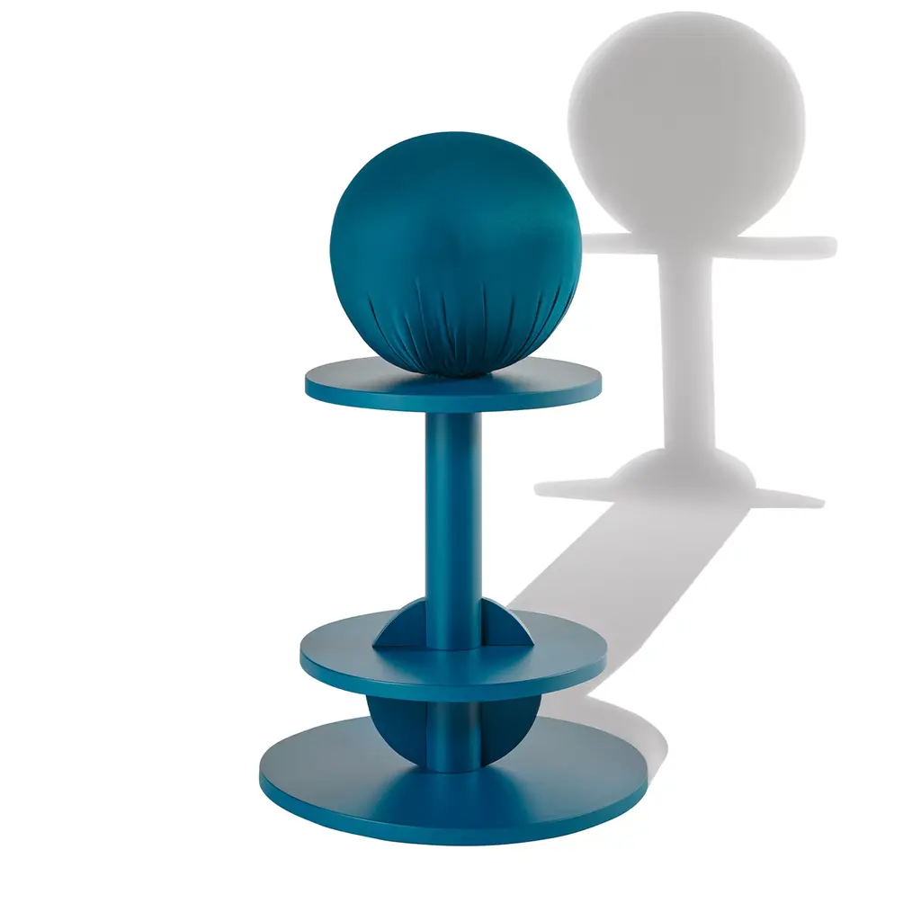 This gorgeous teal-blue stool is reminiscent of the pawn piece in chess, showcasing a solid wood structure with a minimalist allure, along with a scuba-upholstered polyurethane sphere for comfortable seating. Best matched with its sister pieces from the same Matto Collection by designer Anna Polisano for a colorful impact in a contemporary or mid-century modern space.
