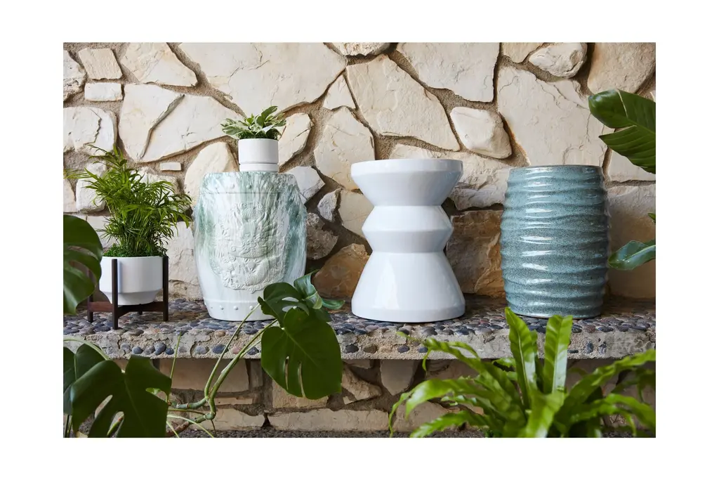 With its sculptural silhouette, this glazed ceramic stool is sure to make a statement indoors or out. The bold curves give it a modern, contemorary feel. This multi-functional piece can be used as a side table or extra seat for year-round entertaining.