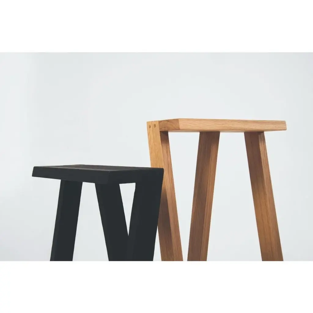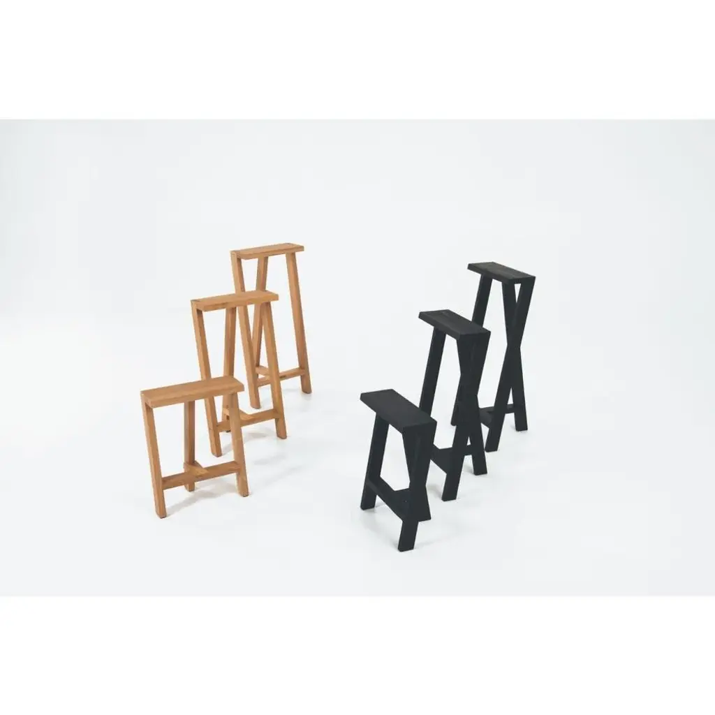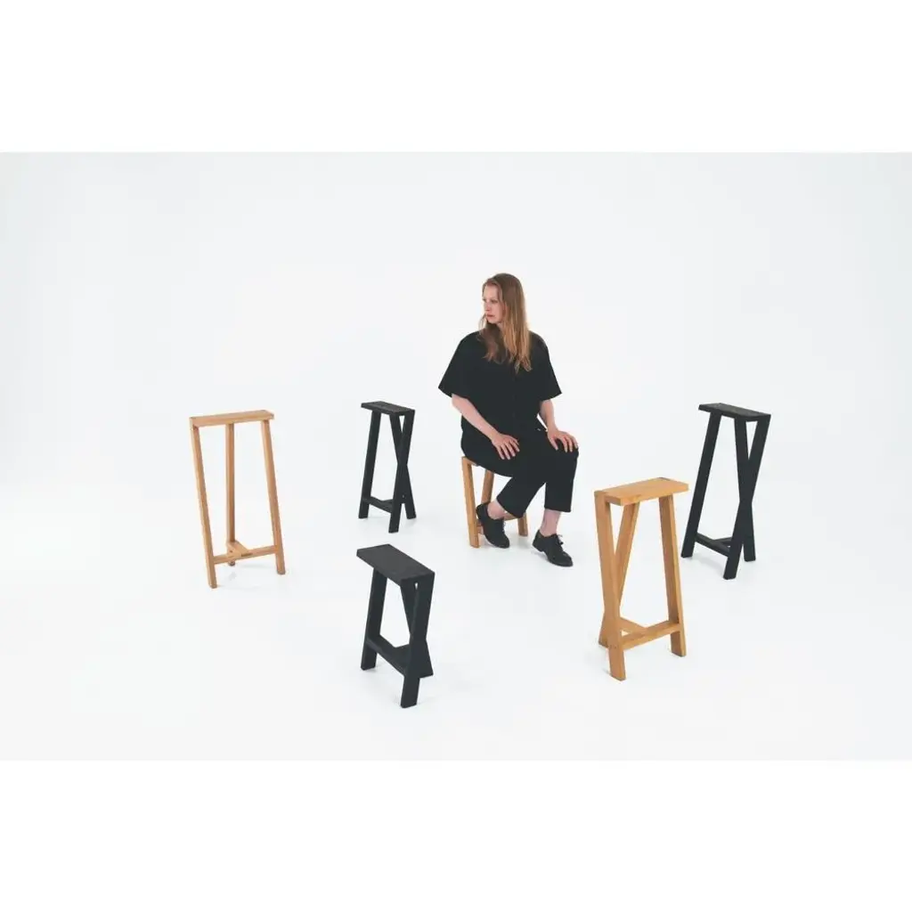 Set of 4 Medium Pausa oak stool by Pierre-Emmanuel Vandeputte Dimensions: D 27 x W 35 x H 65 cm Materials: oak wood Available in burnt oak version and in 3 sizes Pausa is a series of stools; 45cm, 65cm, or 80cm of assembled oak pieces. The narrow dimensions of the seat make for a perfect break on the three-legged structure. Whether seated at home or leaning over a bar counter, Pausa invites us to enjoy a moment’s peace.