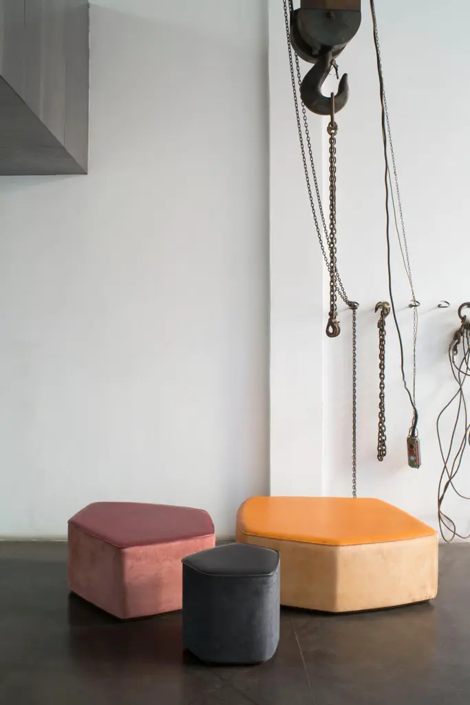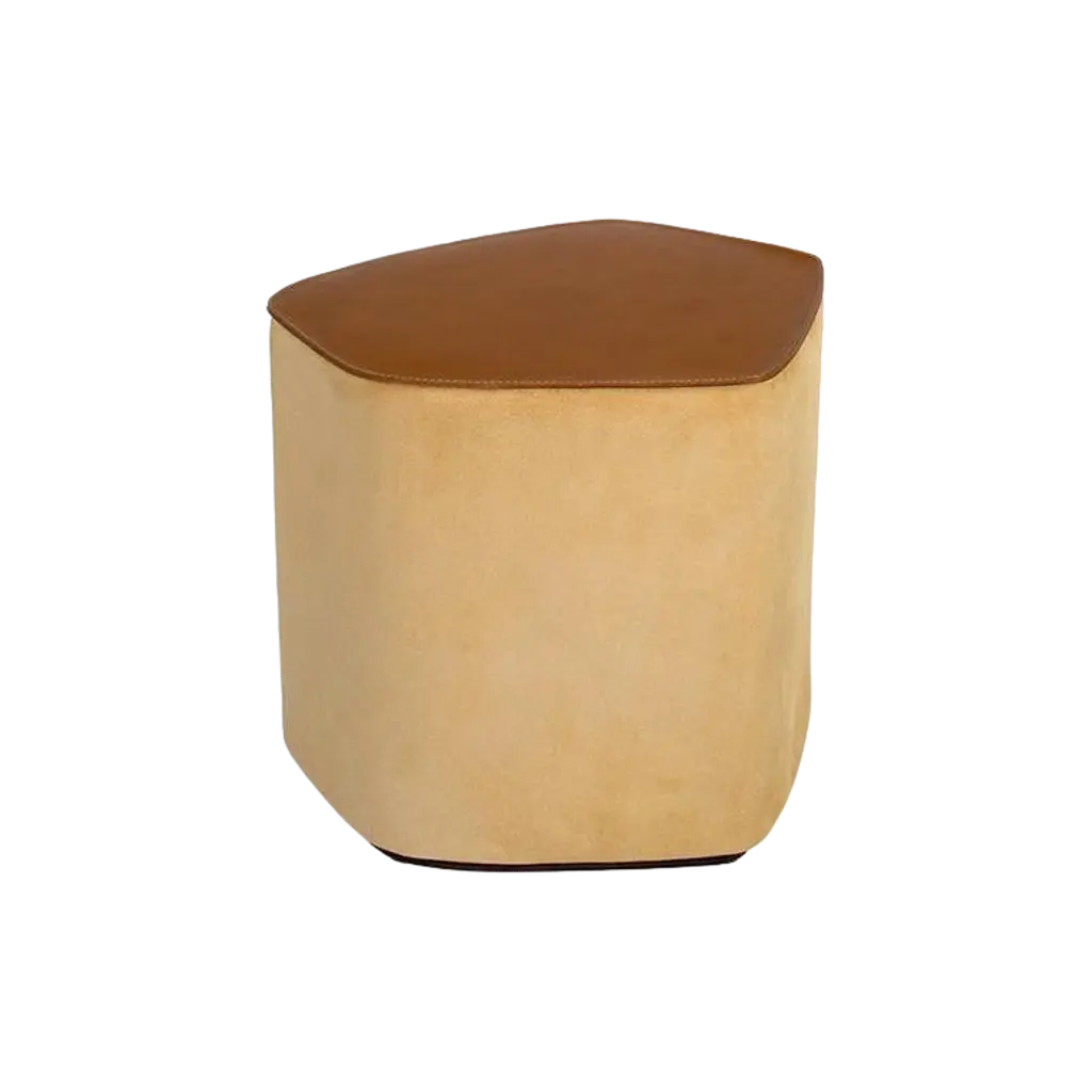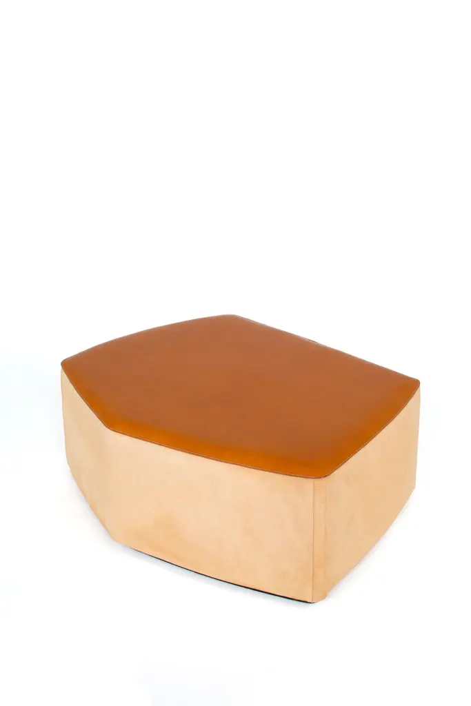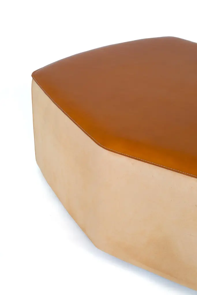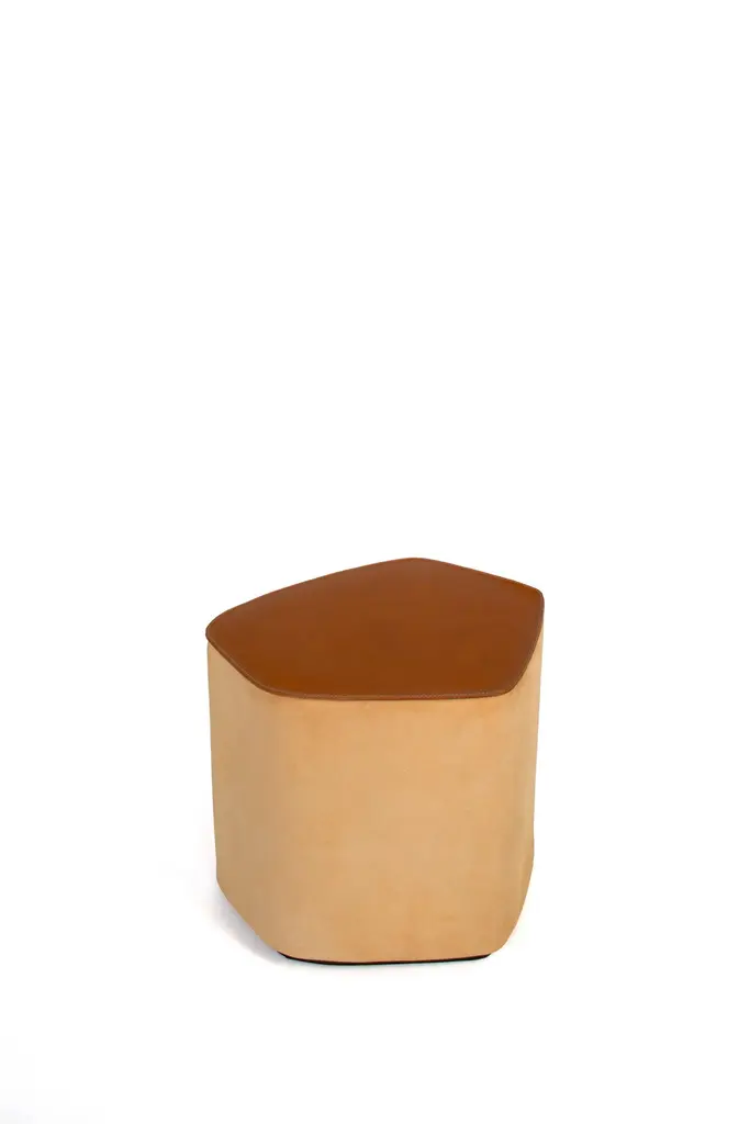 Medium pouf! leather stool by Nestor PerkalDimensions: W 83 x D 75.5 x H 35 cmMaterials: Leather, poplar plywood, suede.Available in other colors and in 3 sizes.The POUF! collection is made up of three seats made of leather and suede. They look like diamonds, minerals or the footprints of an animal in the soil. They are suitable for home furnishing, in the office or in a public place.Genuine italian vegetable-tanned leather, colours as per available range.Vegetable-tanned suede?; colours as per available range.Non-distortable expanded polyurethane filling in various densities.Base in stained poplar plywood.
