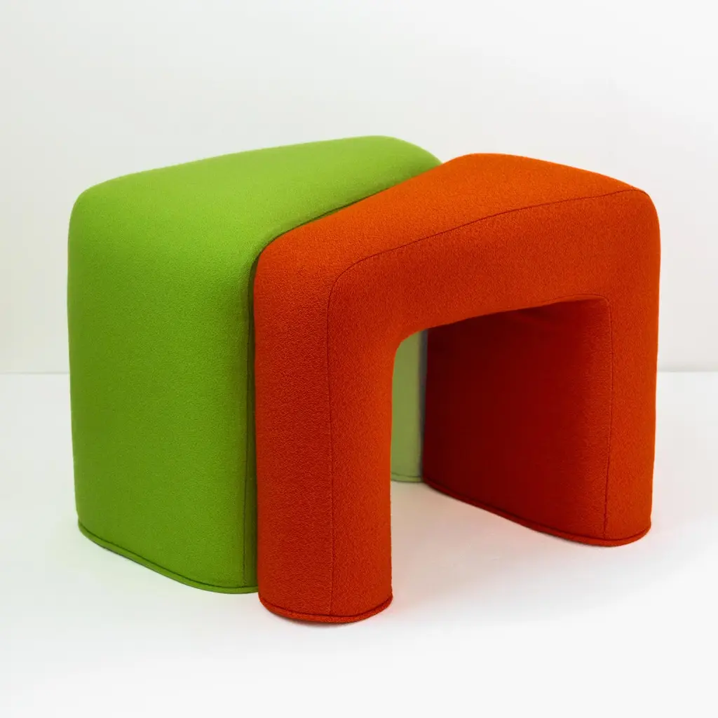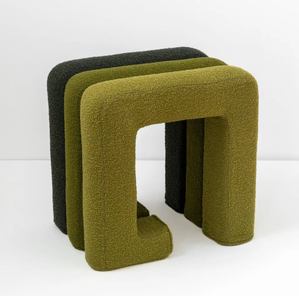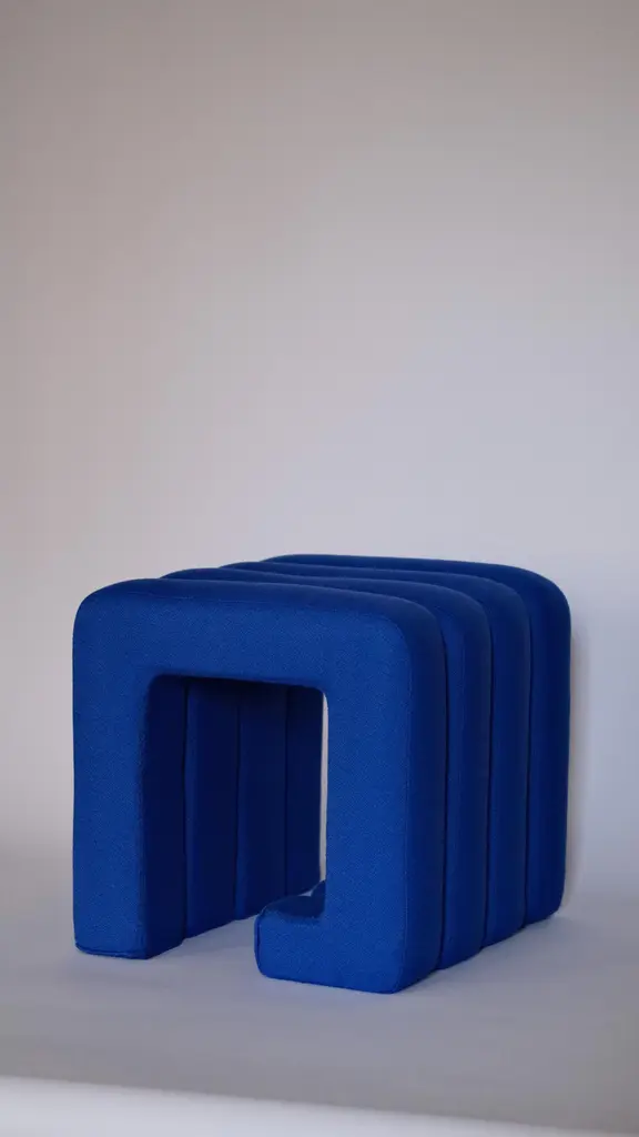 Meta Stool by Jaclyn PappalardoDimensions: W 47 x D 36 x H 49 cmMaterials: Pine wood, upholstery foam and Denim, Blue Bute fabric. Jaclyn is a designer and maker based in London. Her background in set design informs her creative work as a designer. Colour and texture play an important role in developing each and every project. With a particular interest in the use of seating, Jaclyn looks at chairs not only as a functional object but rather as a study of body, shape and language. Her work incorporates unconventional design techniques that stretch far from traditional craftsmanship. Exploring new techniques and material driven processes such as metal forming and non-traditional upholstery, she builds on similar profiles and repetitive patterns in the aim of creating something timeless. Jaclyn’s work has been published in Arcipelago, Modern House, Dezeen, Vogue and Luncheon magazine. Represented by The Radford Gallery & Fels World gallery in London UK. Caselli 11-12 Gallery in Milan IT, works alongside private commissions for residences, retail stores, and galleries.