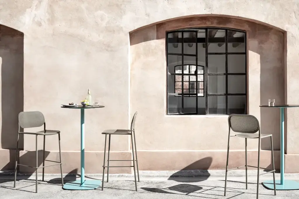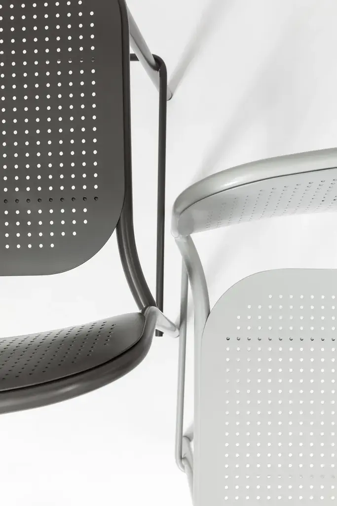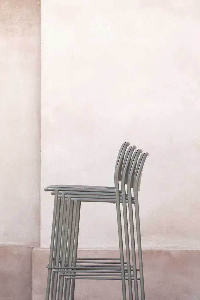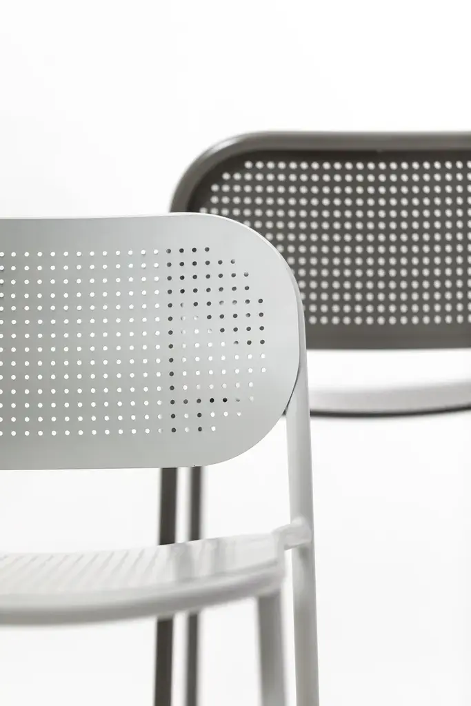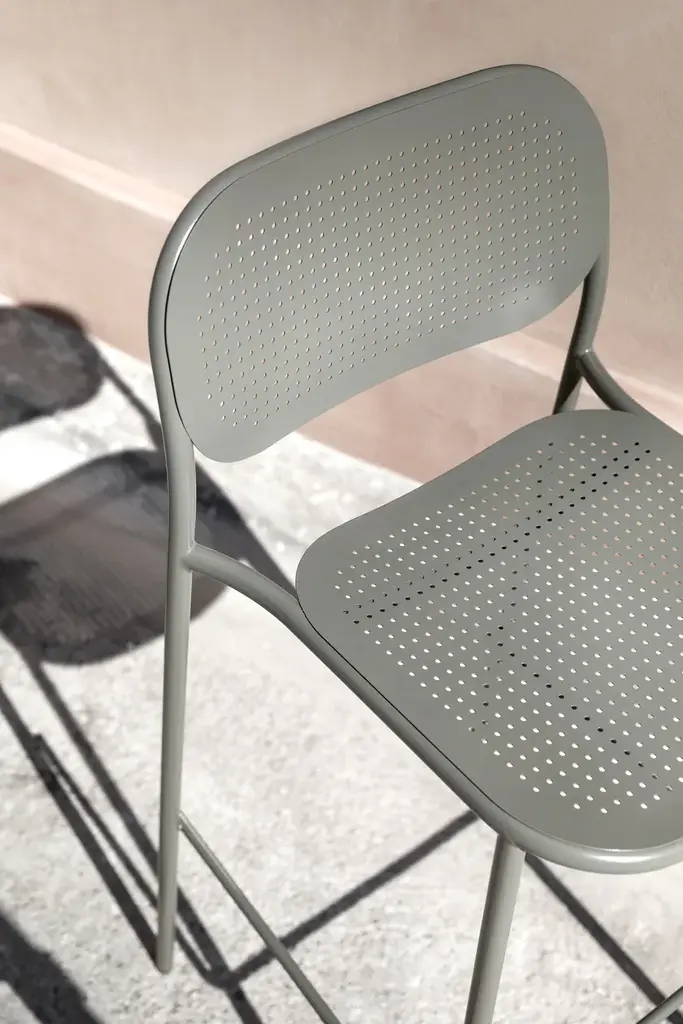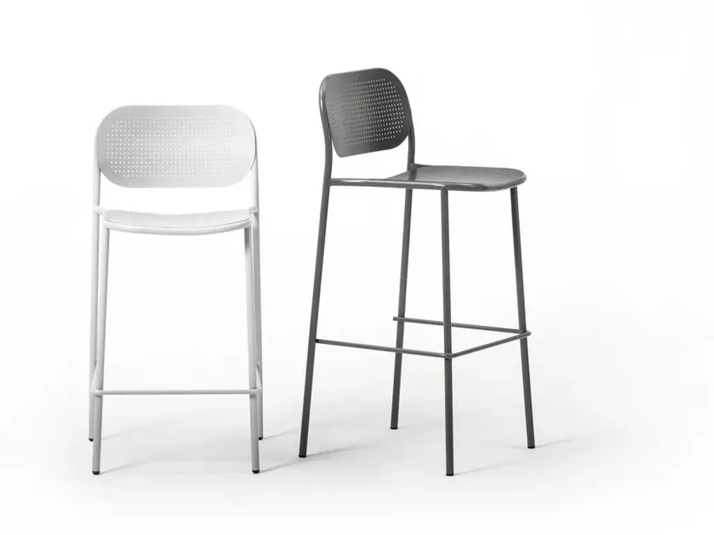 Metis Dot is a stool in two heights, metal frame, stackable with seat and back in perforated sheet metal, for indoor and outdoorMetis collection, metal structure, with seat and back in perforated sheet metal, metal wire, wood or padded, stackable, for indoor or outdoor, ideal for hotels, restaurants.