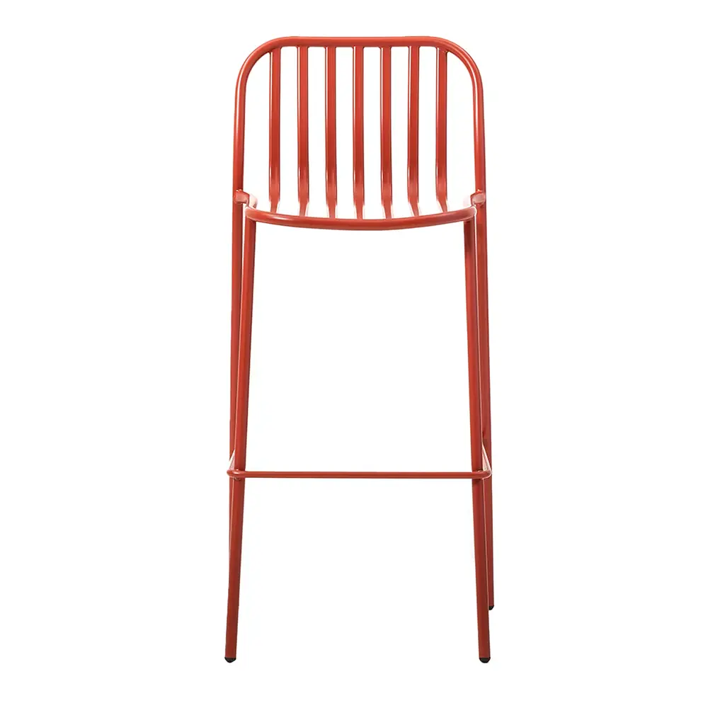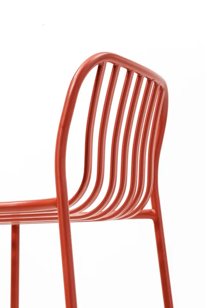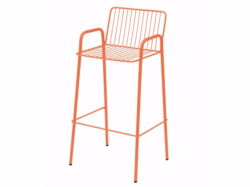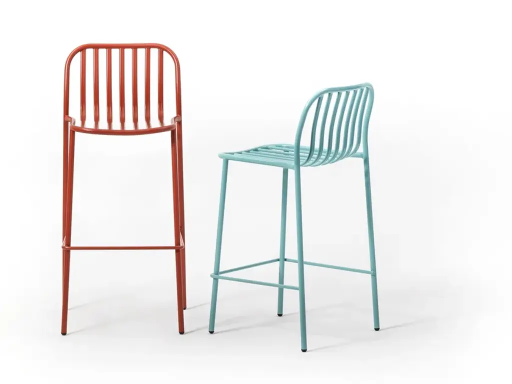 Metis Line is a stool in two heights with oval painted metal wires that run along the seat / backrest, stackable, for indoor and outdoor.Metis collection, metal structure, with seat and back in perforated sheet metal, metal wire, wood or padded, stackable, for indoor or outdoor, ideal for hotels, restaurants.