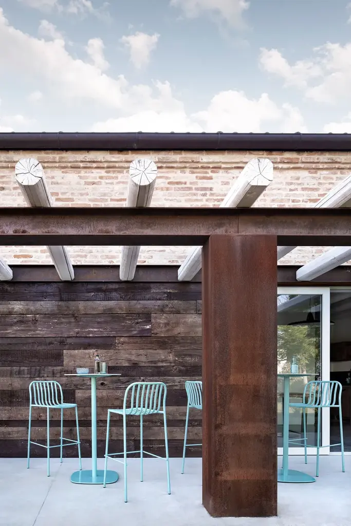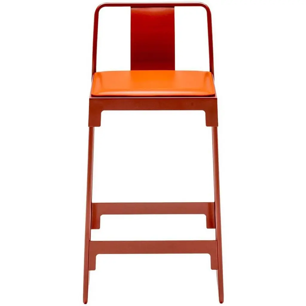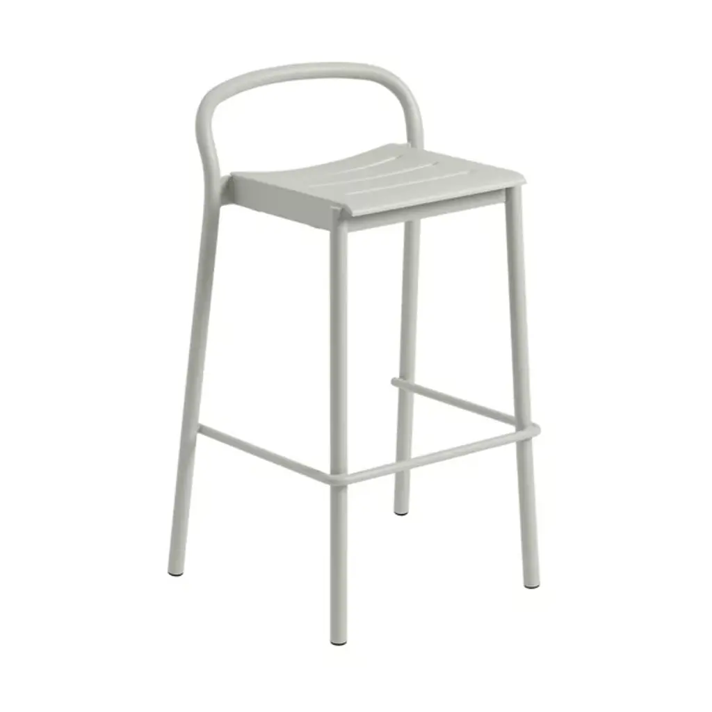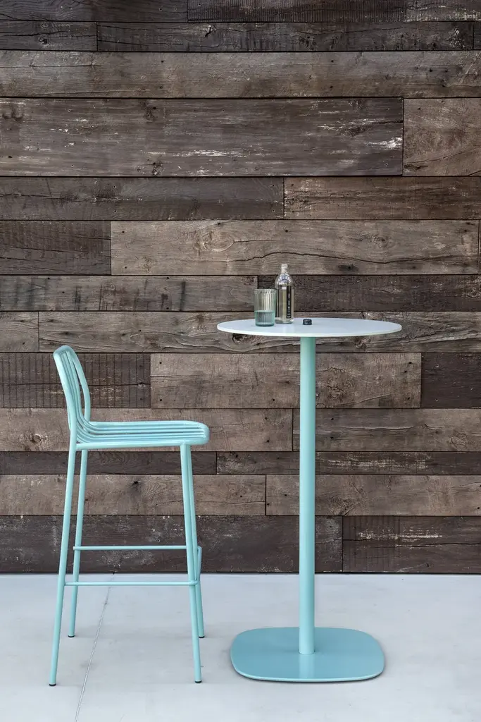 Metis Line is a stool in two heights with oval painted metal wires that run along the seat / backrest, stackable, for indoor and outdoor.Metis collection, metal structure, with seat and back in perforated sheet metal, metal wire, wood or padded, stackable, for indoor or outdoor, ideal for hotels, restaurants.