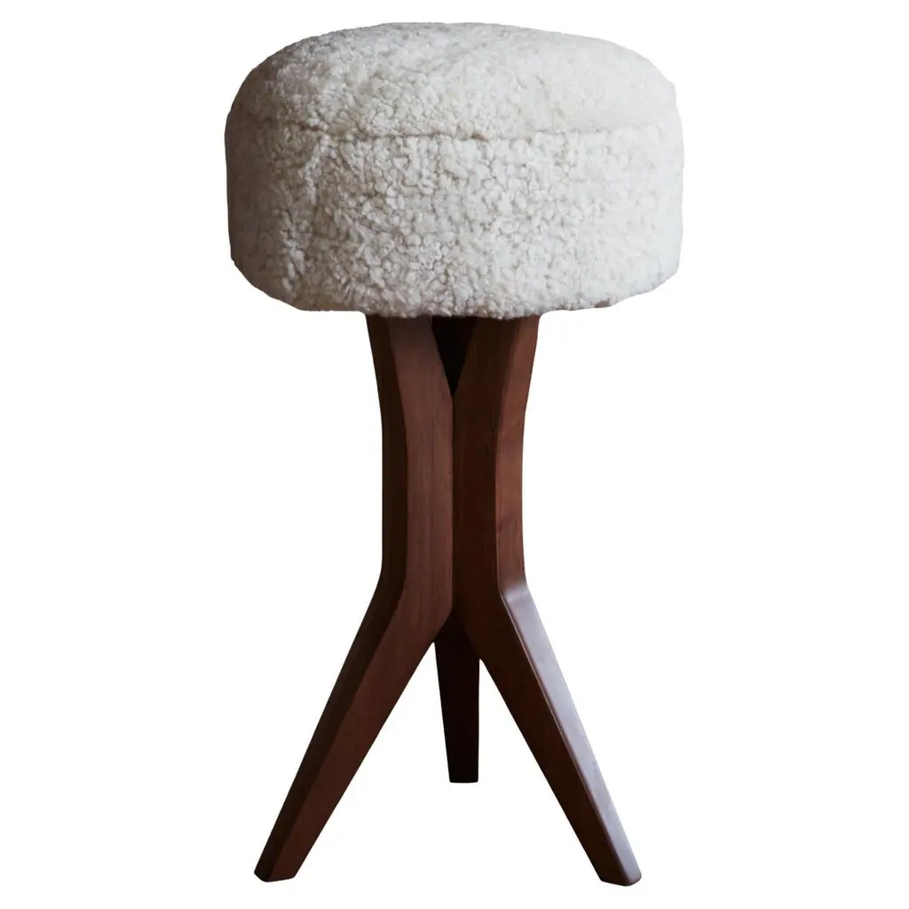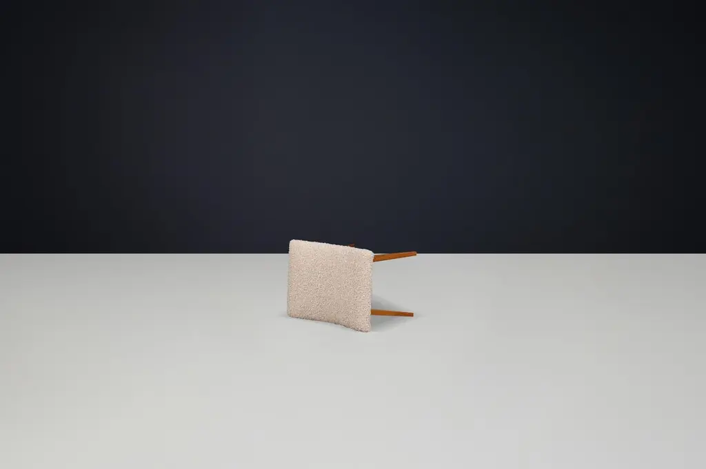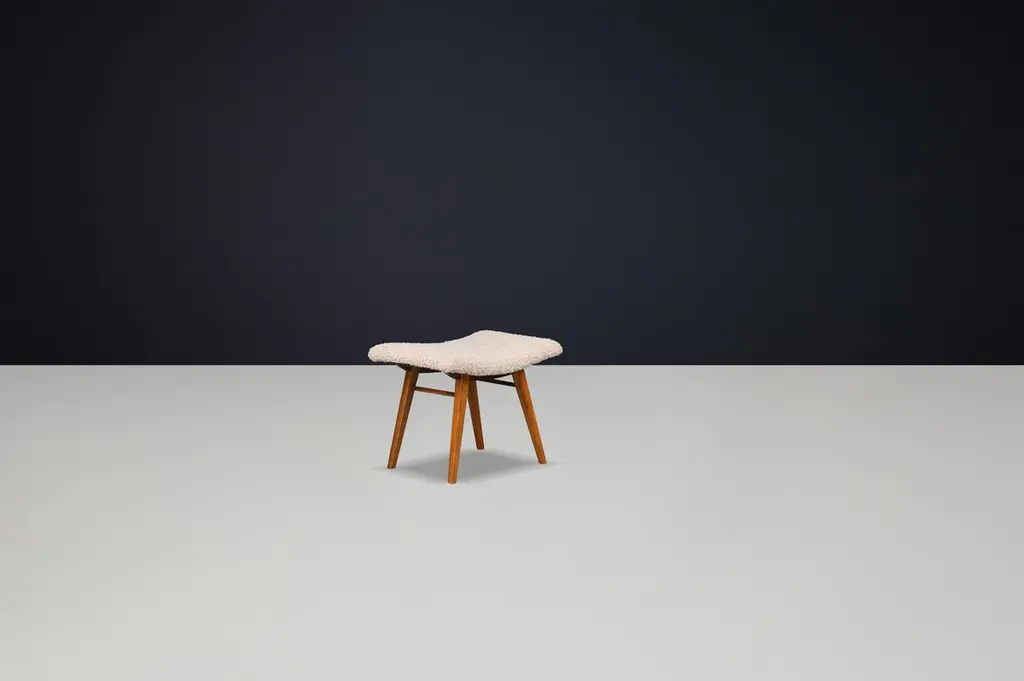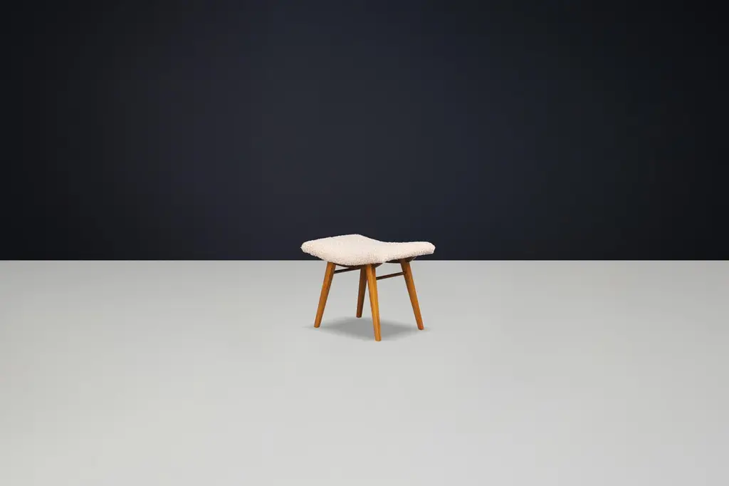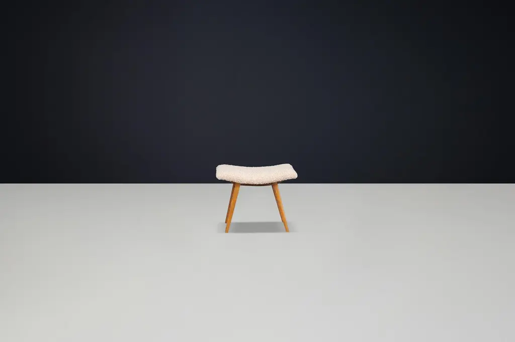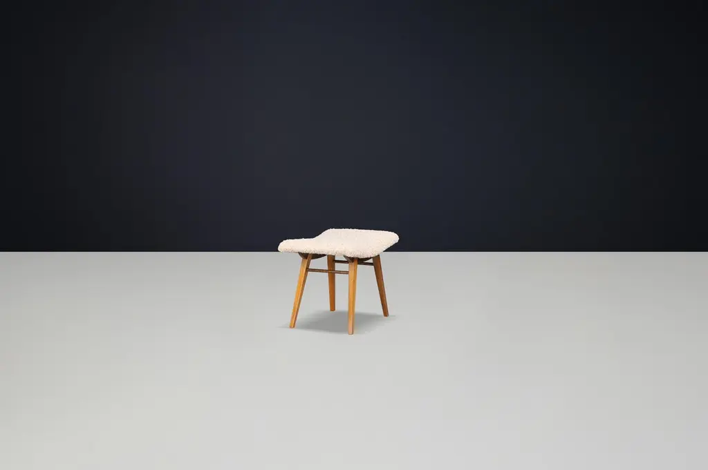 Mid-Century Modern Beechwood Stool with New Teddy Upholstery, Czechoslovakia, 1960sEmbodying the playful minimalism of mid-century design, this charming beechwood stool hails from 1960s Czechoslovakia and has been thoughtfully updated with luxurious new teddy upholstery. Its sculptural form and modest footprint make it a versatile accent piece that balances character, comfort, and practicality.Crafted from solid beechwood, the stool showcases a gently curved seat perched atop splayed legs with elegant tapering—a hallmark of Eastern European mid-century woodworking. The light-toned wood exudes warmth, and the grain detail offers natural beauty from every angle. The organic curvature of the seat is both aesthetically striking and ergonomically considered.The seat has been professionally reupholstered in a premium teddy fabric, chosen for its irresistibly soft texture and contemporary flair. The pale, bouclé-style surface provides a cozy contrast to the smooth beechwood frame, adding a layer of tactile interest and modern appeal.Perfect as a vanity stool, footrest, entryway seat, or occasional perch in a living space, this piece adapts effortlessly to its environment. Whether styled alone or as part of a collection, it introduces both sculptural form and vintage authenticity to any setting.Dimensions:Depth: 38 cmWidth: 51 cmHeight: 41 cmSeat Height: 47 cmCondition:Excellent vintage condition. Frame shows minor signs of wear consistent with age. Upholstery is brand new.Quantity available: 6. Price listed per item.Timeless, compact, and comfortable, this 1960s Czech stool is a perfect representation of functional artistry from the golden age of modern design. Ideal for collectors or decorators looking to introduce authentic vintage charm with a fresh twist.