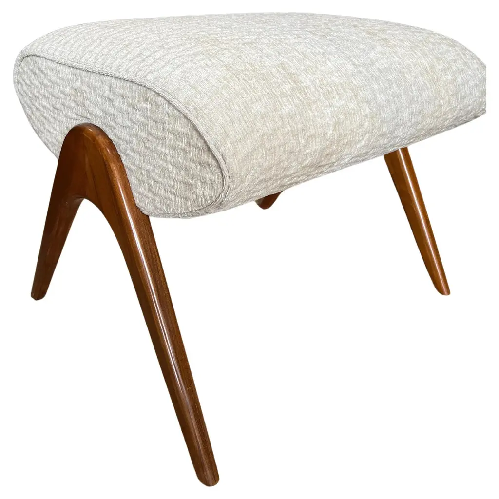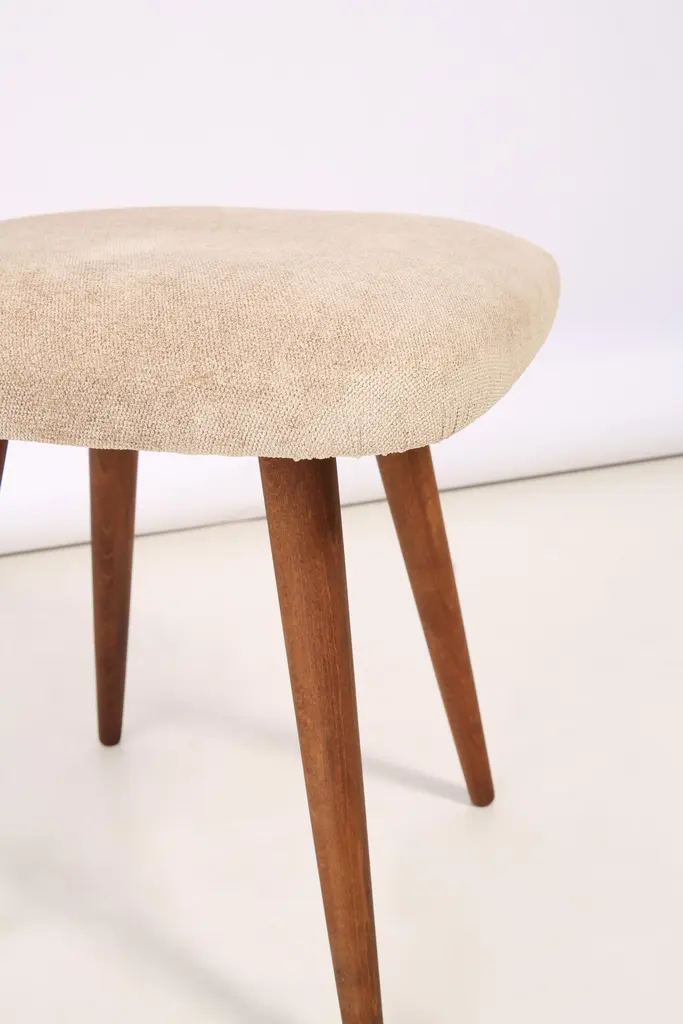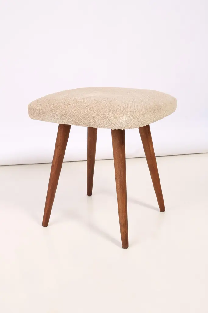 Stool from the turn of the 1960s and 1970s. Beautiful, well crafted beige upholstery. The stool consists of an upholstered part, a seat and wooden legs narrowing downwards, characteristic of the 1960s style. We can prepare this stool also in another color of fabric and wood.