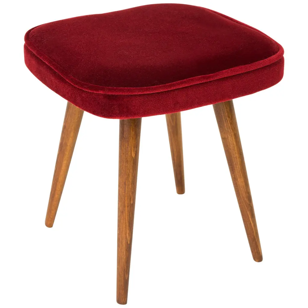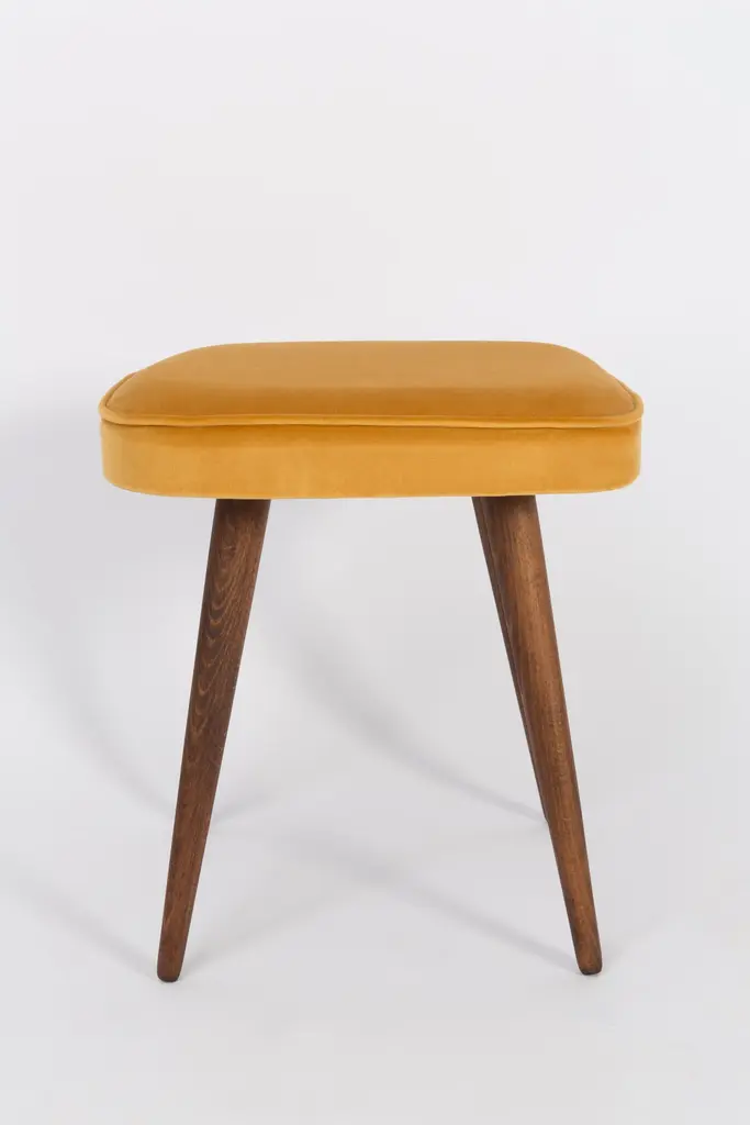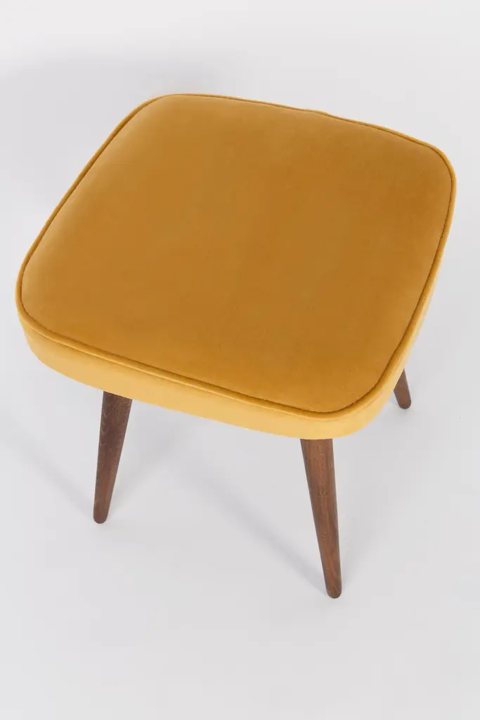 Stool from the turn of the 1960s and 1970s. Beautiful mustard velor upholstery. The stool consists of an upholstered part, a seat and wooden legs narrowing downwards, characteristic of the 1960s style. We can prepare this pair also in another color of fabric and wood.