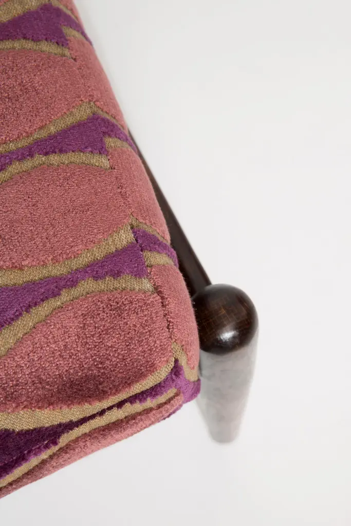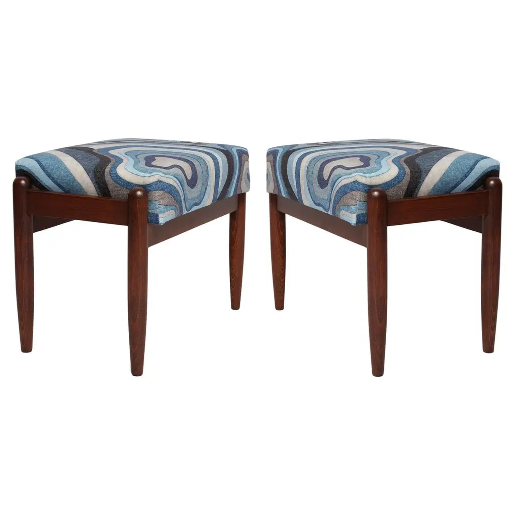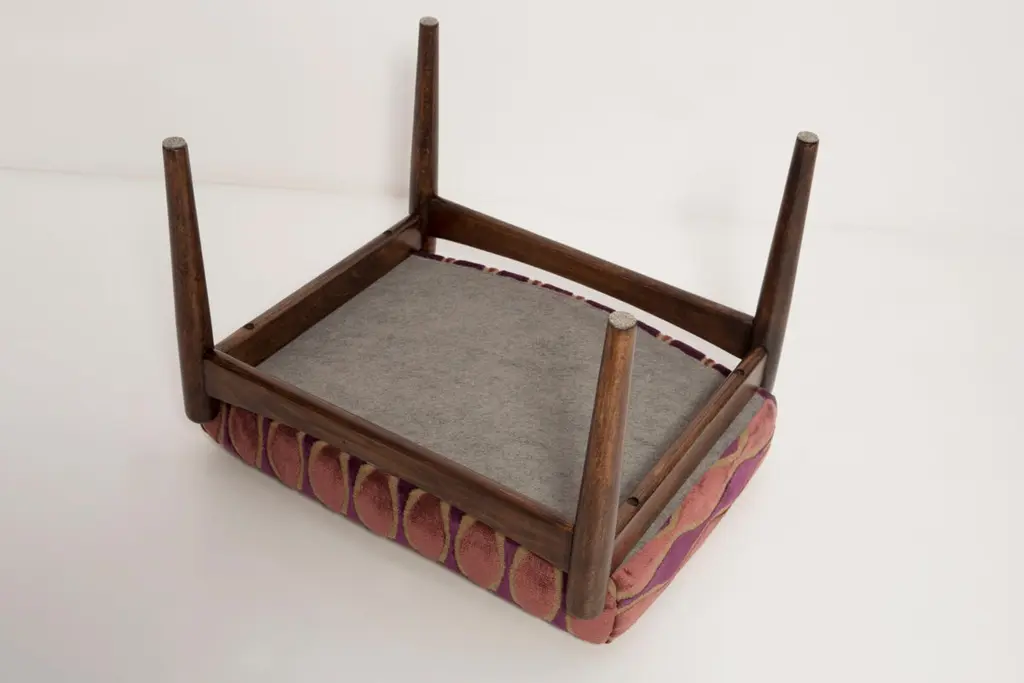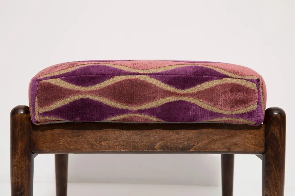 Stool from the turn of the 1960s. The stool consist of an upholstered part, a seat and wooden legs narrowing downwards, characteristic of the 1960s style.Stool was designed by Edmund Homa, a Polish architect, designer of industrial design and interior architecture, professor at the Academy of Fine Arts in Gdansk.We can prepare this stool also in another option of fabric and wood.Please chceck the last picture with velvet color samples.