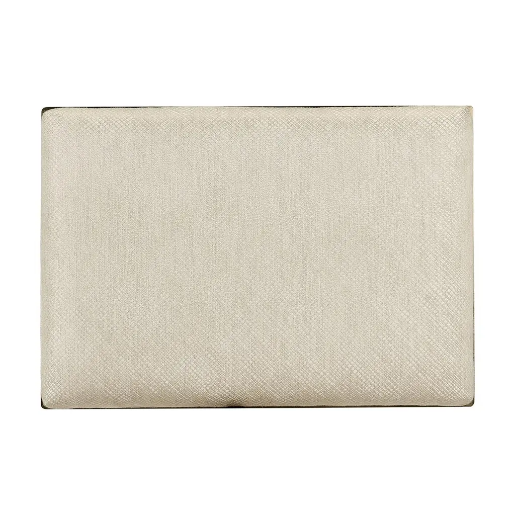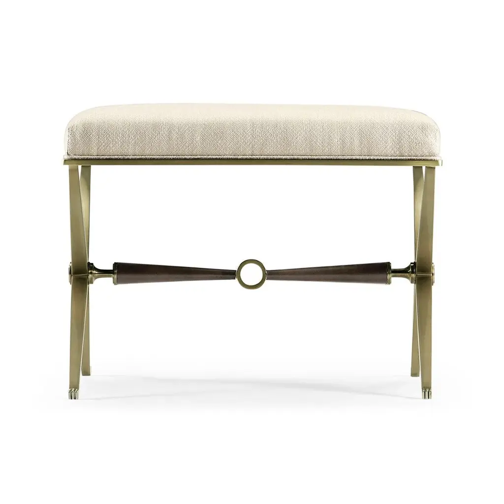 Mid Century X Stool, inspired by traditional Spanish ironwork, the base is fabricated from steel and finished in a light, champagne patina. The box cushion seat is upholstered in a performance fabric.Dimensions: 25.5" W x 18" D x 19.25" H