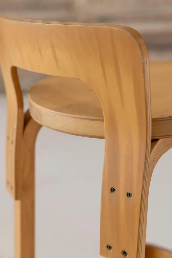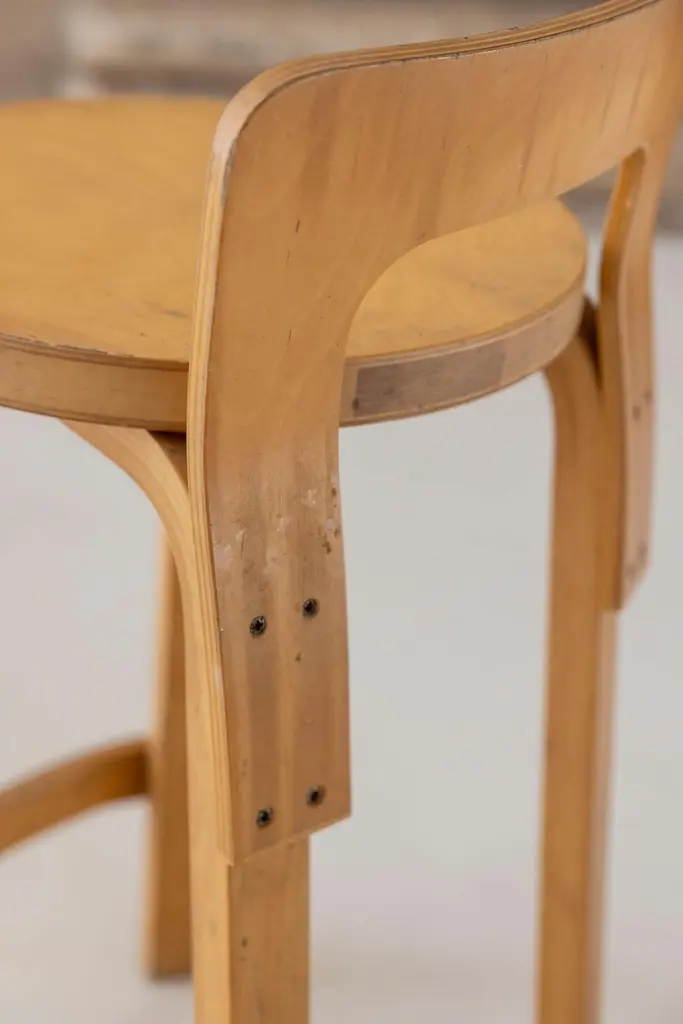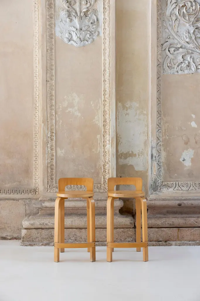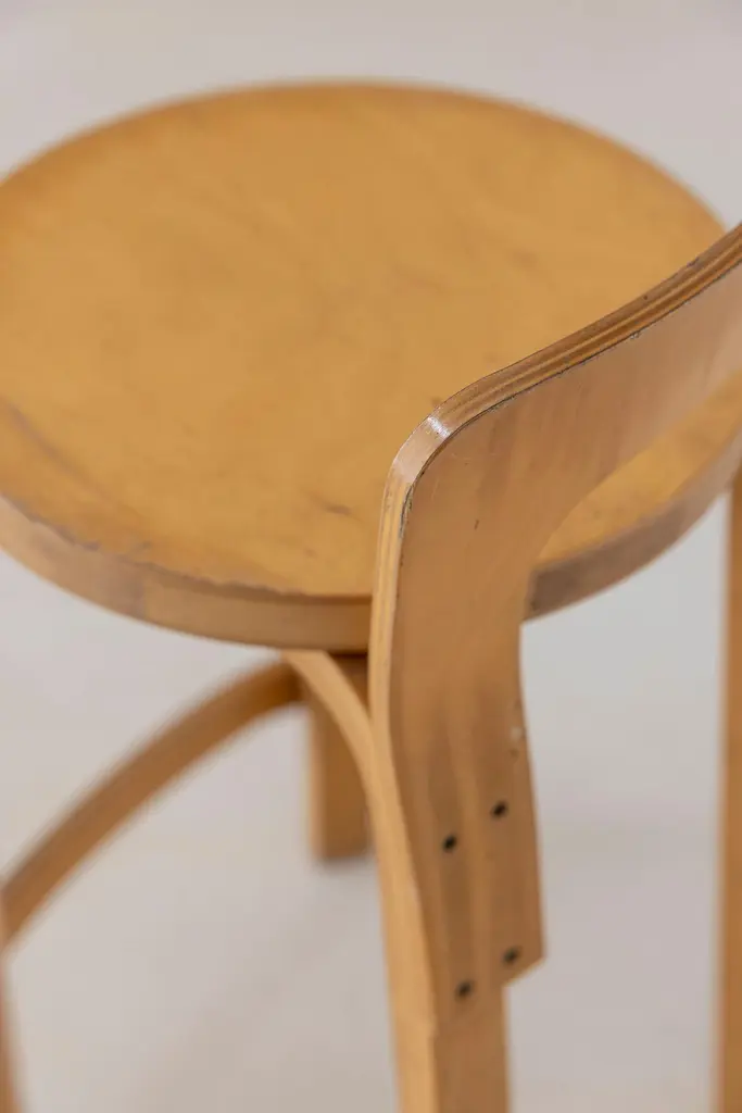 The K65 model stool was designed by Alvar Aalto between 1933 and 1935. The height is designed for combinations with high tables or counters. The low backrest provides the right support for the back, and the curved crosspiece at the bottom provides good support for the feet. The K65 model features the use of curved birch plywood. The K65 series has represented style and substance since the 1930s. Manufactured in Finland by Artek. Denmark, 1970s Available 2 set of 2 stools