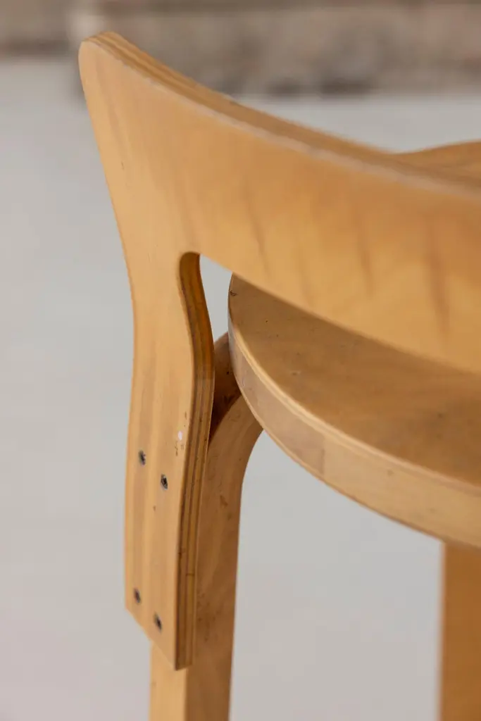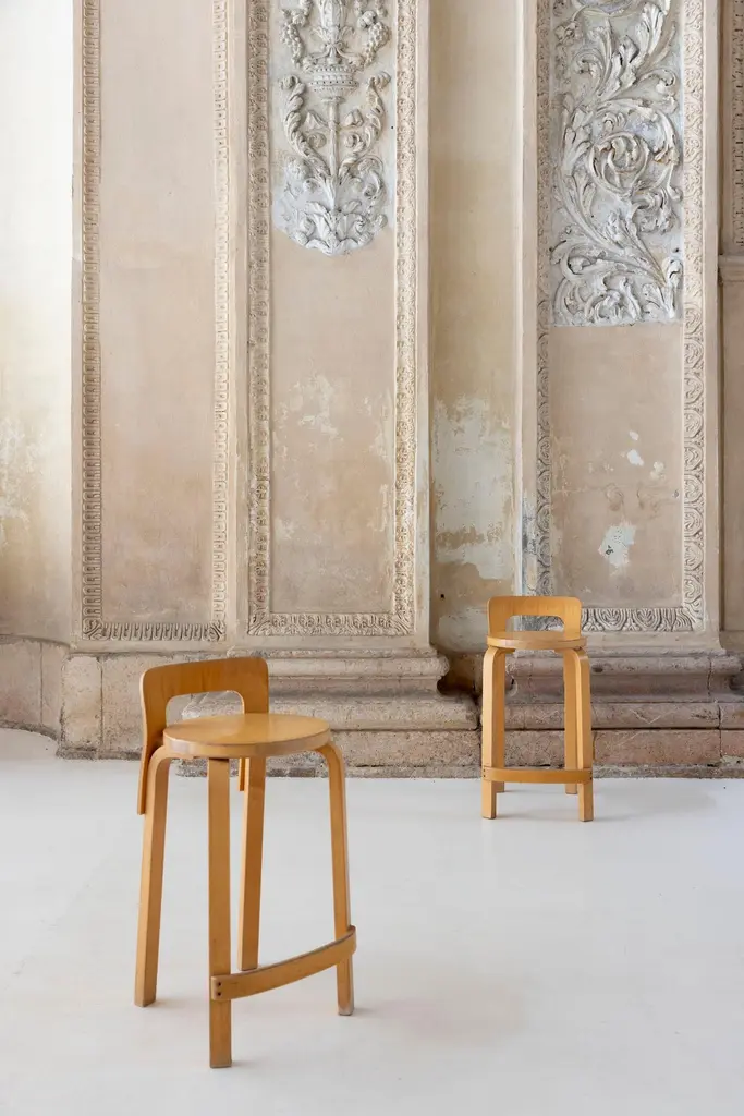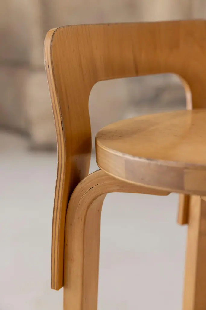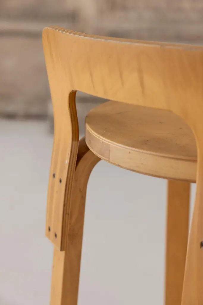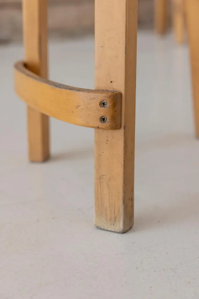The K65 model stool was designed by Alvar Aalto between 1933 and 1935. The height is designed for combinations with high tables or counters. The low backrest provides the right support for the back, and the curved crosspiece at the bottom provides good support for the feet. The K65 model features the use of curved birch plywood. The K65 series has represented style and substance since the 1930s. Manufactured in Finland by Artek. Denmark, 1970s Available 2 set of 2 stools