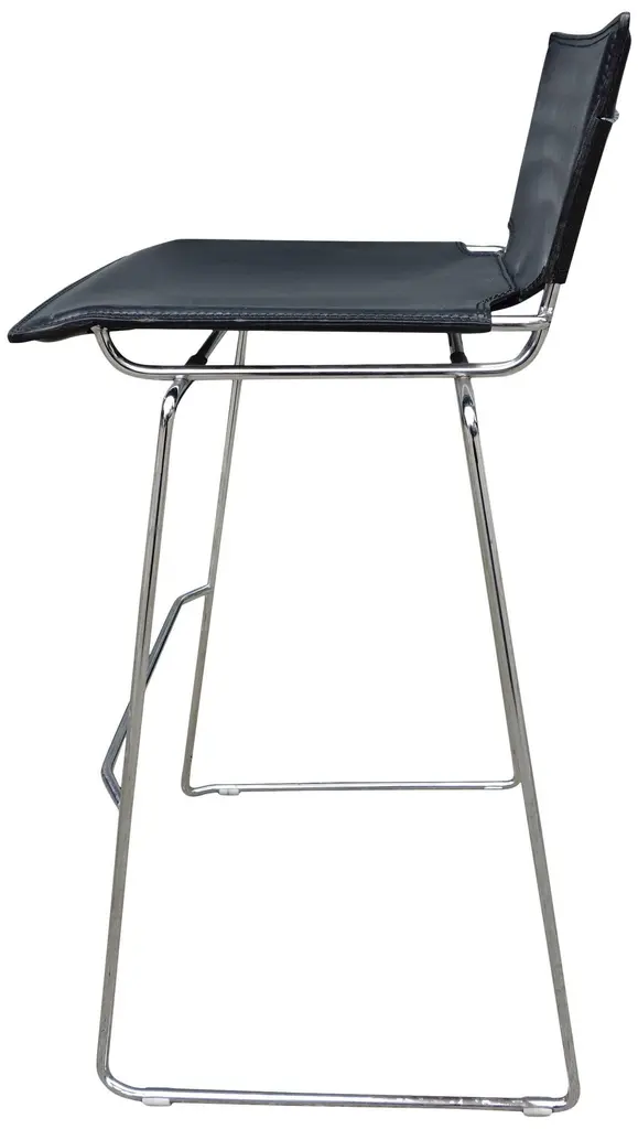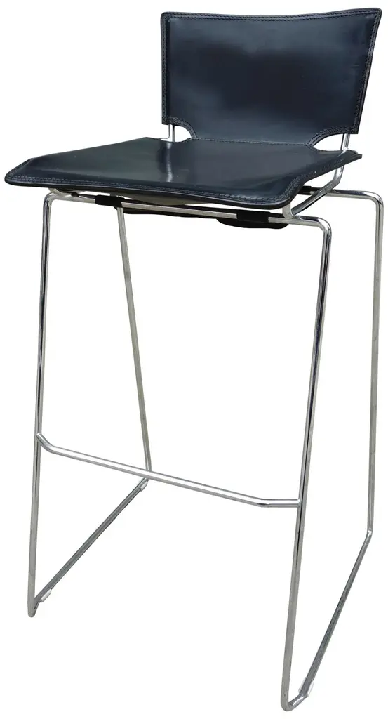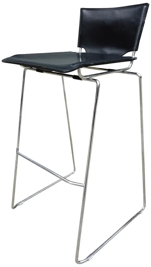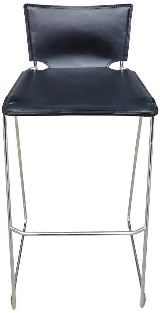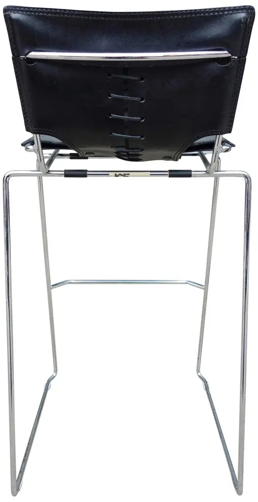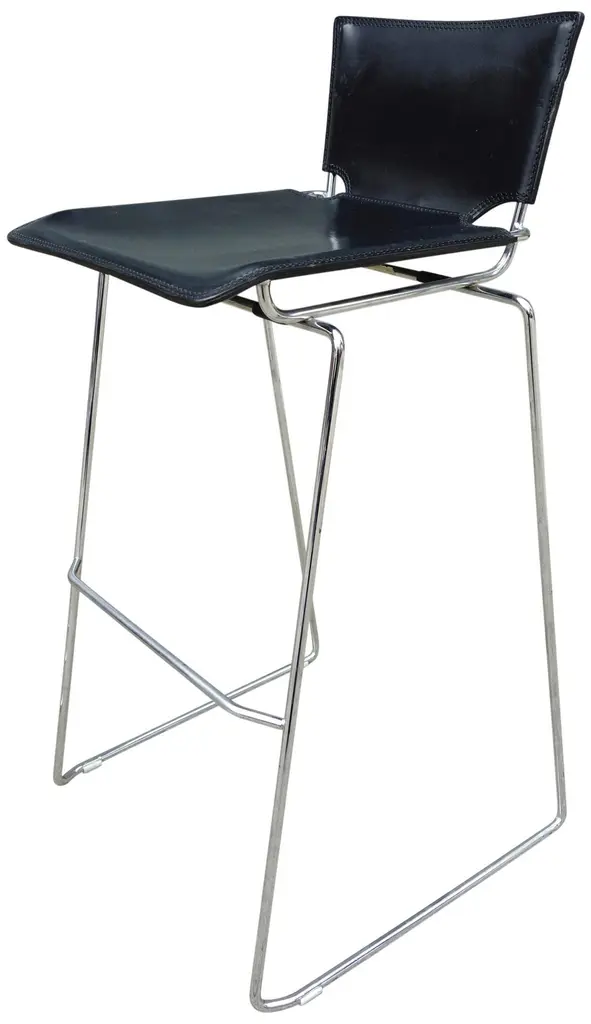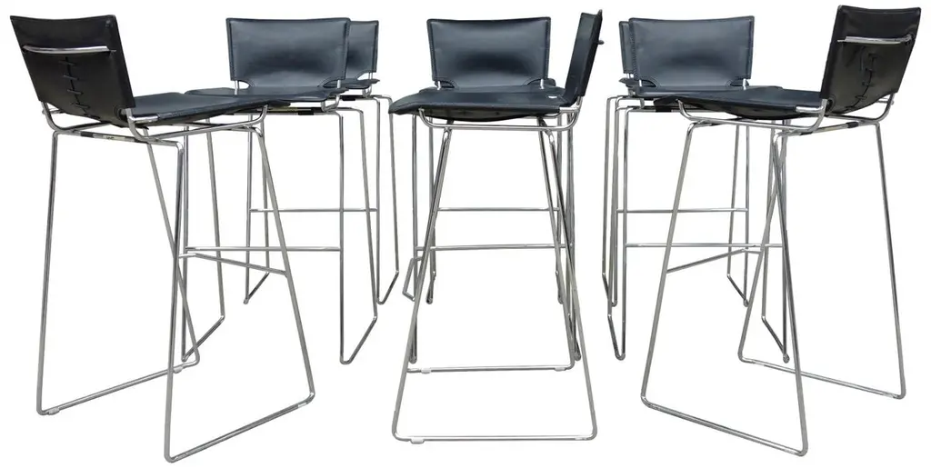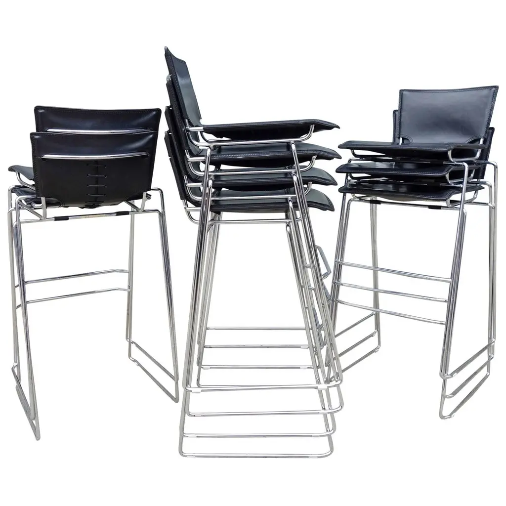 Beautiful and sleek set of 9 stackable stools designed by Toyoda Hiroyuki for ICF. Thick black leather covering a heavily chromed base. Wonderful details of stitched and laced leather. These can easily be stacked in groups of 5 as space saving chairs or in commercial situations with an added touch of luxury (as seen at the Lincoln Center.) Leather has some impressions from use showing honest and normal wear. Looks great with Knoll Spoleto chairsMeasures: seat width 14"seat depth 16"base width 16"seat height 27.5"seat bach height 8"total height 34.5".