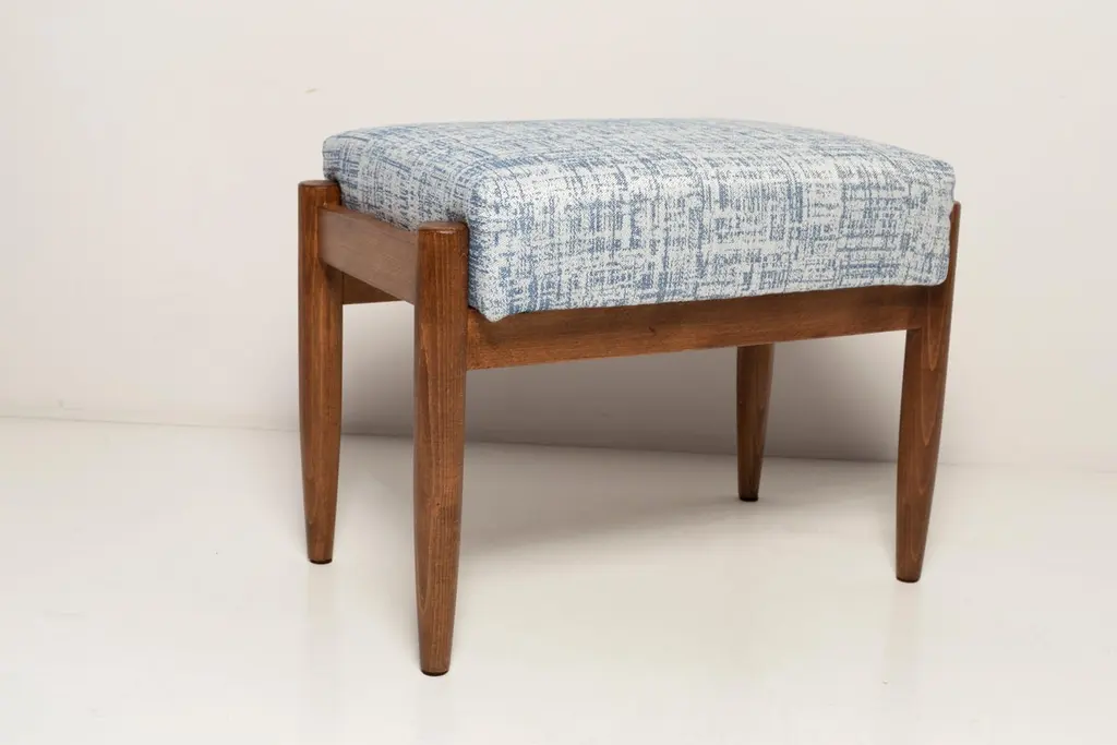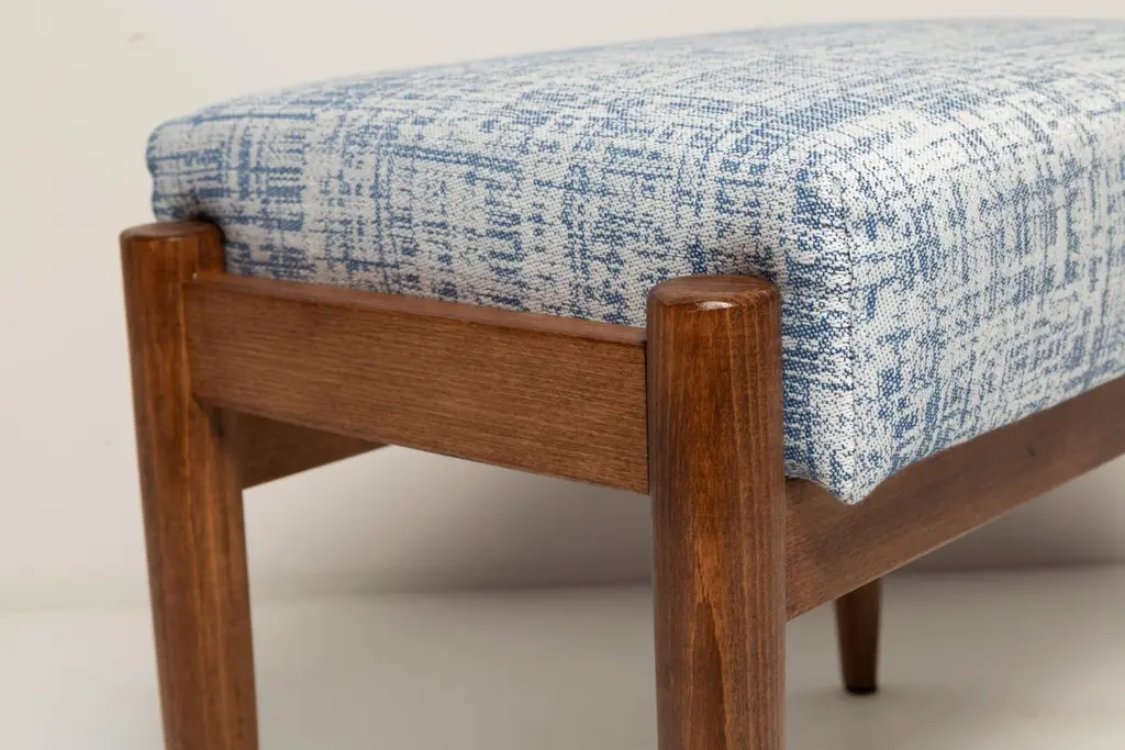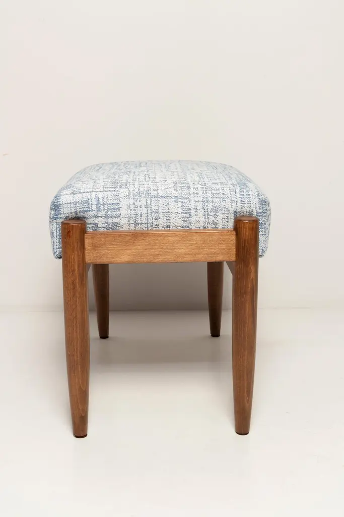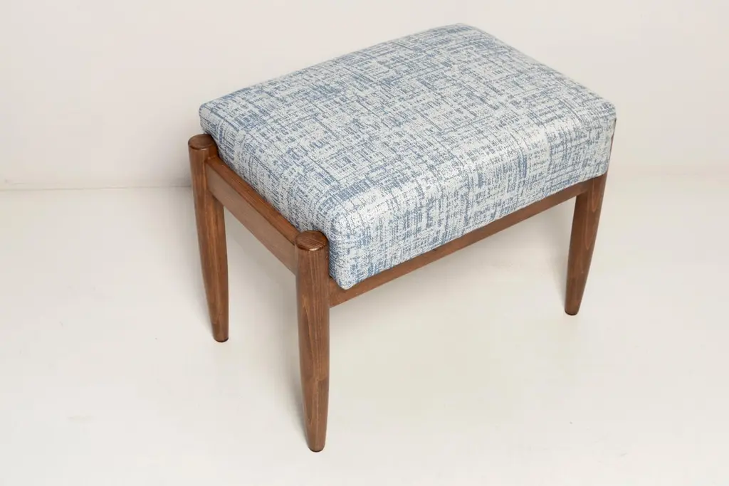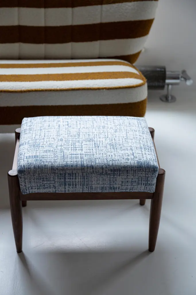 Stools from the turn of the 1960s. Beautiful white and blue high quality linen upholstery. The stools consists of an upholstered part, a seat and wooden legs narrowing downwards, characteristic of the 1960s style. We can prepare this stools also in another option of fabric and wood. Please check the last pictures with color samples.