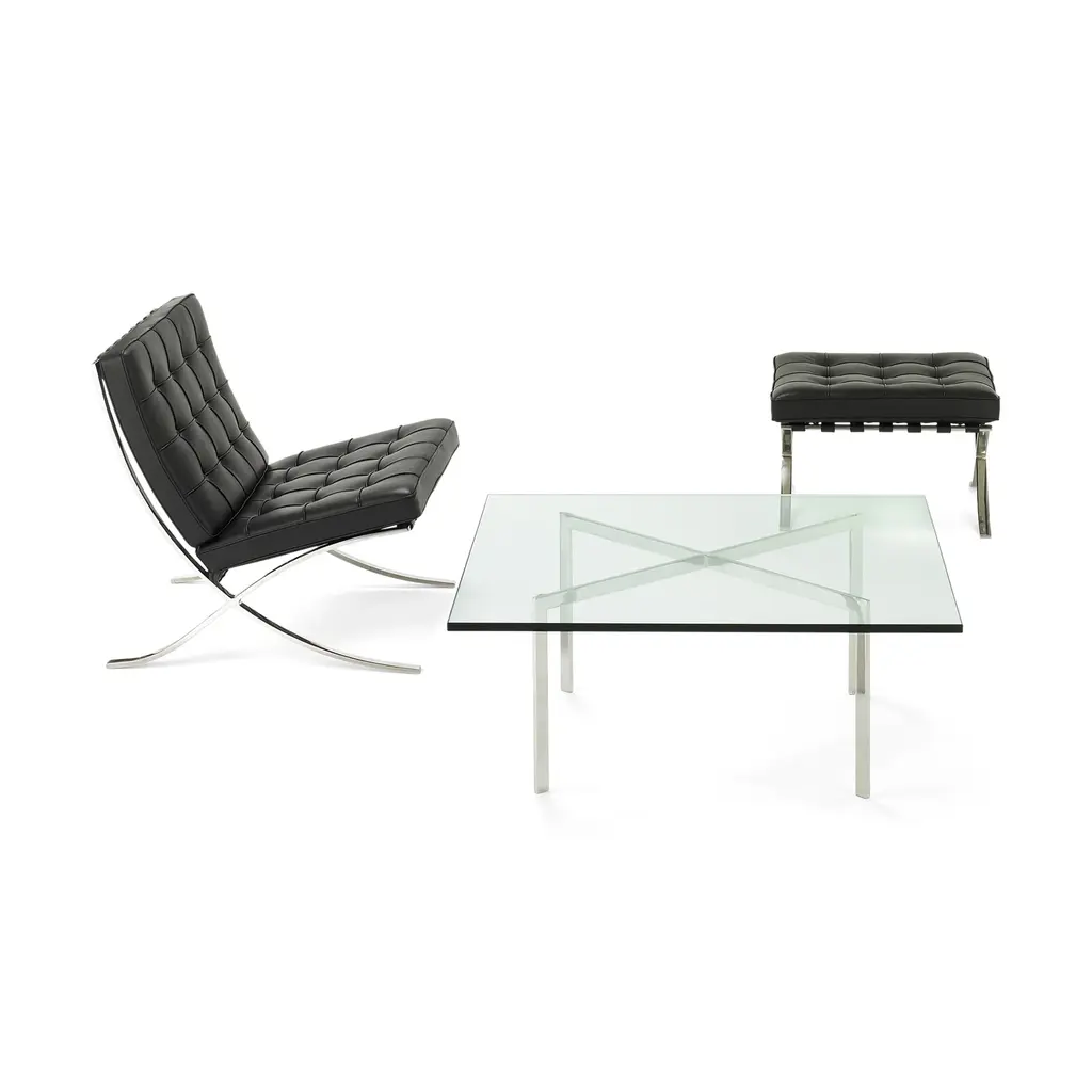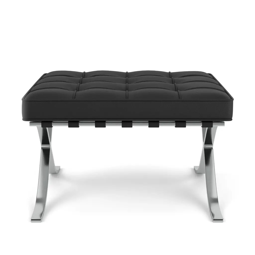 Designed in 1929 by modernist master Mies van Der Rohe, this stool is made to accompany the Barcelona Chair or it can also live alone, offering a stylish seat in your home. Distinguished by exceptional craftsmanship, the Barcelona Stool—an object in MoMA’s collection—is upholstered with 18 individual panels of black leather produced from a single cowhide. The panels are cut, hand-welted and hand-tufted with leather buttons. The premium-quality cushions are made from highly resilient urethane foam with down-like dacron polyester fiberfill. The stool’s polished chrome frame is hand-buffed to a mirror polish, and the seven leather upholstery strappy are attached with aluminum rivets. The Barcelona Stool is built and handmade in Italy to Mies van der Rohe’s exacting standards and measures 14.75h x 25w x 23.25”d. Knoll is a manufacturer with work in MoMA’s collection.