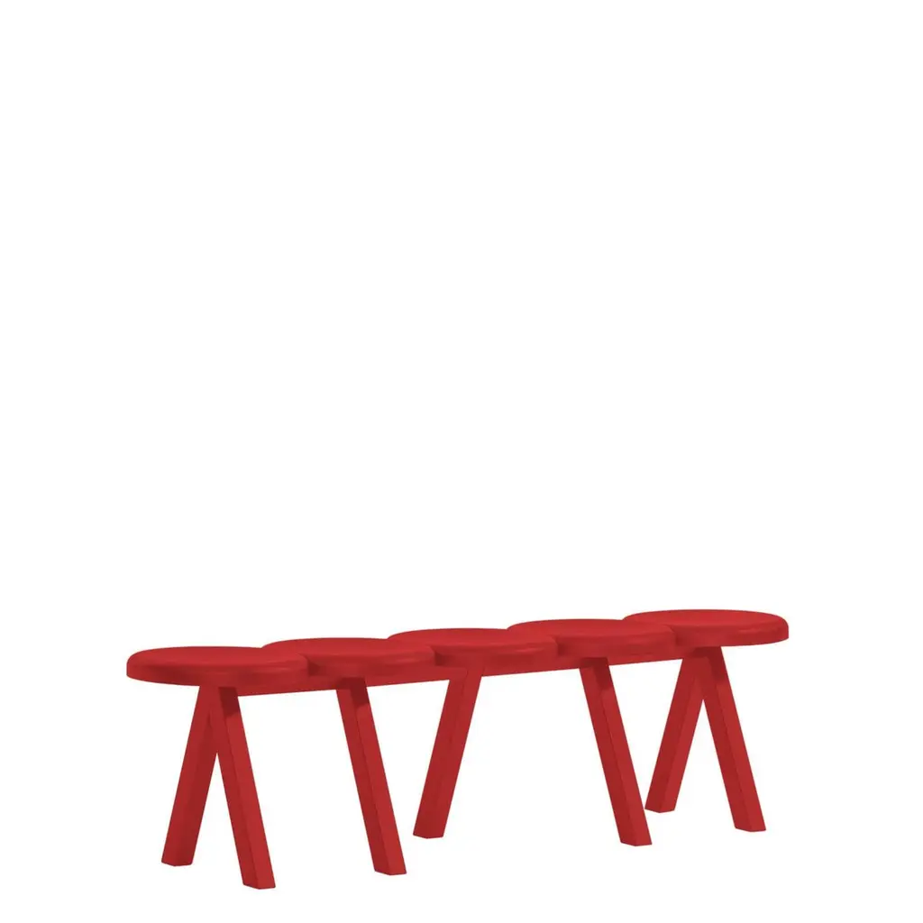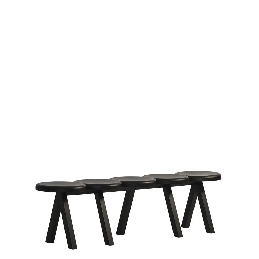 Millepiedi was inspired by the archetypal 3 legged milking stool, a simple minimalistic object yet intriguing and useful. The repetition emphasises, in a playful way, the beauty of the natural material and the skilful craftsman work required to assemble the various elements. The multiplication of the legs brings up spontaneously the image of the caterpillar “Millepiedi” (millipede in Italian). The final result is a versatile bench which brings together beauty, elegance and surprise. Bench with five seats and spaced legs, made entirely of solid ash in the “open pore” ebonized finish.