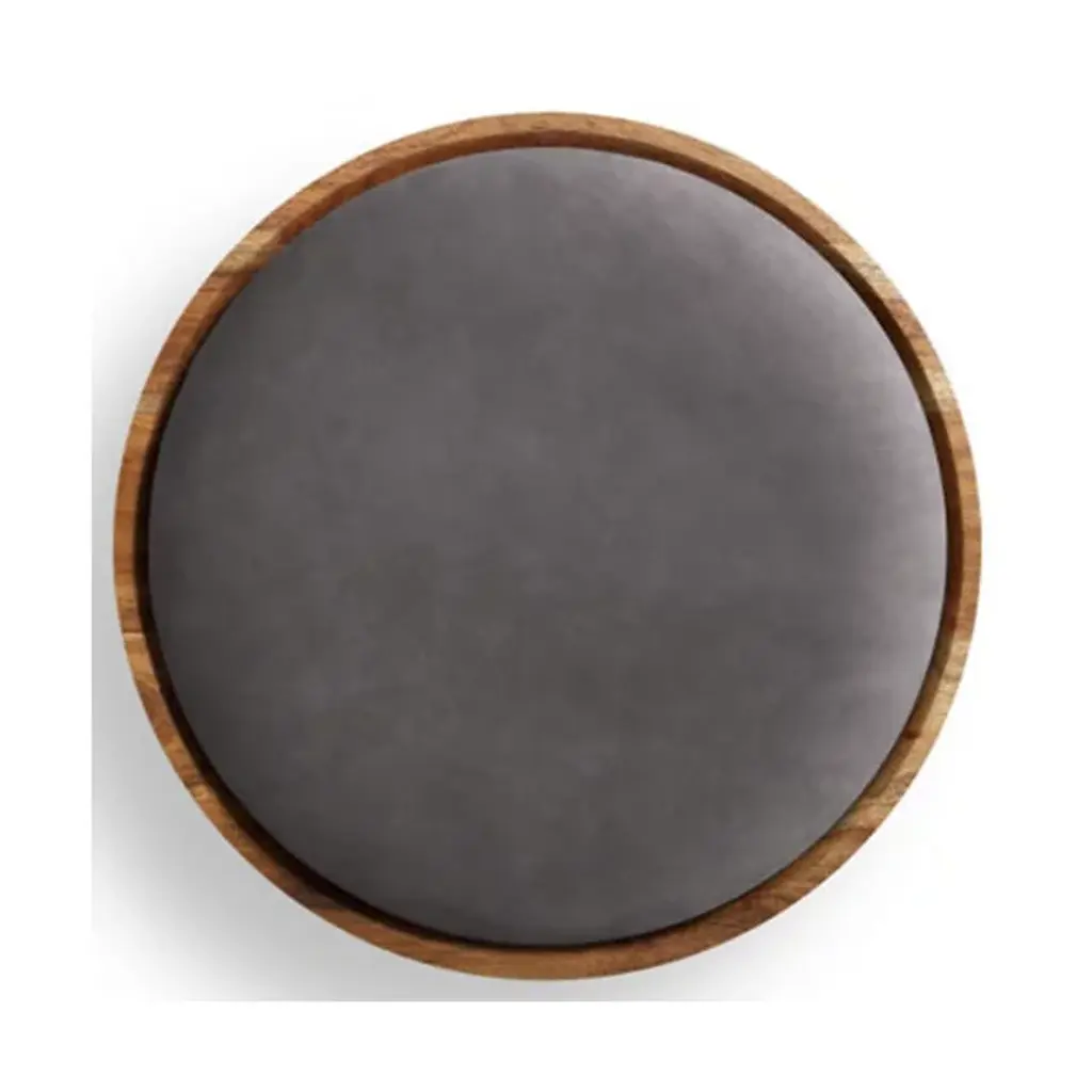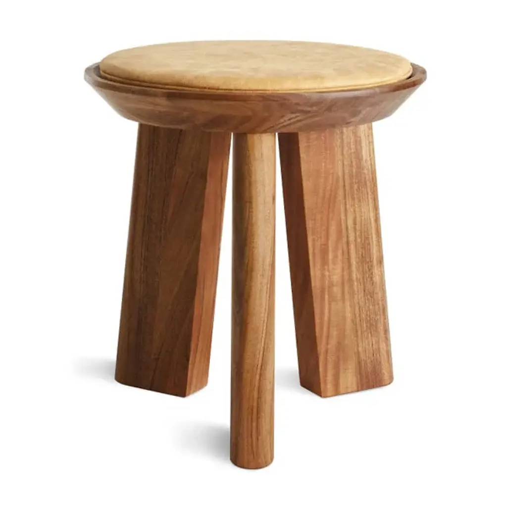 The Mimi Stool from Blu Dot is always there for you as an extra seat, convenient table, or eye-catching décor. The stool presents itself with dramatic shapes like a modern sculpture. It points the eyes upwards with the tapering lines of its thick solid wood legs. These legs show off flat planes of alluring wood grain texture. Resting on top, a dish-shaped container receives a leather seat pad to create a button-like visual. The seat pad’s smooth, rich texture feels nice against the hands. This pad is flat enough to hold one’s items and plump enough to offer pleasant seat support.