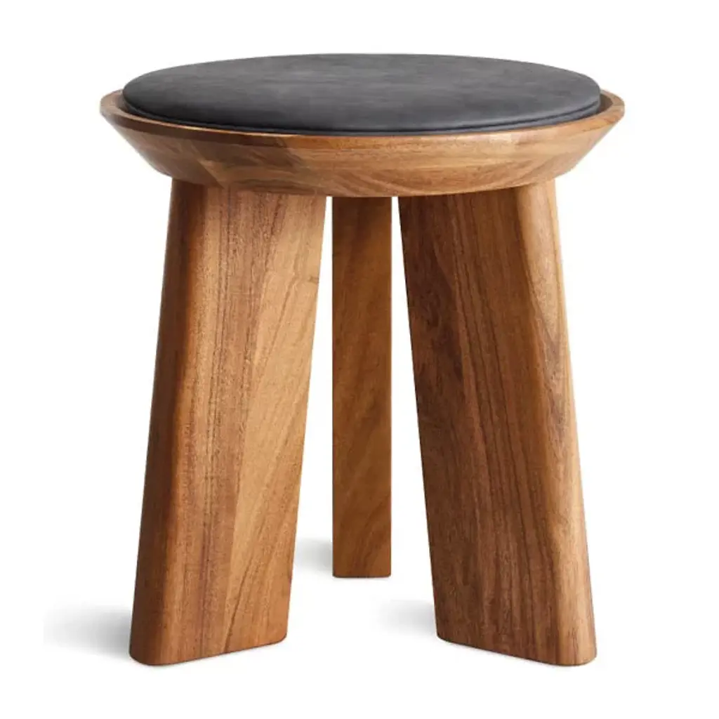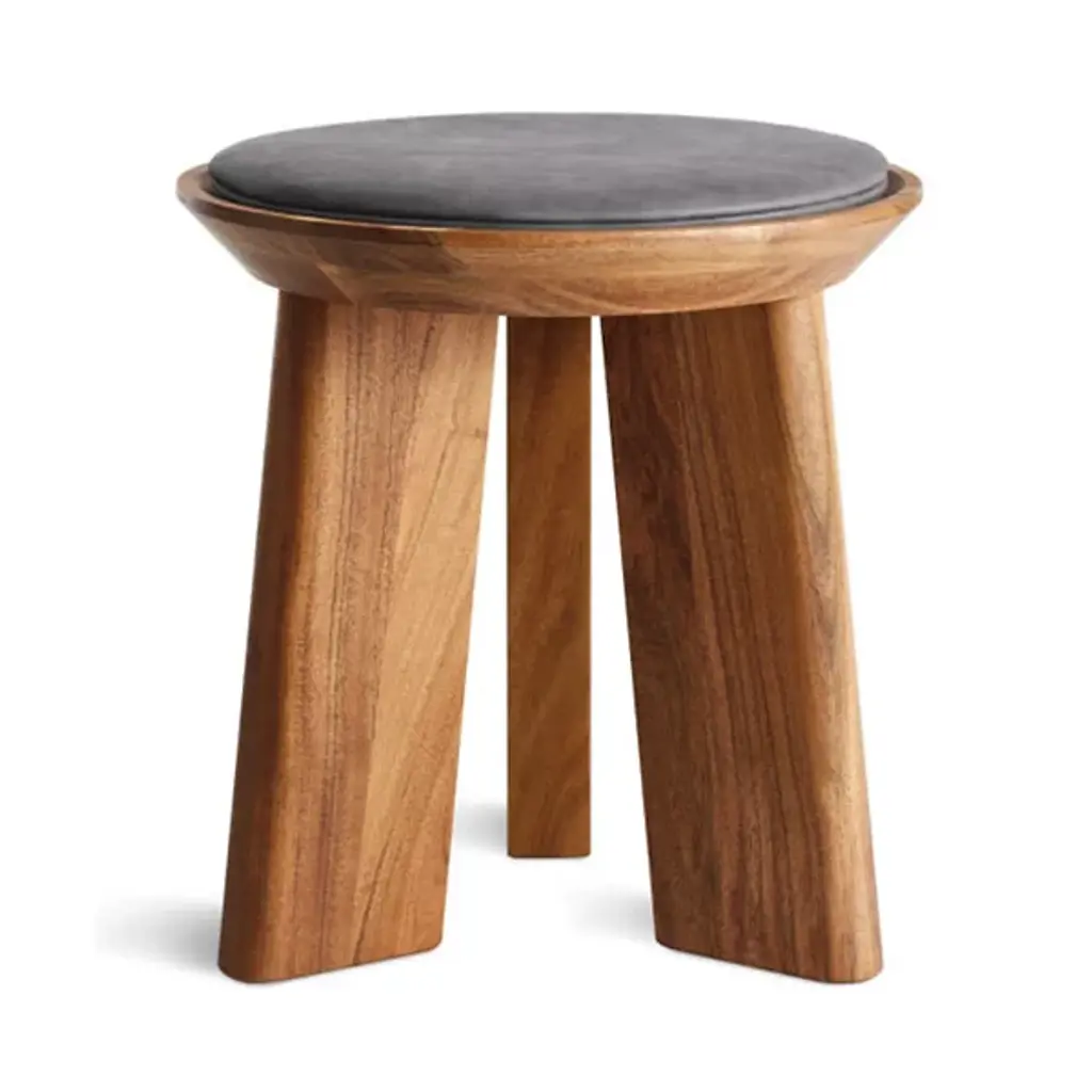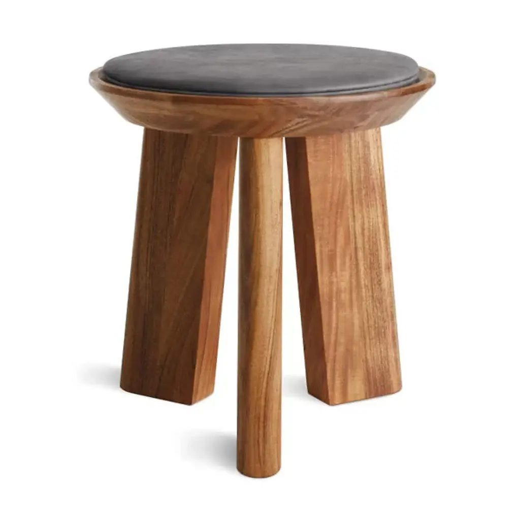 The Mimi Stool from Blu Dot is always there for you as an extra seat, convenient table, or eye-catching décor. The stool presents itself with dramatic shapes like a modern sculpture. It points the eyes upwards with the tapering lines of its thick solid wood legs. These legs show off flat planes of alluring wood grain texture. Resting on top, a dish-shaped container receives a leather seat pad to create a button-like visual. The seat pad’s smooth, rich texture feels nice against the hands. This pad is flat enough to hold one’s items and plump enough to offer pleasant seat support.