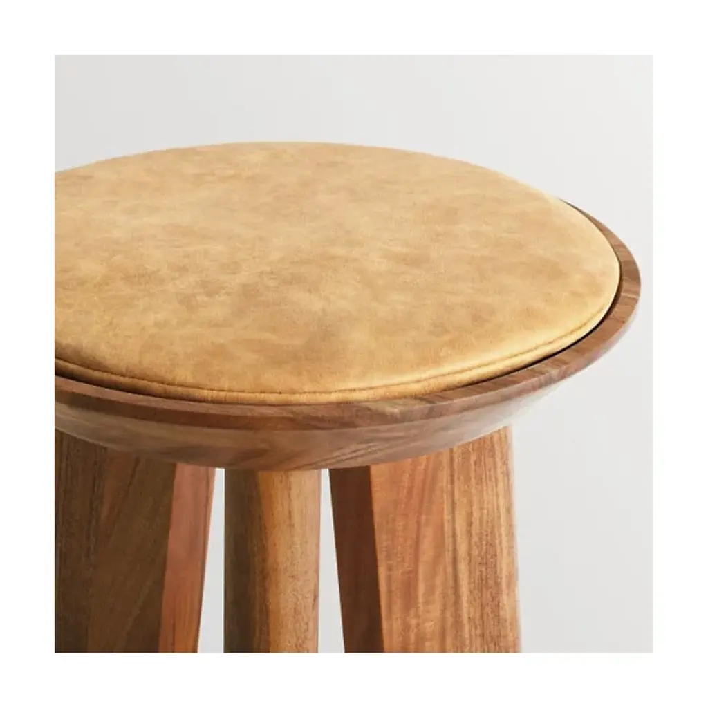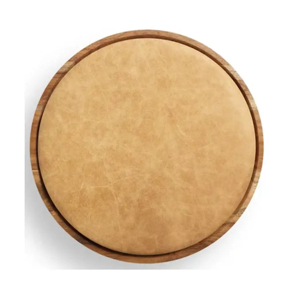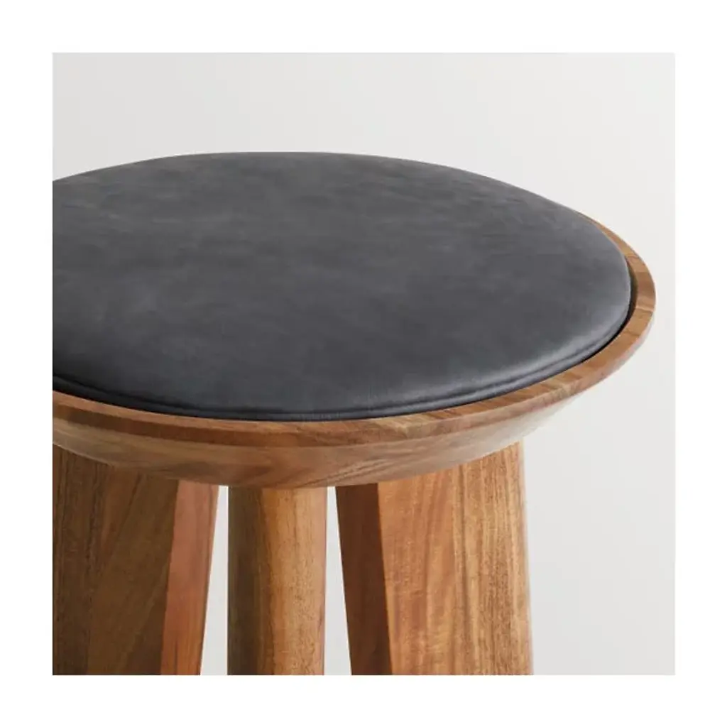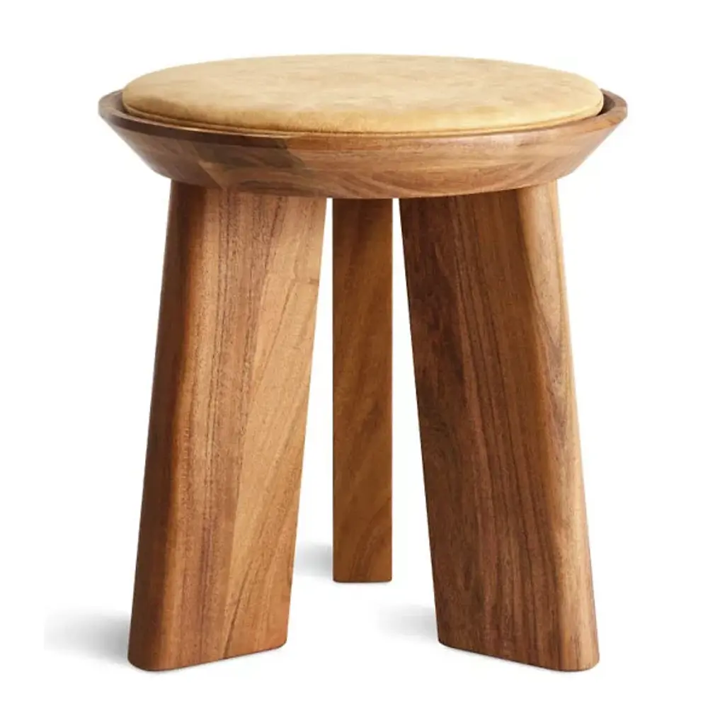 The Mimi Stool from Blu Dot is always there for you as an extra seat, convenient table, or eye-catching décor. The stool presents itself with dramatic shapes like a modern sculpture. It points the eyes upwards with the tapering lines of its thick solid wood legs. These legs show off flat planes of alluring wood grain texture. Resting on top, a dish-shaped container receives a leather seat pad to create a button-like visual. The seat pad’s smooth, rich texture feels nice against the hands. This pad is flat enough to hold one’s items and plump enough to offer pleasant seat support.