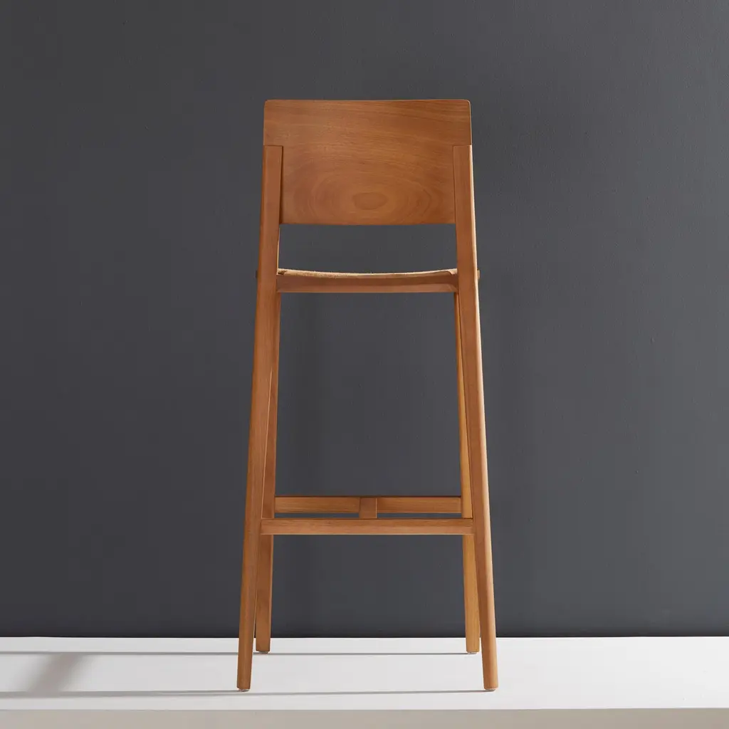 Our Evo collection is based in the harmonic fusion between geometrical forms in a modern interpretation of wood archetypes, combining a rational defined outcome with the warmth of organic shapes in a fluid continuous outline that merges the elements in a pleasant graphical solution, that invites to seat and enjoy the living and dining areas. A design style that can be defined as modern Brazilian design with a Scandinavian twist, interpreted in Minimalist contemporary key and a touch of retro warmth typical from the wood work construction. All elements of the EVO stools are precisely engineered to input hardwood blocks to a Hybrid 5-Axis CNC milling machine that carves and sculpt the wood with precision to achieve minimal thicknesses, transitions between elements and superb definition, every little piece of this stool passes in a array of manual crafting processes until a they are manually assemble together to create the final product, that contains precise and tangent junctions between pieces that discard the need of metal pieces of any kind, the combination of this attributes give life to a sturdy and durable object that will live thru out many generations to come.Together with the design style and engineering we dedicated tremendous time to balance the ergonomics, focusing on the user and giving the comfort it needs. The back portion of the chairs and stools fully support the user weight embracing the body back thru a generous arch implemented in the wood sculpting process. Expect a stunning, elegant object, designed with passion in a project that evolved with our studio story, the stools and chairs are available with upholstered seatings, or all wood. This item is possible to customize in seat height, as an example seat height in 26 inches (66cm) as counter seat height.We use only high quality, premium woods, the, tonality and veins drawing vary from item to item, been a living material. COM and COL are available for the seating portion.