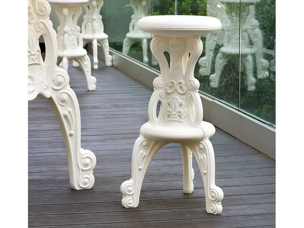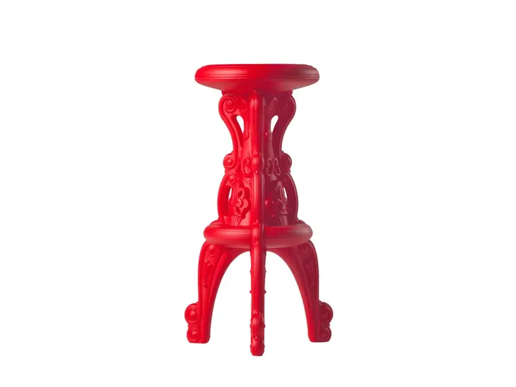 The high stool Mister of Love belongs to Design Of Love Collection. Matching with the high table Master Of Love, this stool reminds the luxurious and rich baroque style furniture, but it is realized in modern and colourful material. With an ironic and pop design, Mister Of Love has got a circle seat and three rich-indetails legs. It is suitable with indoor and outdoor settings, for contracts and unforgettable events.Finishes:- Standard color- Lacquered- Matt lacquered