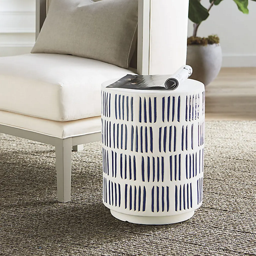 A punch of bold blue color and texture to enliven any space, indoors or out. Our Mitzi Ceramic Garden stool has debossed vertical stripes hand painted in vivid indigo to accentuate the graphic global look. Open base is slightly recessed for a light, floated feel. This stylish garden stool makes a great small side table on the patio or beside a favorite indoor chair. Mitzi Garden Stool features: