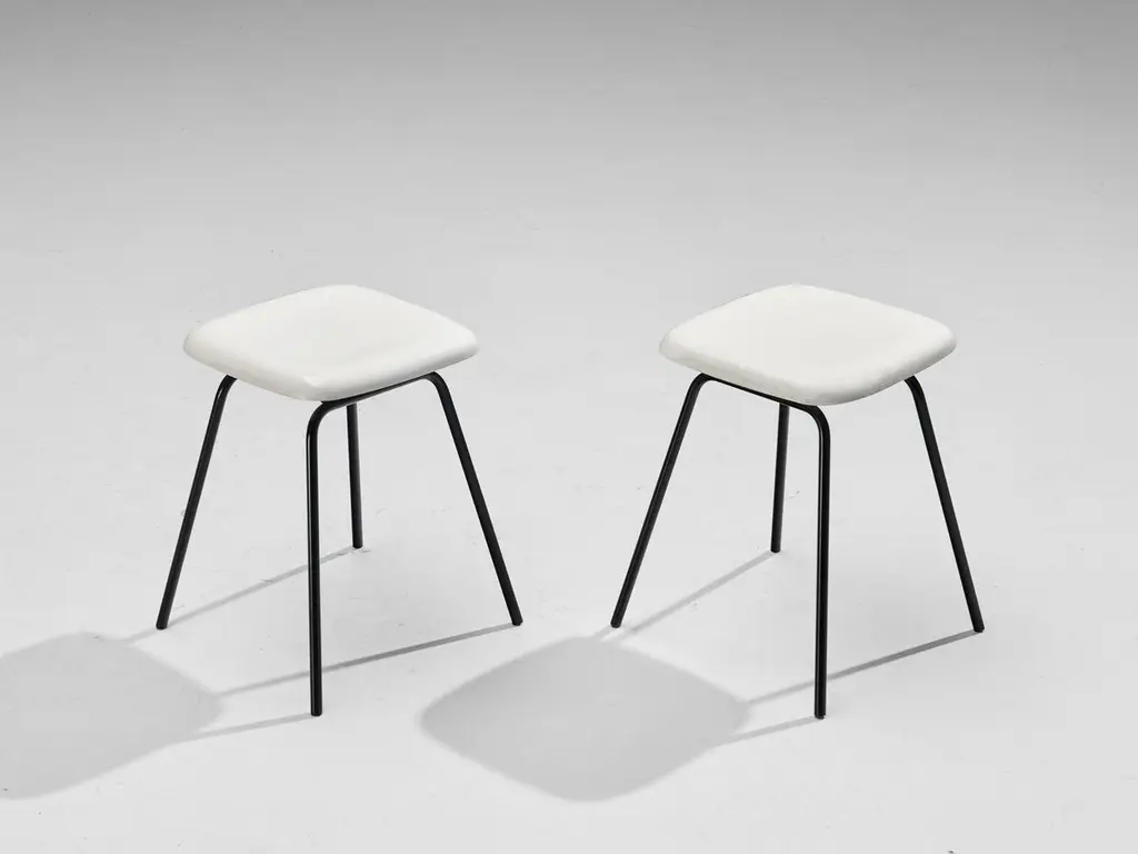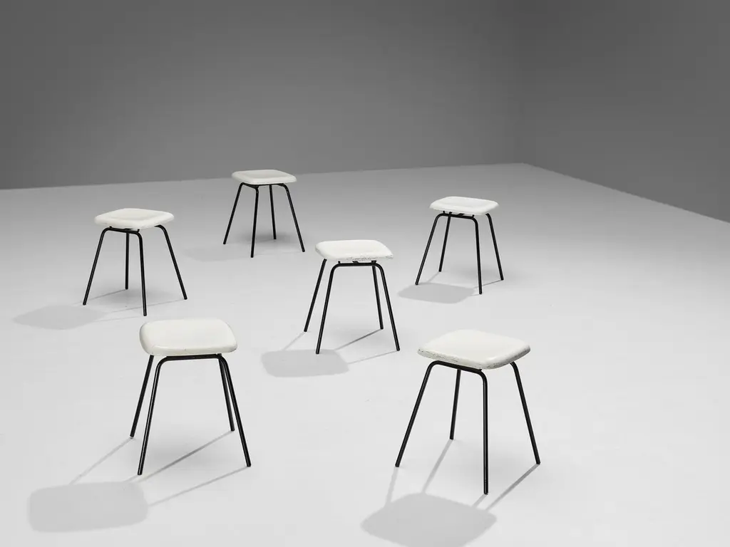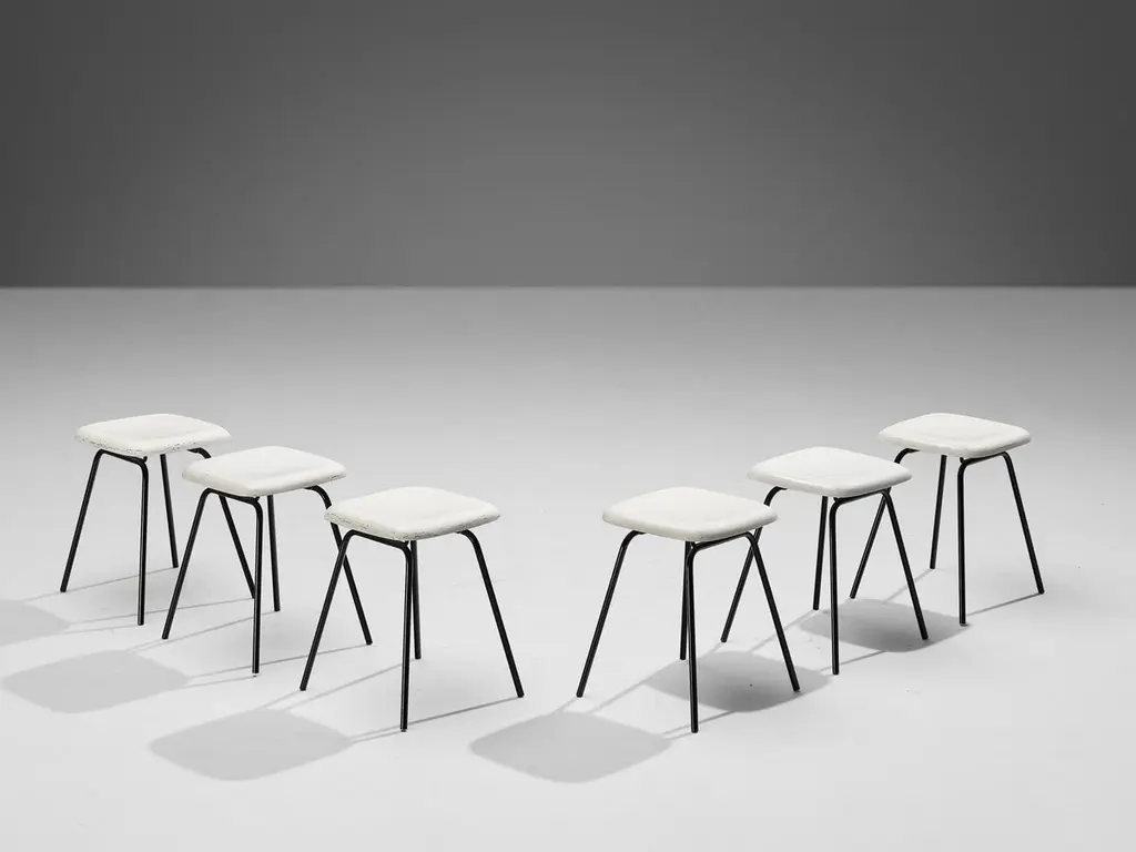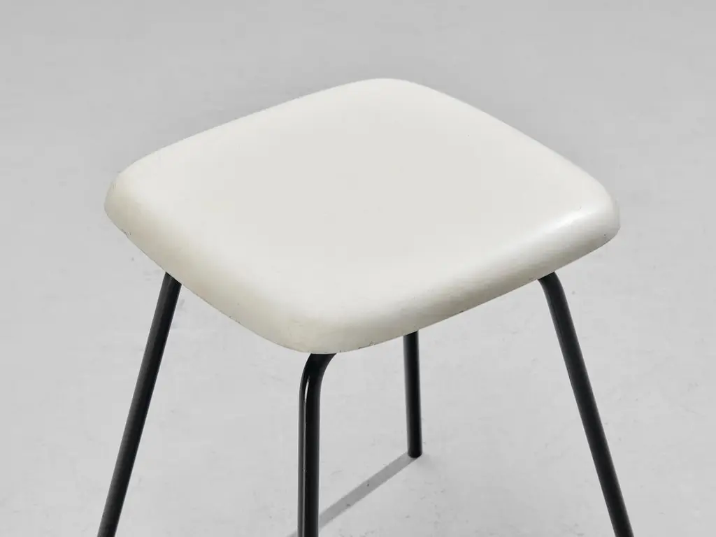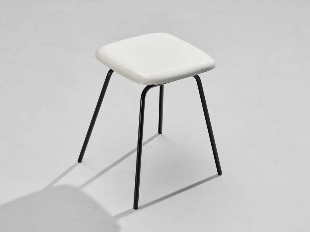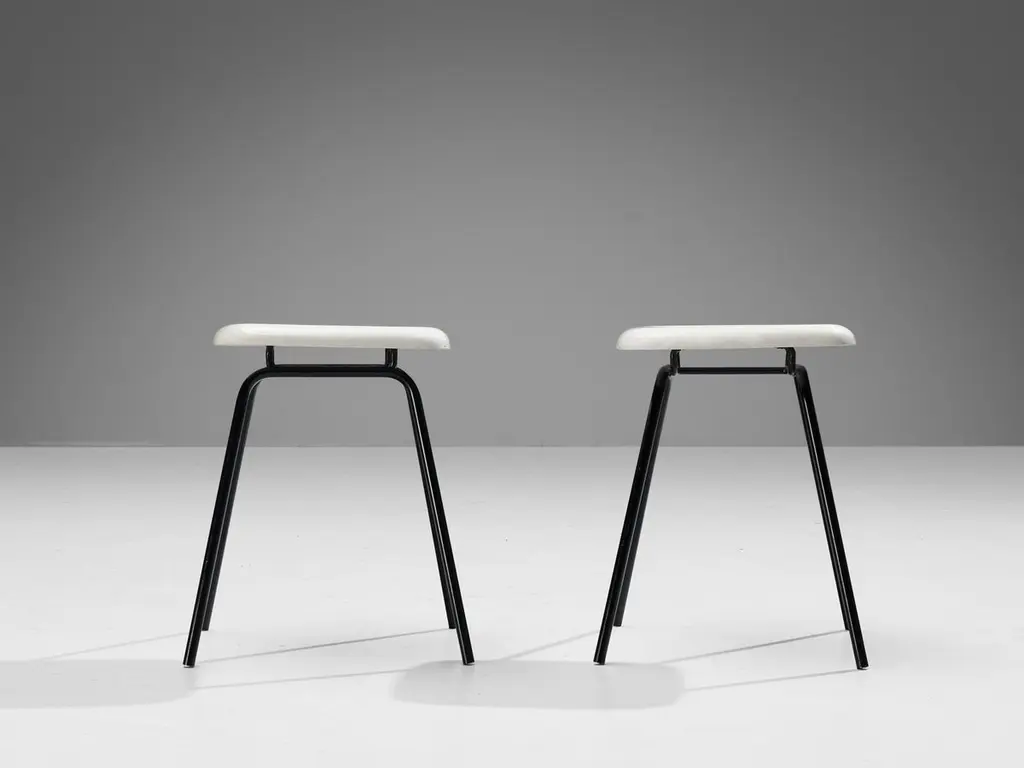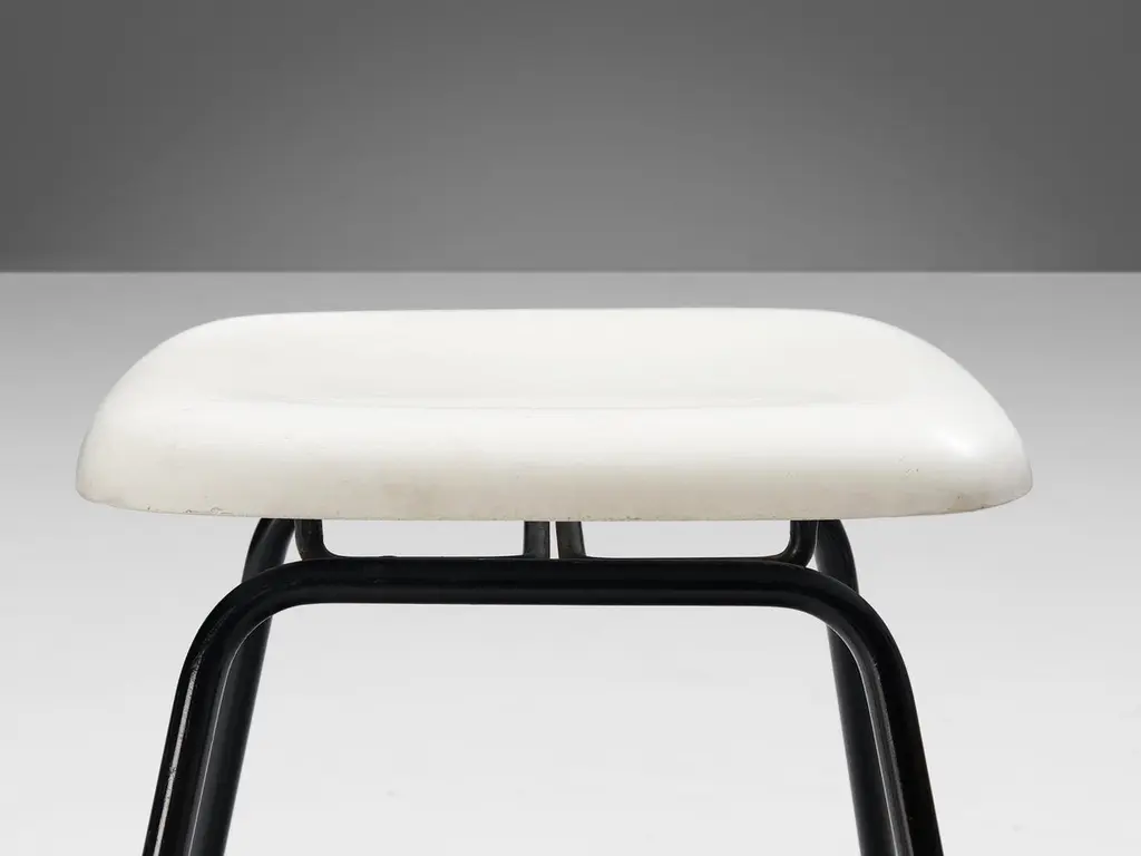 Stools or footstools, fiberglass, coated steel, Europe, 1960sThis stool embodies a minimalist aesthetic, characterized by its straightforward design with streamlined contours and basic geometric forms. The white fiberglass seat rests upon black coated tapered feet, resulting in a sleek and understated appearance. Its versatility is equally noteworthy, as it can function both as an ottoman to complement your easy chair, or as a stool to provide seating.Please note that this item contains scratches and wear. Restoration is possible before shipping by our experienced craftsman and -women in our own in-house restoration atelier. With high attention for the original, they make sure every piece retains its value and is ready for the many years to come. We kindly ask you to contact our design experts for further information about the endless possibilities our restoration and upholstery atelier has to offer. Of course, a locally organized restoration is possible as well. The listed price, is the price per item.