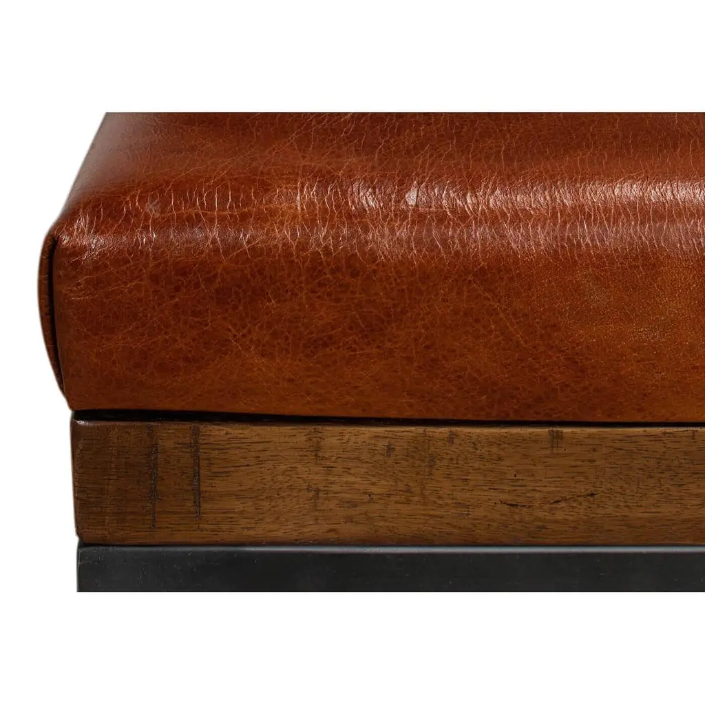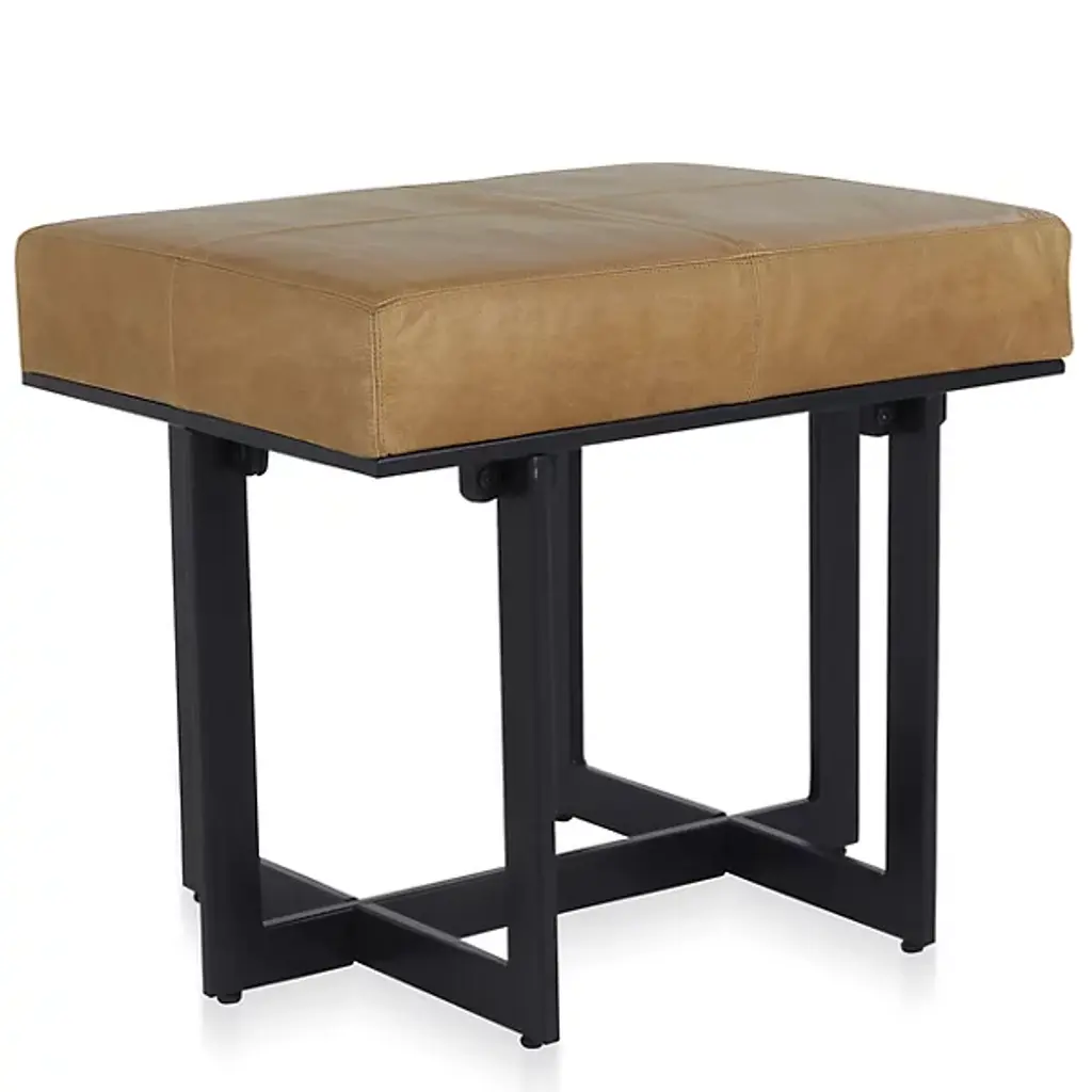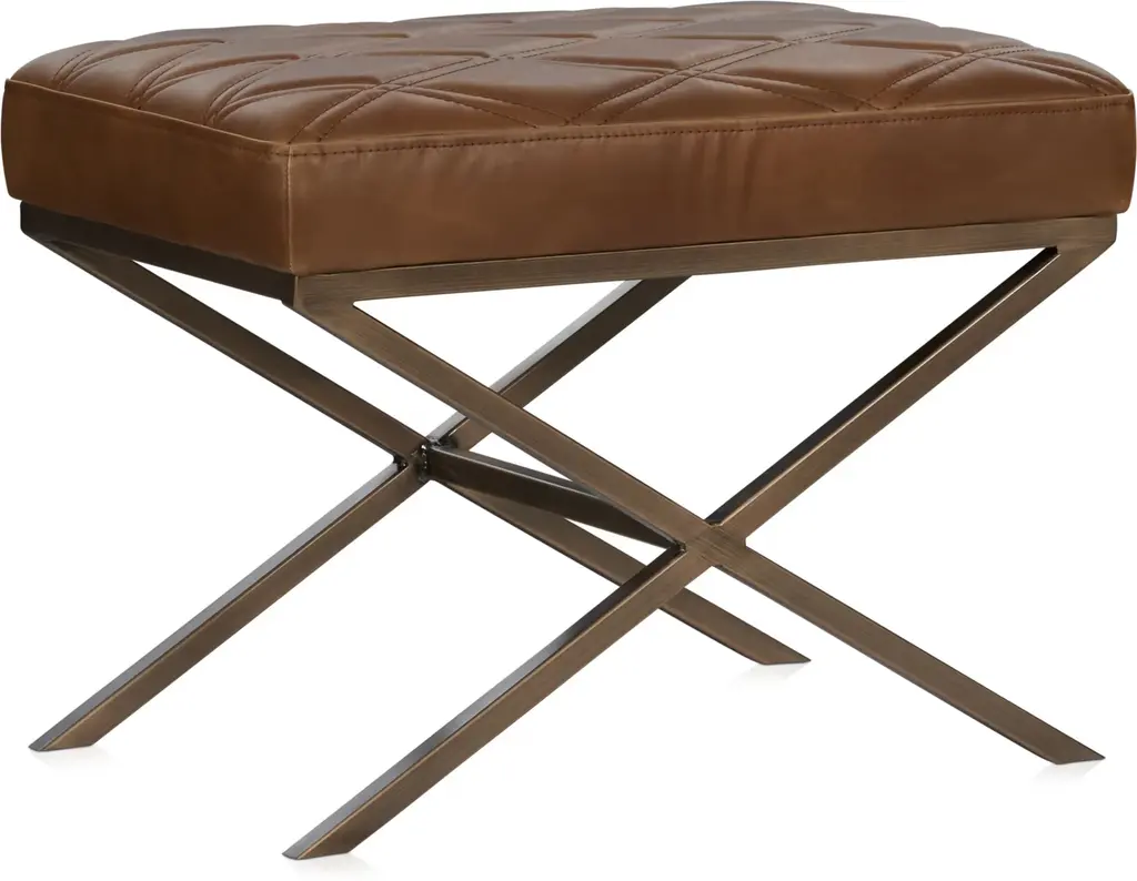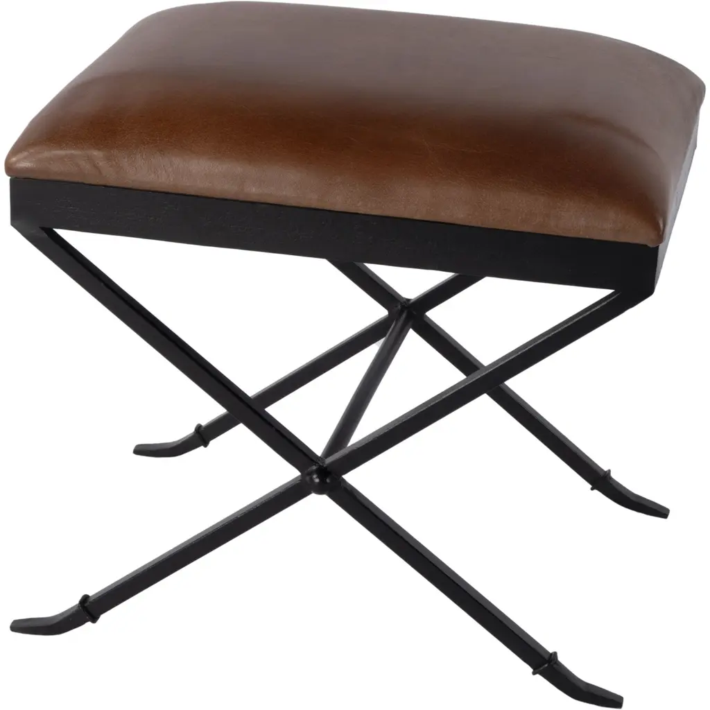 A modern tufted leather X frame stool, classic meets contemporary with this versatile piece. The top boxed cushion is crafted in rich brown leather accented with button tufting, it sits on an x shaped gunmetal frame. This piece is perfect to use as an ottoman or for extra seating. Dimensions: 22" W x 16" D x 18" HColor variation is common and acceptable on vintage-style leather.