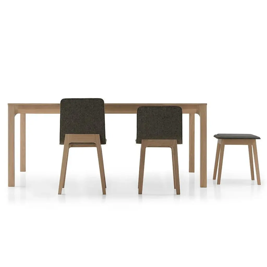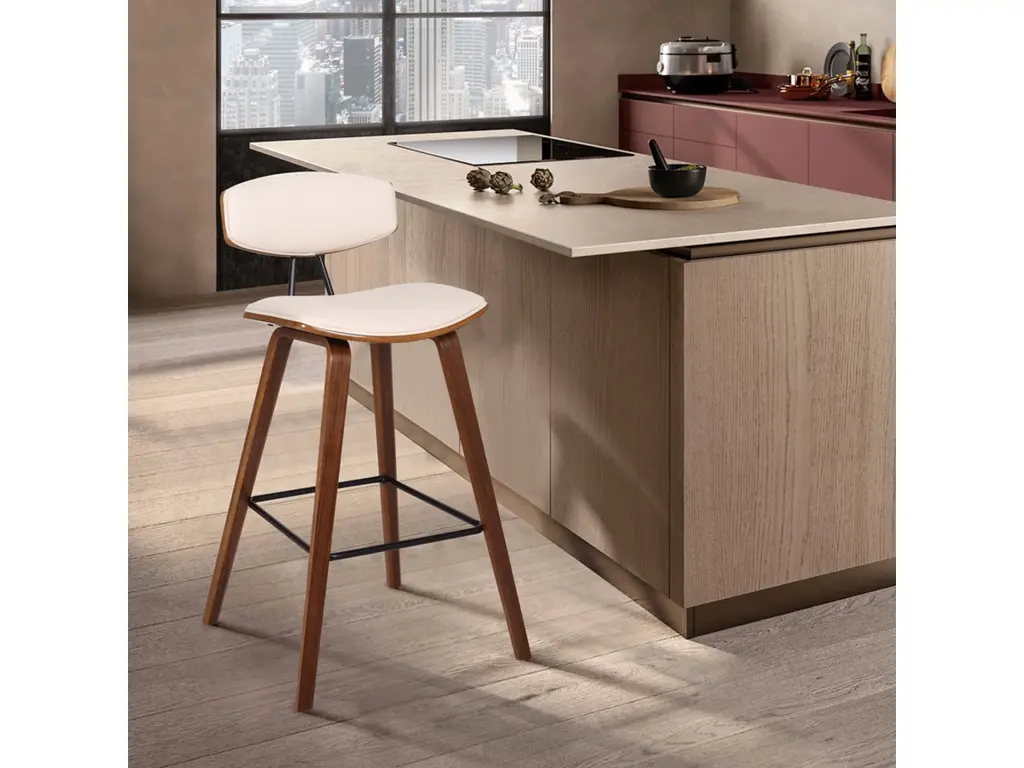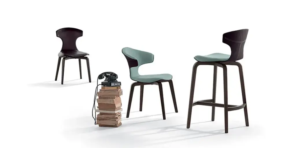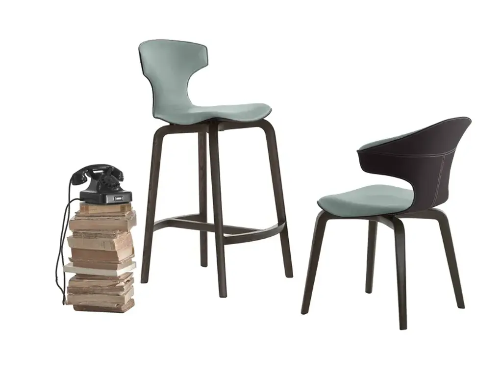 In the Montera stool the legs are raised and stand out for their cross-like structure and the gunmetal grey metal footrest at the front. The backrest is smaller, maintaining its characteristic curved shape. The same materials and finishes are employed: Pelle Frau® leather and Cuoio Saddle Extra leather, stitched together with raw-edge seam, complement each other perfectly. A version entirely upholstered in Pelle Frau® leather is also available. In this case the stitching has tone-on-tone thread.The shell of the Montera stools is produced from moulded steam-curved and -pressed beech plywood with padding in polyurethane foam. The base is in wenge- or moka-stained solid ash wood. The stools have plastic caps and a little piece of sheet metal with gunmetal grey finish to protect the top of the footrest. The Montera column stool can be rotated 360° and its height can be adjusted thanks to a gas spring controlled by a chrome steel lever positioned underneath the seat. The base, in chrome steel, is made up of a four-bracket cross plate, a column, a footrest and a round plate. The cross plate, with black nylon spacers, fixes the shell to the base. The tubular footrest has a distinctive knurled finish with diamond motif. The upper part of the column (above the footrest) is upholstered with Cuoio Saddle Extra leather or Pelle Frau® leather to match the upholstery of the shell.The Montera series designed by Roberto Lazzeroni has a formal lightness that expresses the sensory charm of its materials: the raw cut processing exalts the tactility of the saddle-leather and leather which, combined together, complement each other perfectly; the light stitching on the backrest forms a smile. Montera is a chair, an armchair, a stool of two different heights, a column stool and a stackable chair.