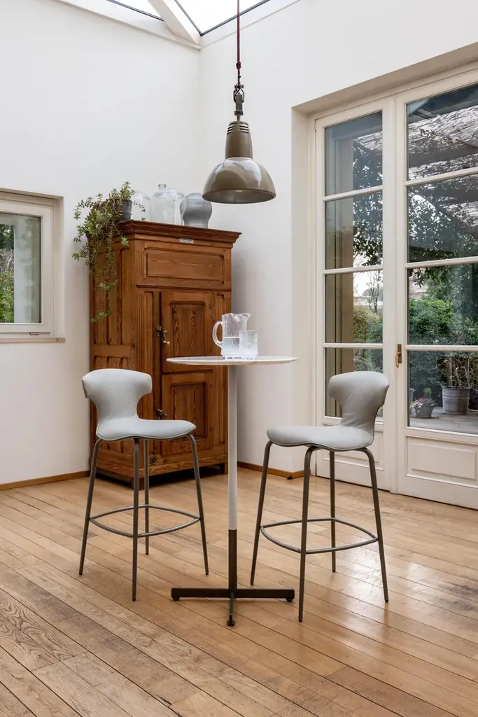 Formal lightness and a sensation of softness describe the “extra-soft” dining seatings of the Montera collection, designed by Roberto Lazzeroni. In a perfect balance between comfort and design, Montera Mas emphasizes the organic, sinuous lines of the seat and the characteristic wings of the backrest that hug the body with increased cushioning and an enveloping support.The Montera Mas stool, upholstered in Pelle Frau® leather or removable fabric, is available in two heights and is marked by the softness of the seat, made of polyurethane foam. The metal base is composed of tubular steel legs, available in multiple finishes. The legs are connected by a footrest ring in the same finish as the base and equipped with a brushed stainless steel scratch guard plate.The Montera series designed by Roberto Lazzeroni has a formal lightness that expresses the sensory charm of its materials: the raw cut processing exalts the tactility of the saddle-leather and leather which, combined together, complement each other perfectly; the light stitching on the backrest forms a smile. Montera is a chair, an armchair, a stool of two different heights, a column stool and a stackable chair.