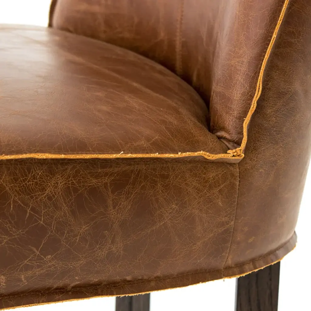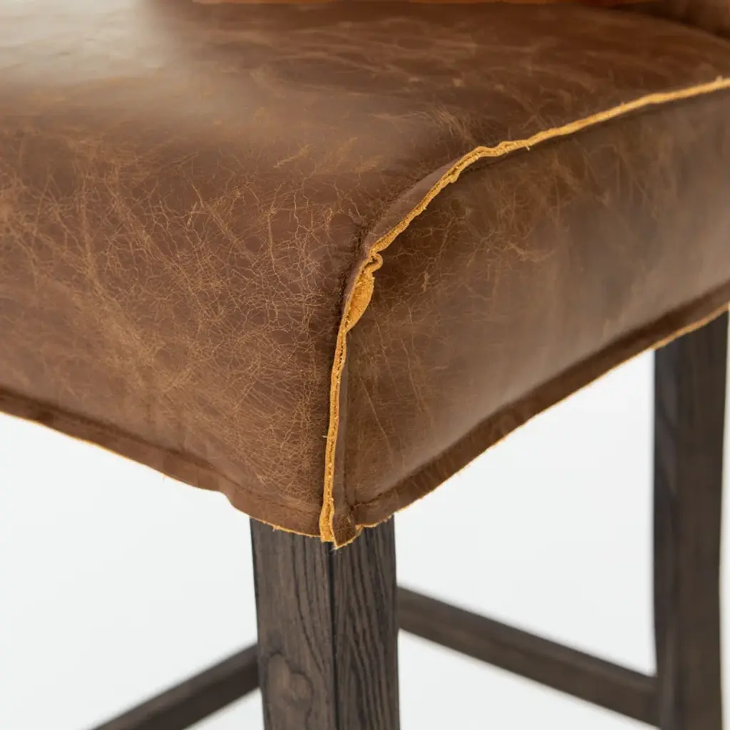 Elevate your home bar or kitchen island with this full-back stool, boasting a solid wood base in a warm brown finish. The genuine leather upholstered seat is filled with foam and synthetic fiber for a cozy feel, while the natural wood grain and knots add a touch of rustic charm. This stool features a footrest for added comfort, and is designed for residential use with a weight capacity of 250 lbs. To keep it looking fresh, simply wipe clean with a damp cloth and avoid abrasive cleaners.