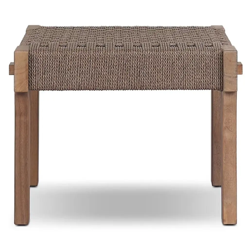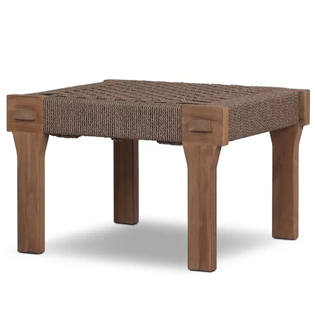 The Moxie Outdoor Accent Stool from Four Hands combines FSC-certified teak framing with polyethylene weaving inspired by Indonesian furniture traditions. The frame features pull-through details where members intersect throughout the structure. Artisans weave each strand through frame openings, creating geometric patterns that form the seating surface. Traditional joinery accommodates wood movement without metal hardware requirements. This approach honors centuries-old Indonesian techniques while meeting modern outdoor performance needs. The weaving provides both comfort and support for extended use.