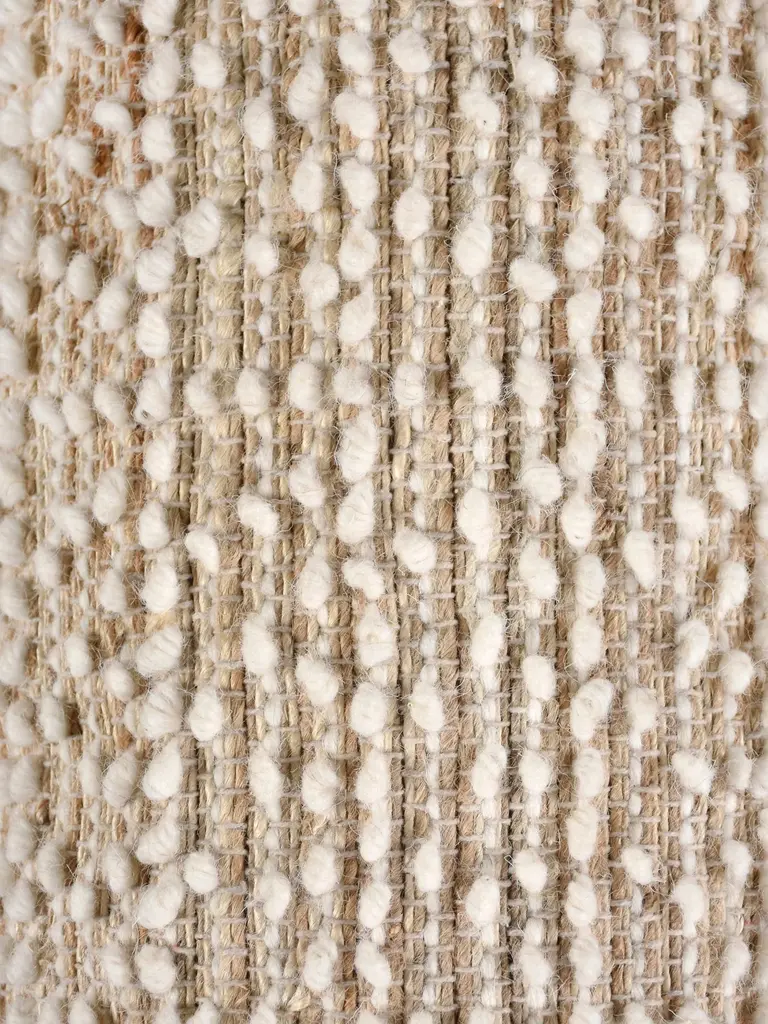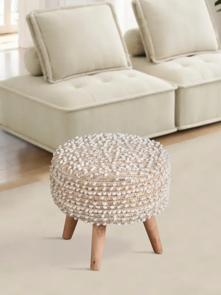 The versatile Natural Boucle Handwoven Oversized Stool offers both flexibility and comfort, serving as a stylish chair at a table or providing extra seating in a living room. Each intricate pattern is meticulously handwoven by skilled artisans using a traditional weaving loom. Crafted with Handwoven Jute Blend fabric, supported by rounded Mango Wood legs, and featuring plush foam padding, this stool arrives fully assembled. Size: 20"W x 20"L x 19" H Material: 50% Jute, 40% Wool, 10% Cotton, Mango Wood, MDF, Foam. Jute Blend fabric is wrapped around the stool. Mango Wood legs. Color: Beige Color Details: Beige with Ivory yarns. Made in India. Handwoven and Made in India by local artisans. Ships pre-assembled.