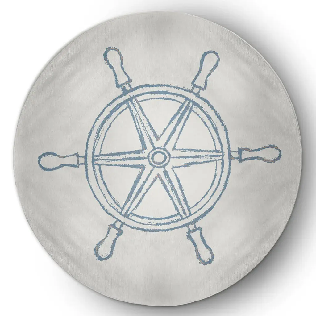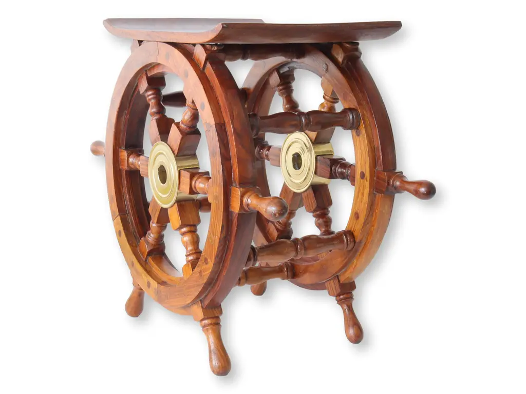 Discover a masterpiece born from nautical allure and ingenious design. This table, skillfully constructed from two ship's wheels, showcases a custom-honed granite top. Flip it one way, and it transforms into a stool; another flip (minus granite) and it's a magazine holder. With the granite slab, it stands proud as a durable side table. A versatile gem that marries maritime history with modern function.