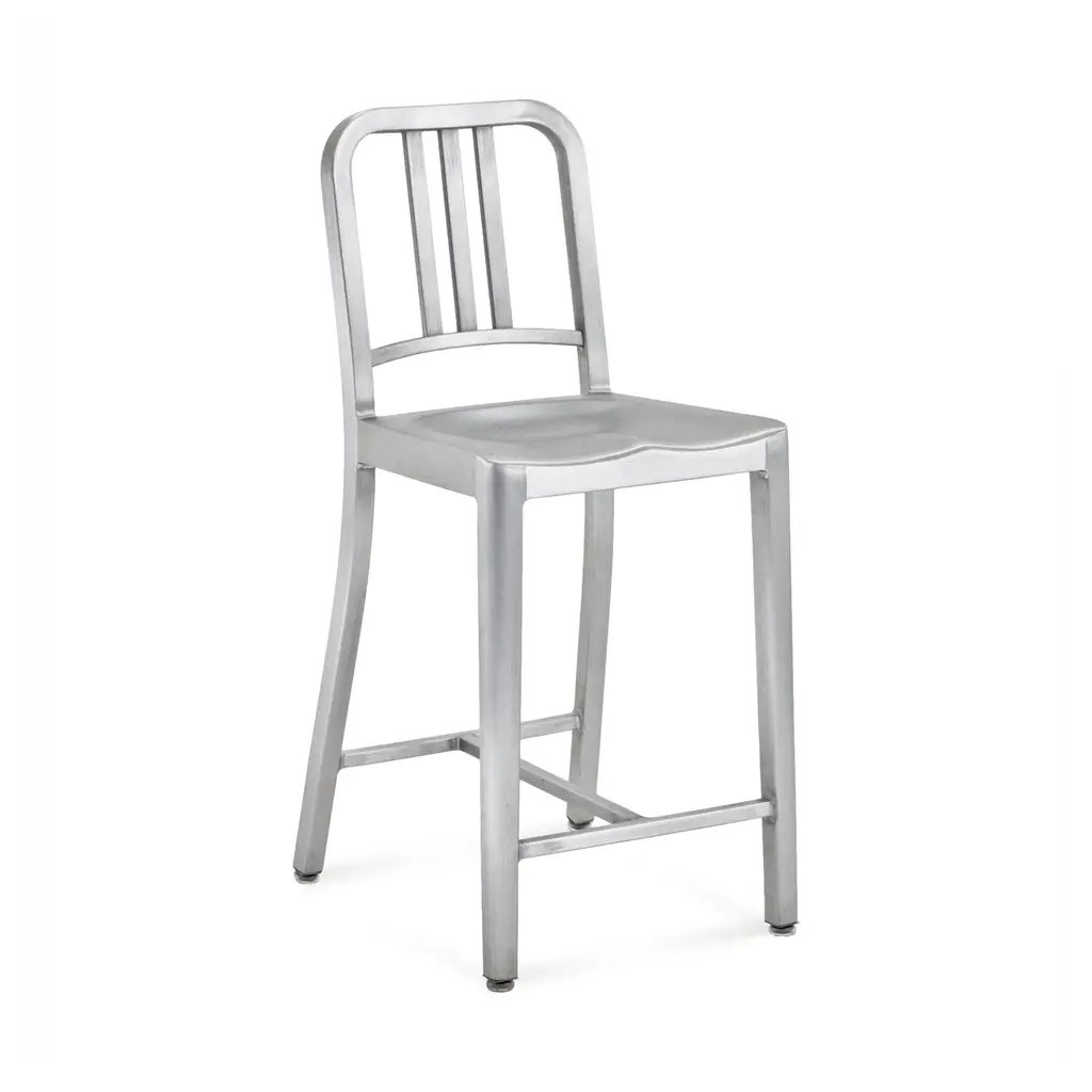 Experience timeless elegance and superior craftsmanship with the Navy Stool from Emeco. Originally designed for use on submarines in 1944, this stool version of a modern furniture classic boasts a legendary 77-step process and is hand-formed from recycled aluminum. Its classic anodized finish makes it a durable and stylish addition to any space, while its optional seat pads provide additional comfort and a hint of contrasting color. Highlights