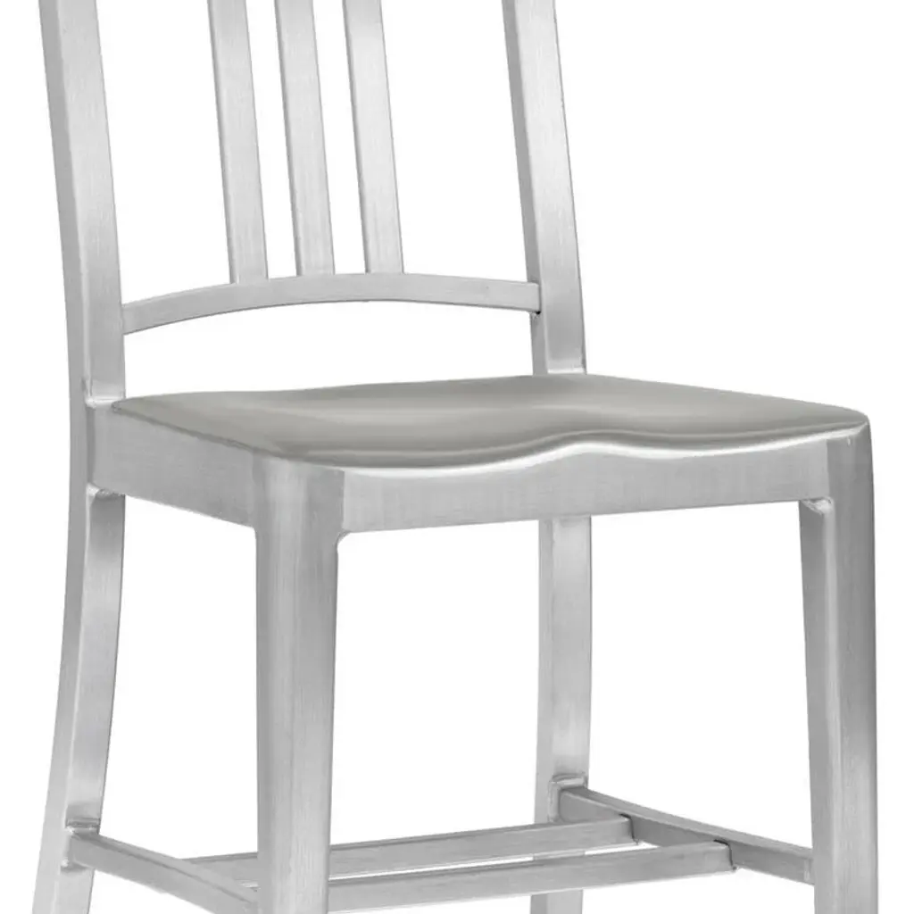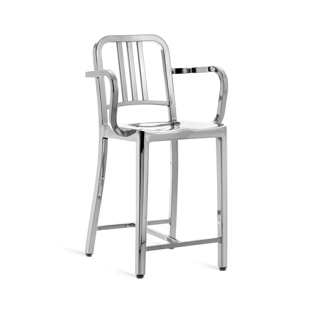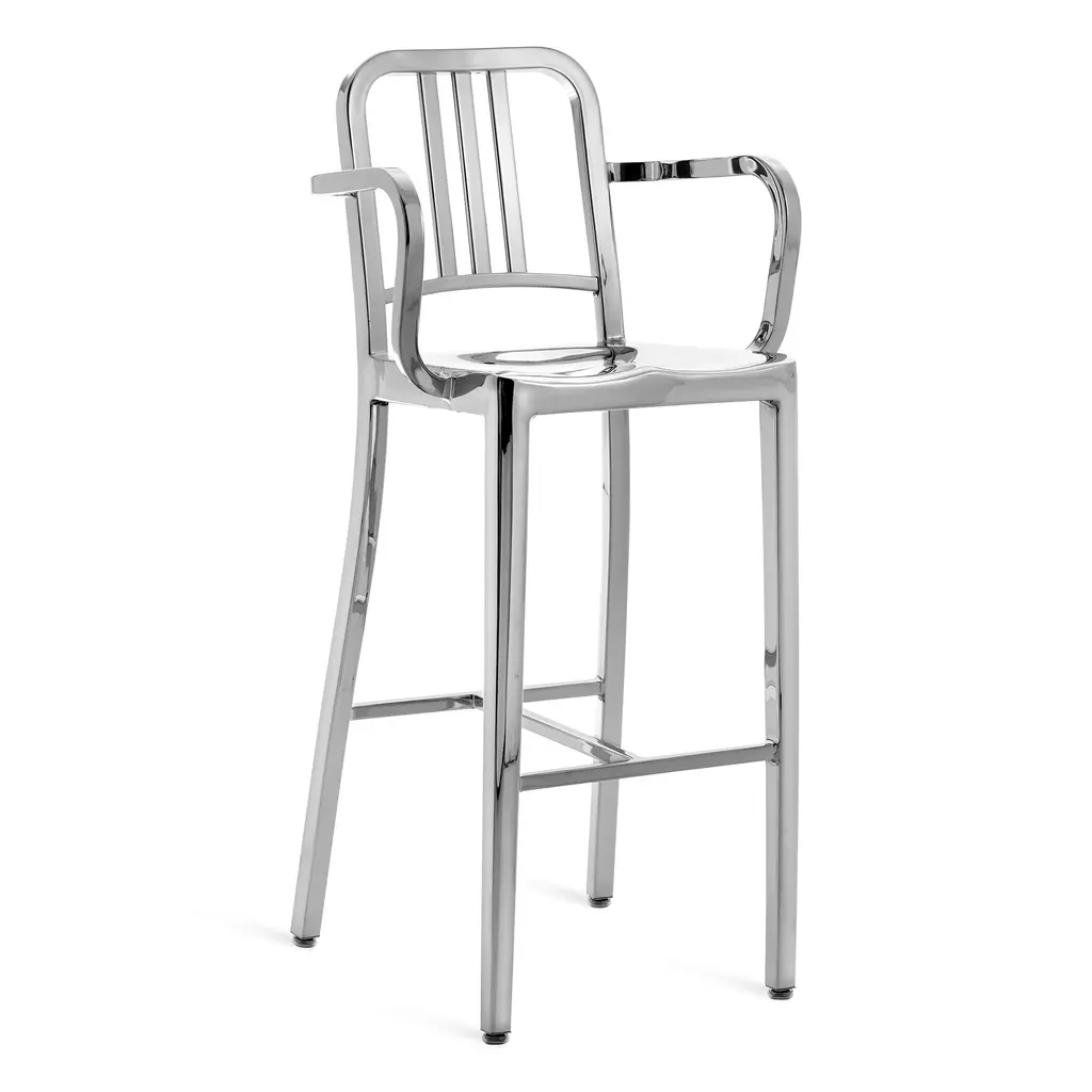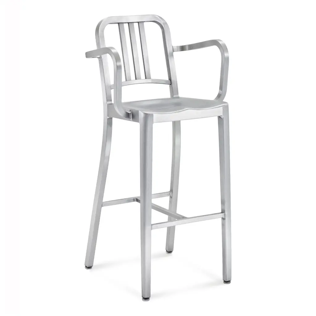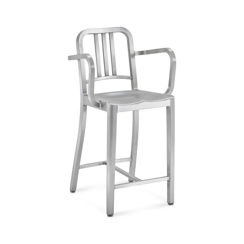 Bring a piece of history into your home with the Emeco Navy Stool with Arms from Emeco. Originally created for submarines, this modern classic is crafted using a signature 77-step process resulting in a chic stool that's built to last. Made from recycled aluminum, it's not only durable but also environmentally friendly, its sleek silver finish, the perfect complement to any contemporary bar or countertop. Highlights