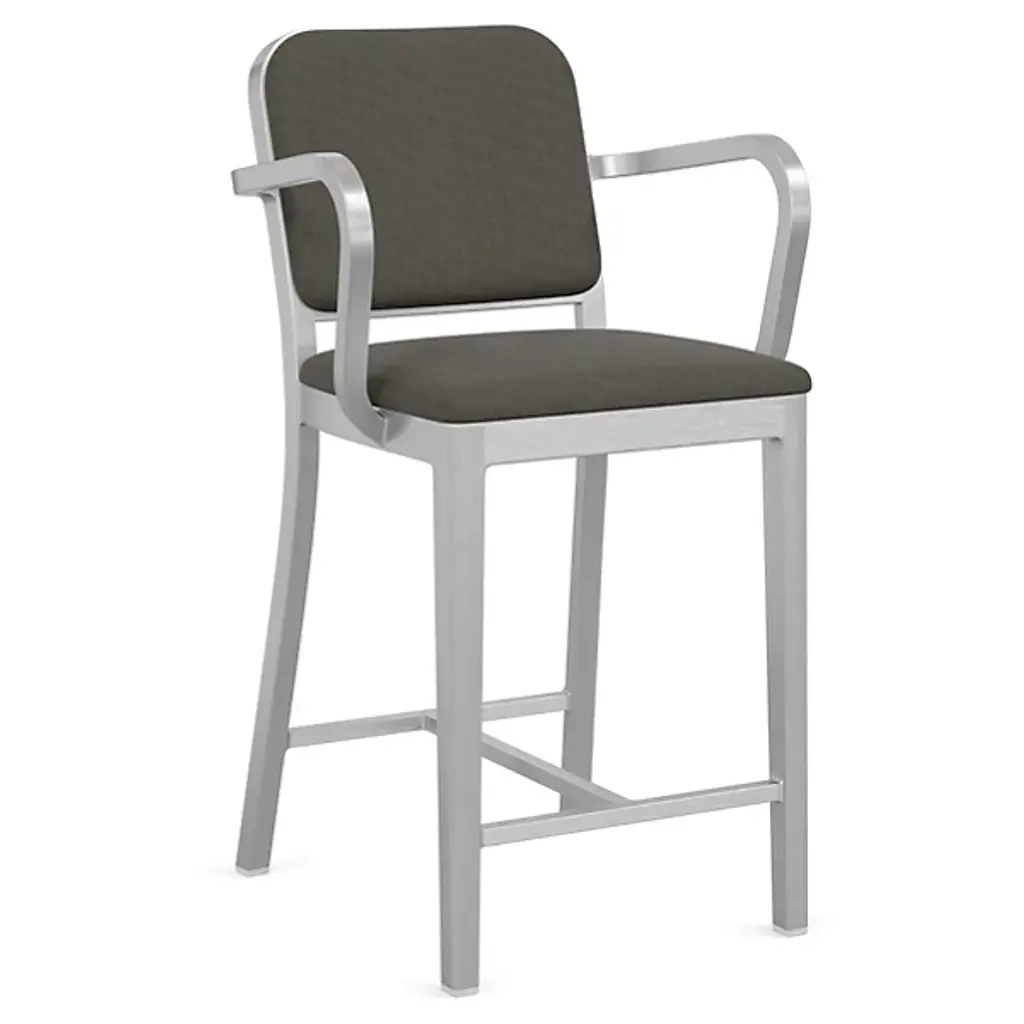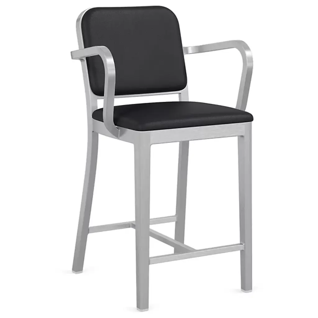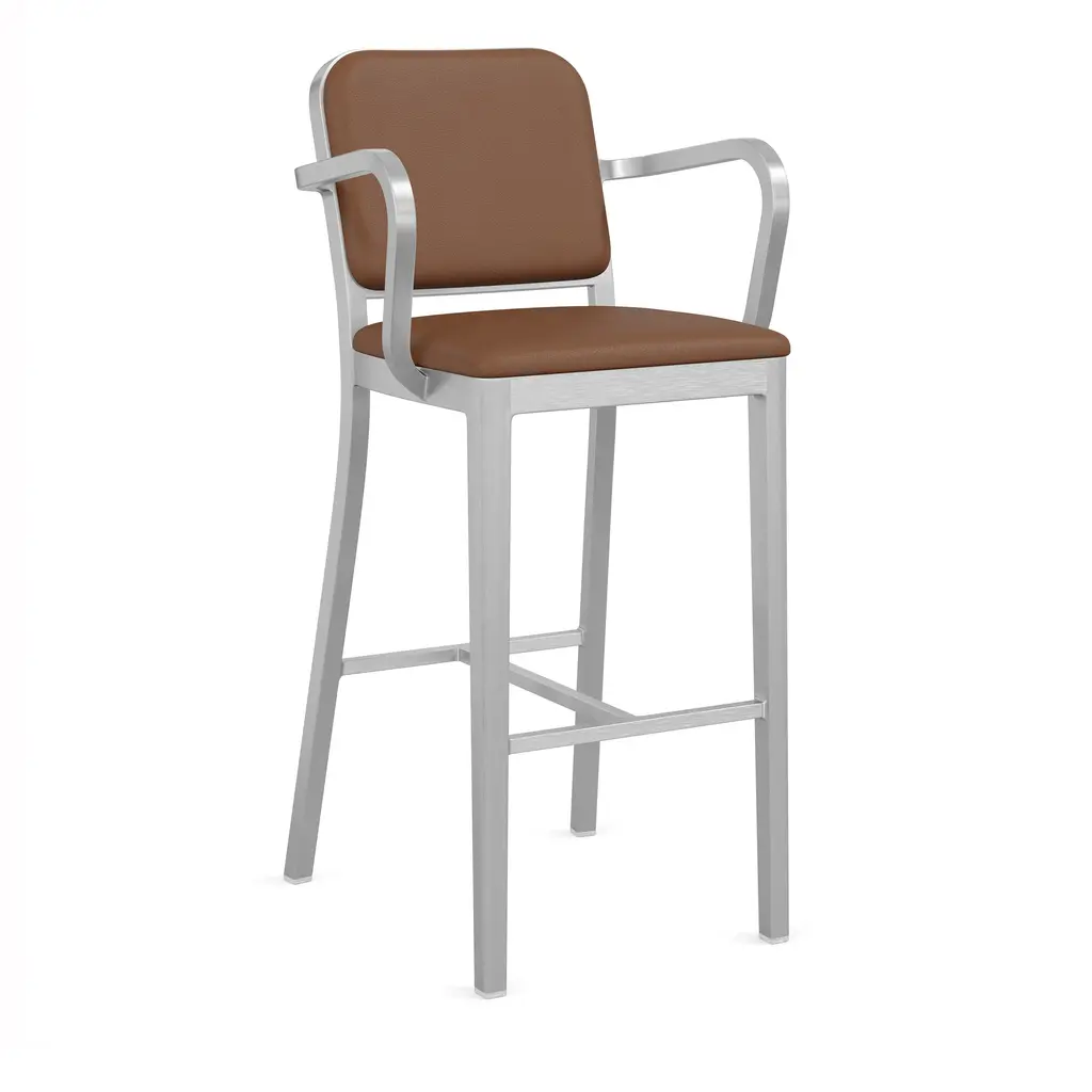 Enhance your indoor seating experience with the Navy Officer Stool with Arms from Emeco. Designed by Jasper Morrison, this modern update to Emeco's classic collection offers comfort and style with a hand-brushed aluminum or black powder coat finish and rich fabric and leather upholstery options. Crafted from recycled aluminum, this durable dining stool is built to last. Highlights